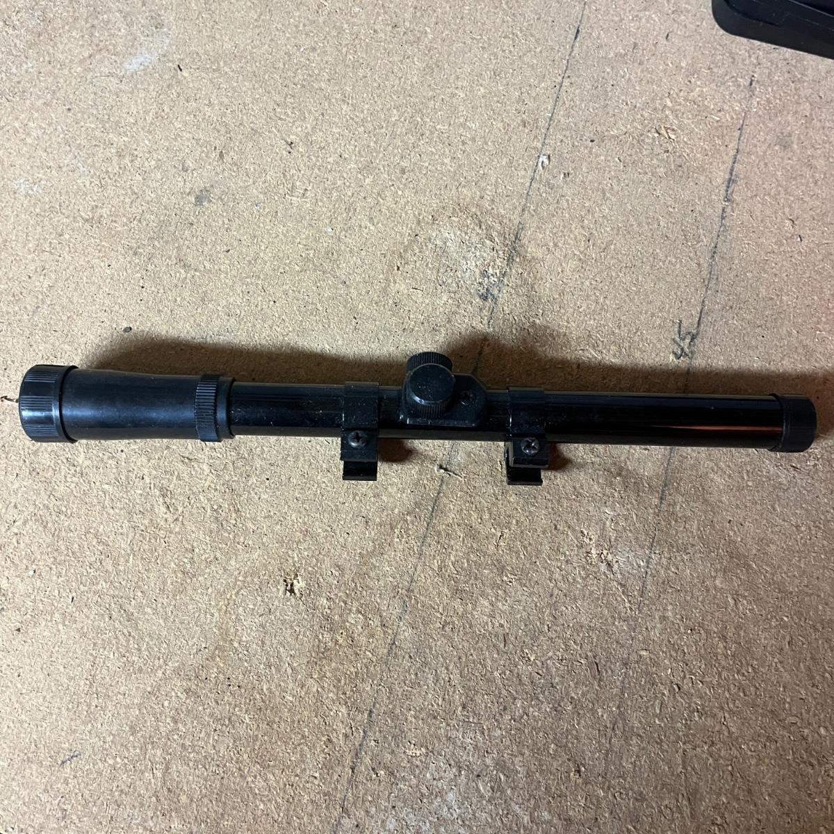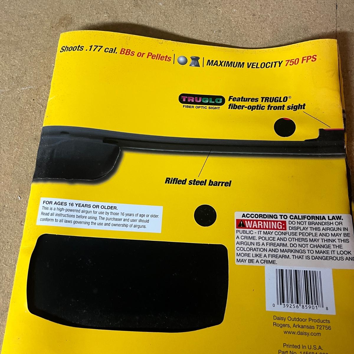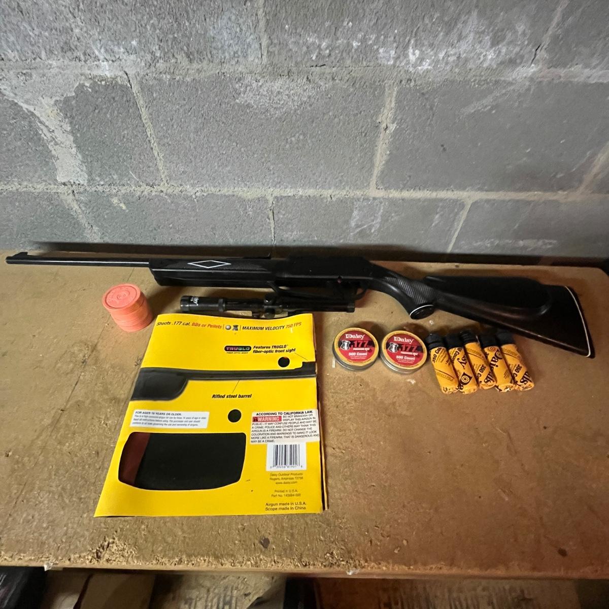 Lot includes a Daisy BB and pellet gun with scope. Also includes five packs of BBs, two packs of pellets and four packs of targets. Gun measures 7” x 2.5” x 37” long.