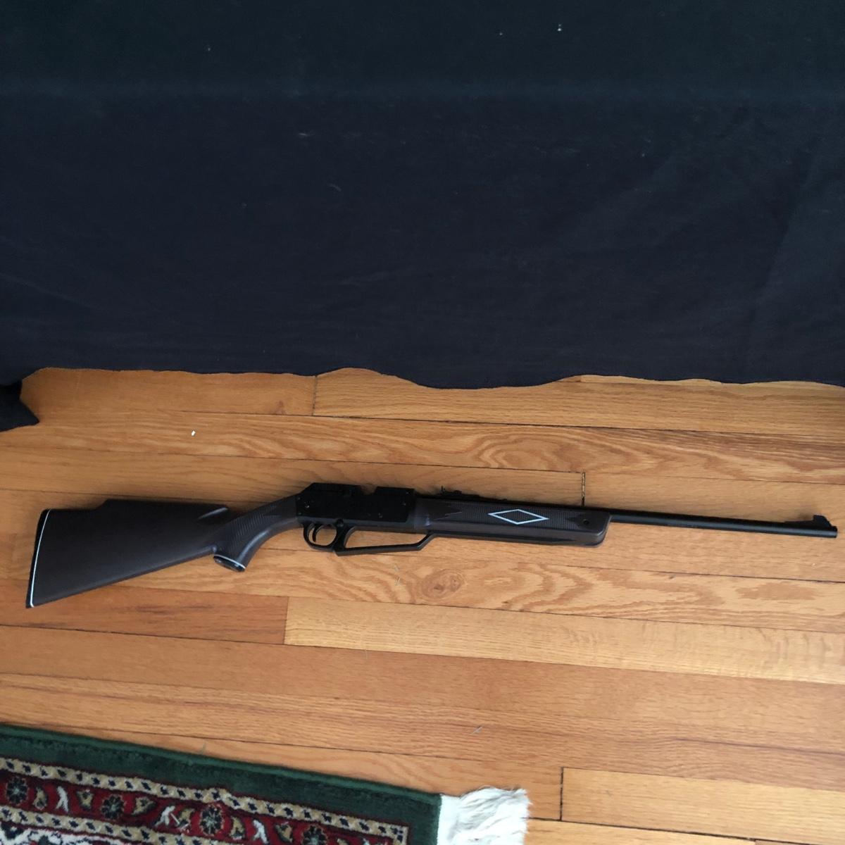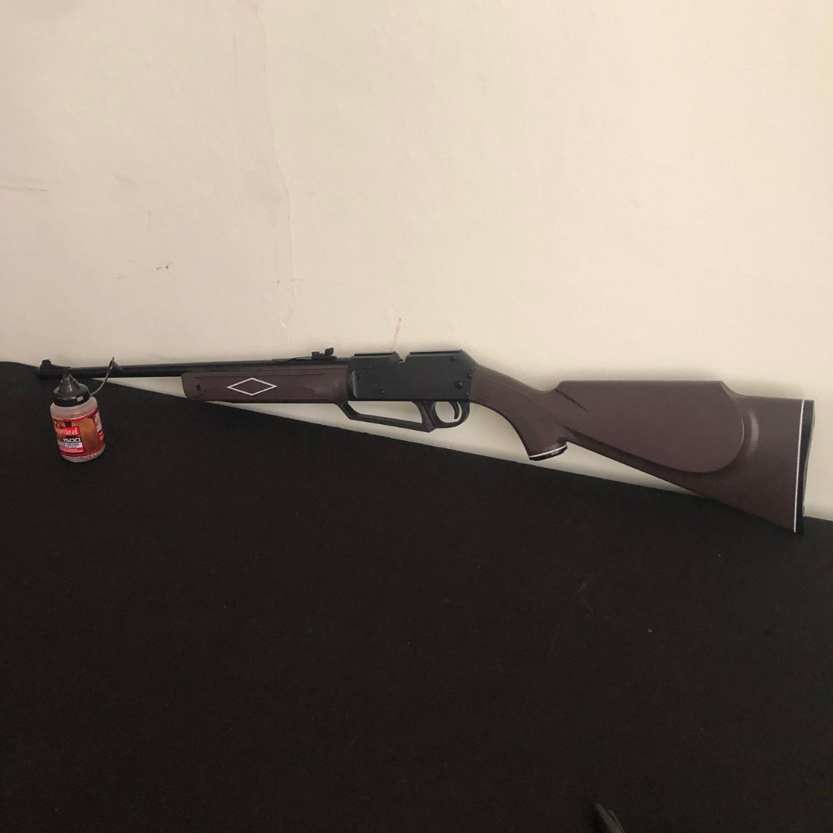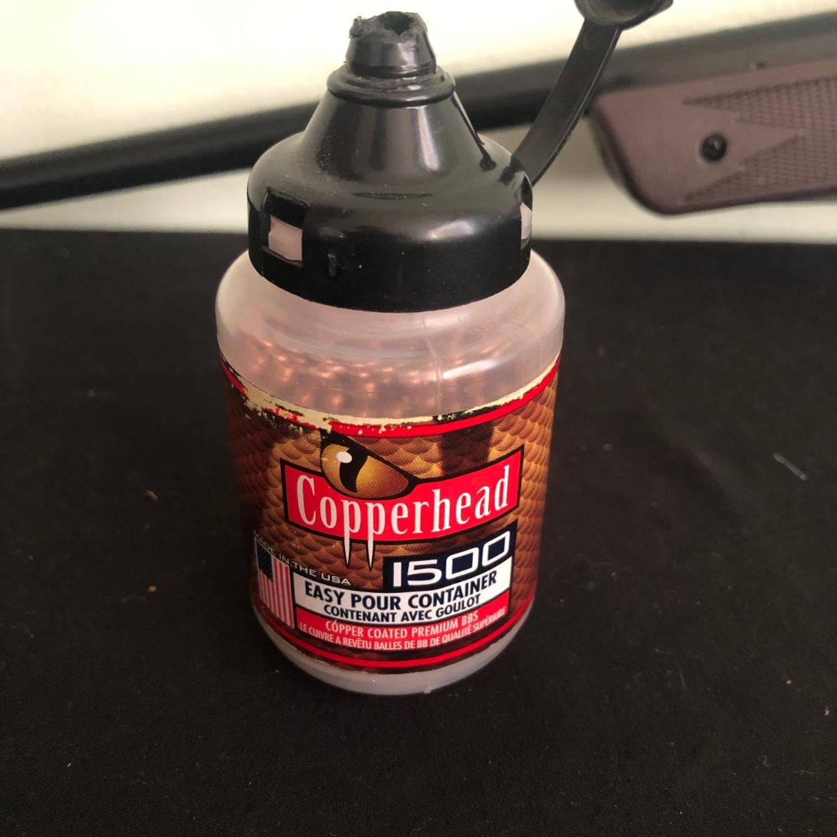 This lot includes one Daisy Gun and a container of Copperhead BBS. The BB gun has a plastic stock and hand grip. The gun is almost 38” long. Local pick up only.
