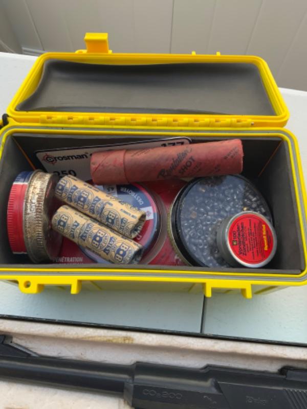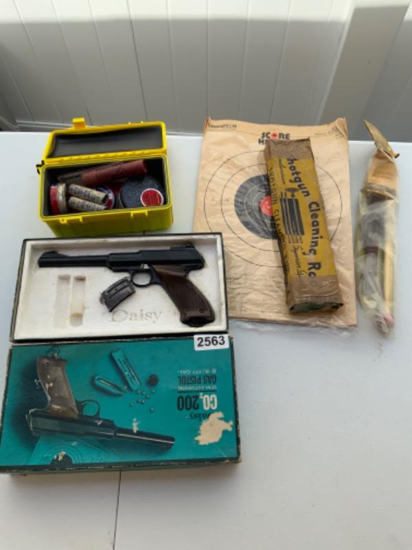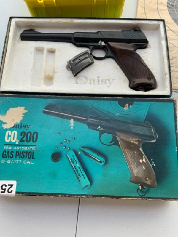 Daisy CO2 Semi automatic gas pistol. BB gun, box of BBs, cleaning rod, target sheets, dryer lot 2563