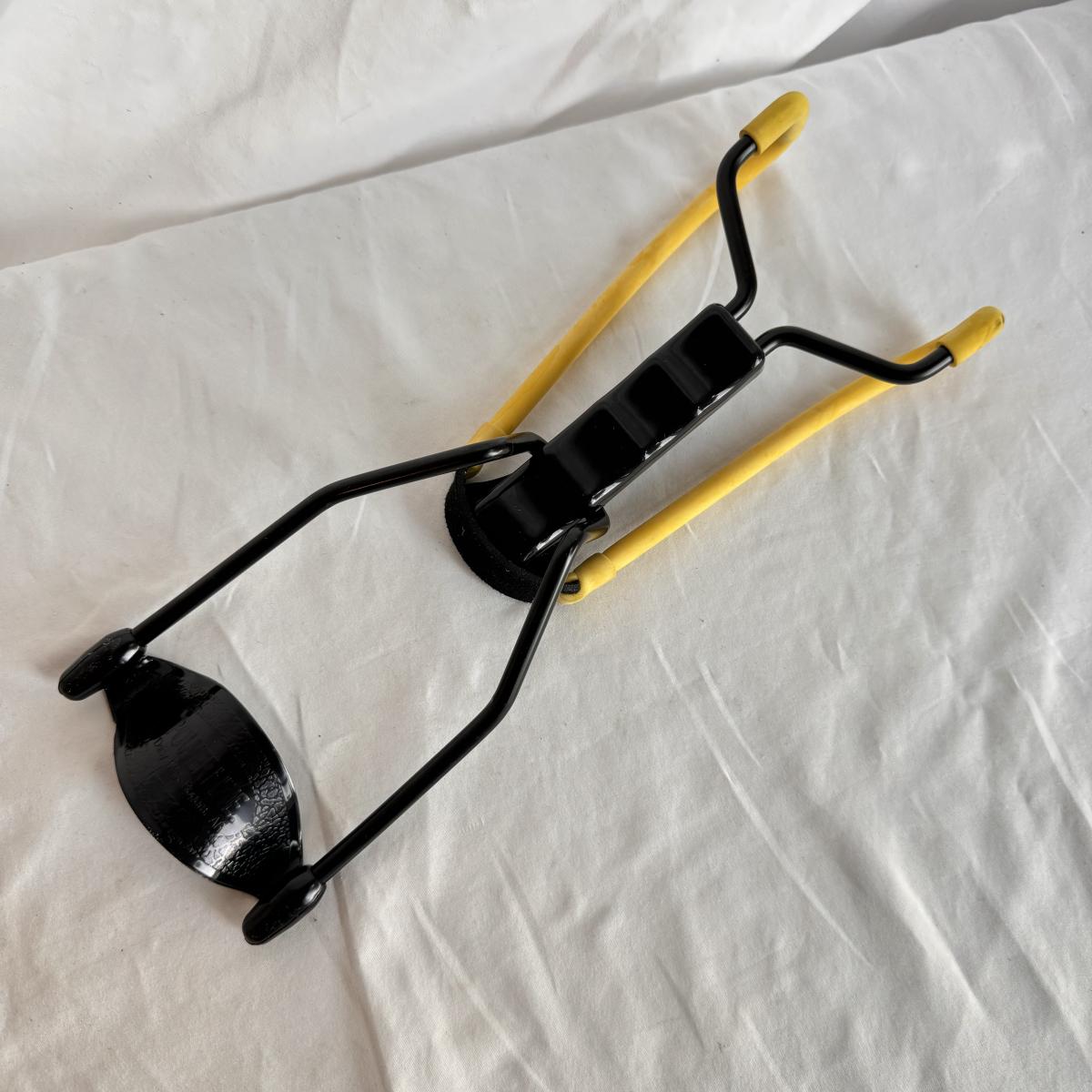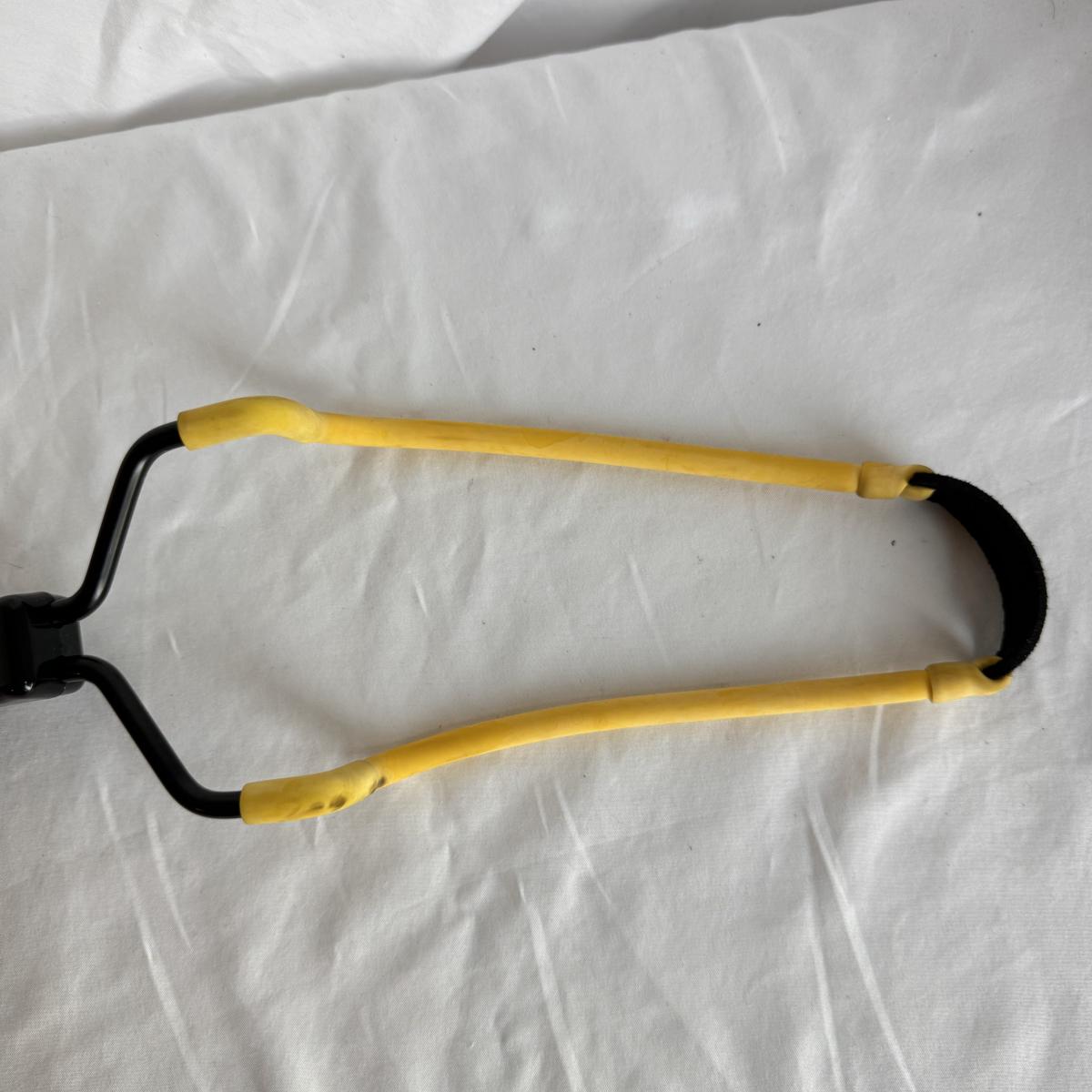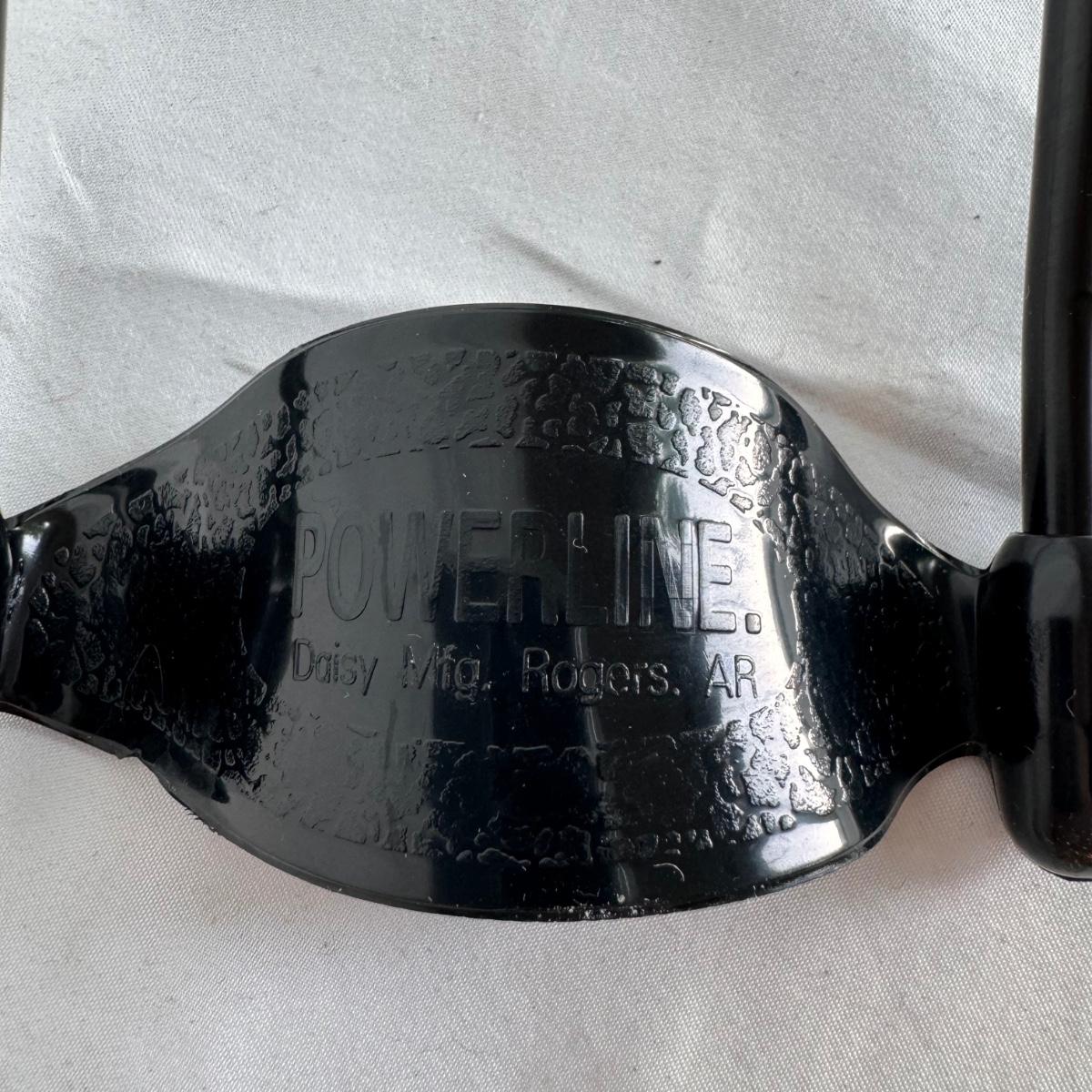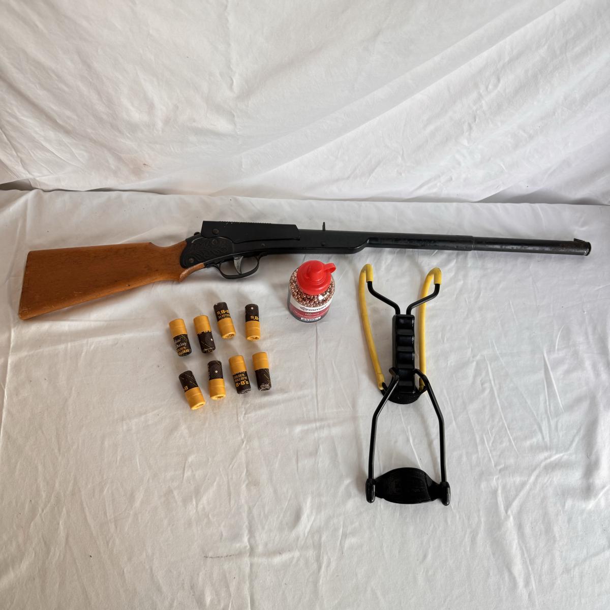 This lot includes one Daisy model 106 BB gun, one sling shot that reads “Powerline” and “Daisy Mfg Rogers. AR,” and several copper coated steel BBs. The BB gun measures 30” x 3”H.