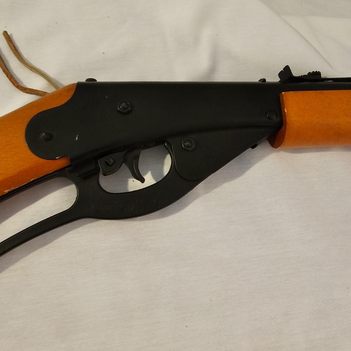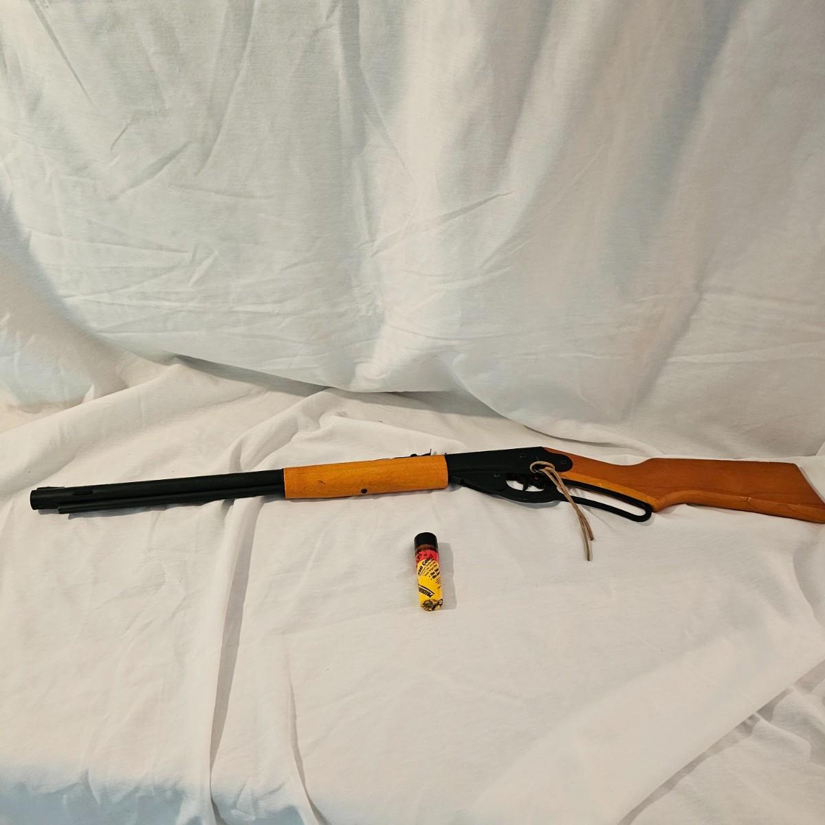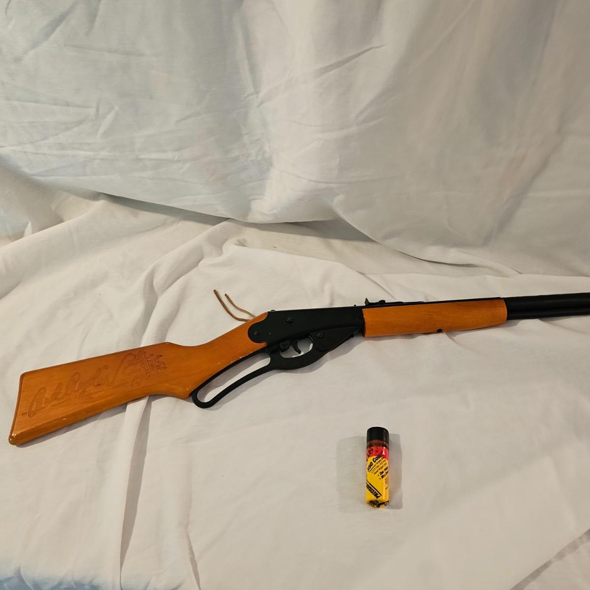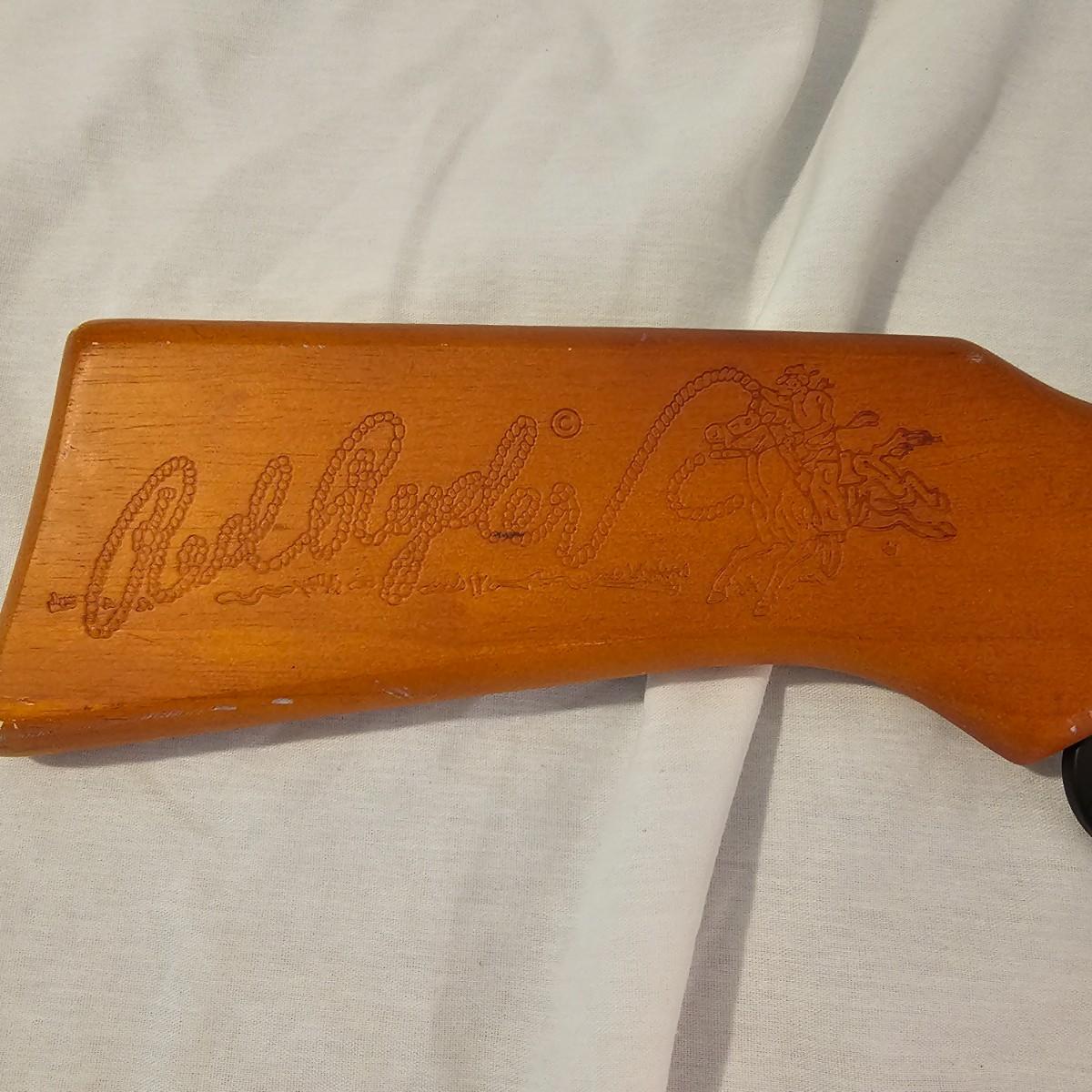 The classic Red Ryder BB gun from Daisy. Officially the Model 1938B, this item has maple colored stock and foregrip, a safety and the signature leather lanyard. Red Ryder and logo stamped into right side of stock. Gun measures 36" x 4.5"H. Includes one tube of Daisy premium BB's. See photos for details. Local pickup only.