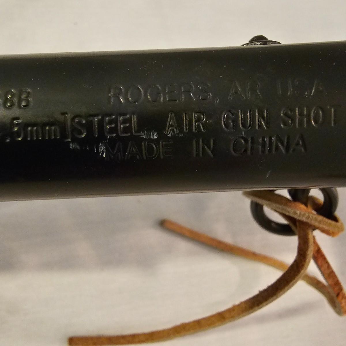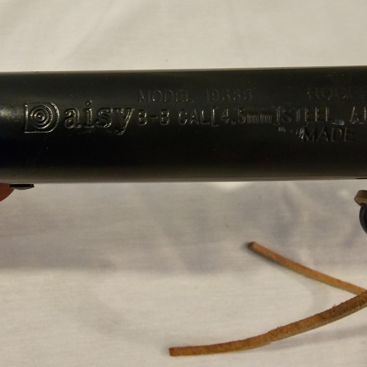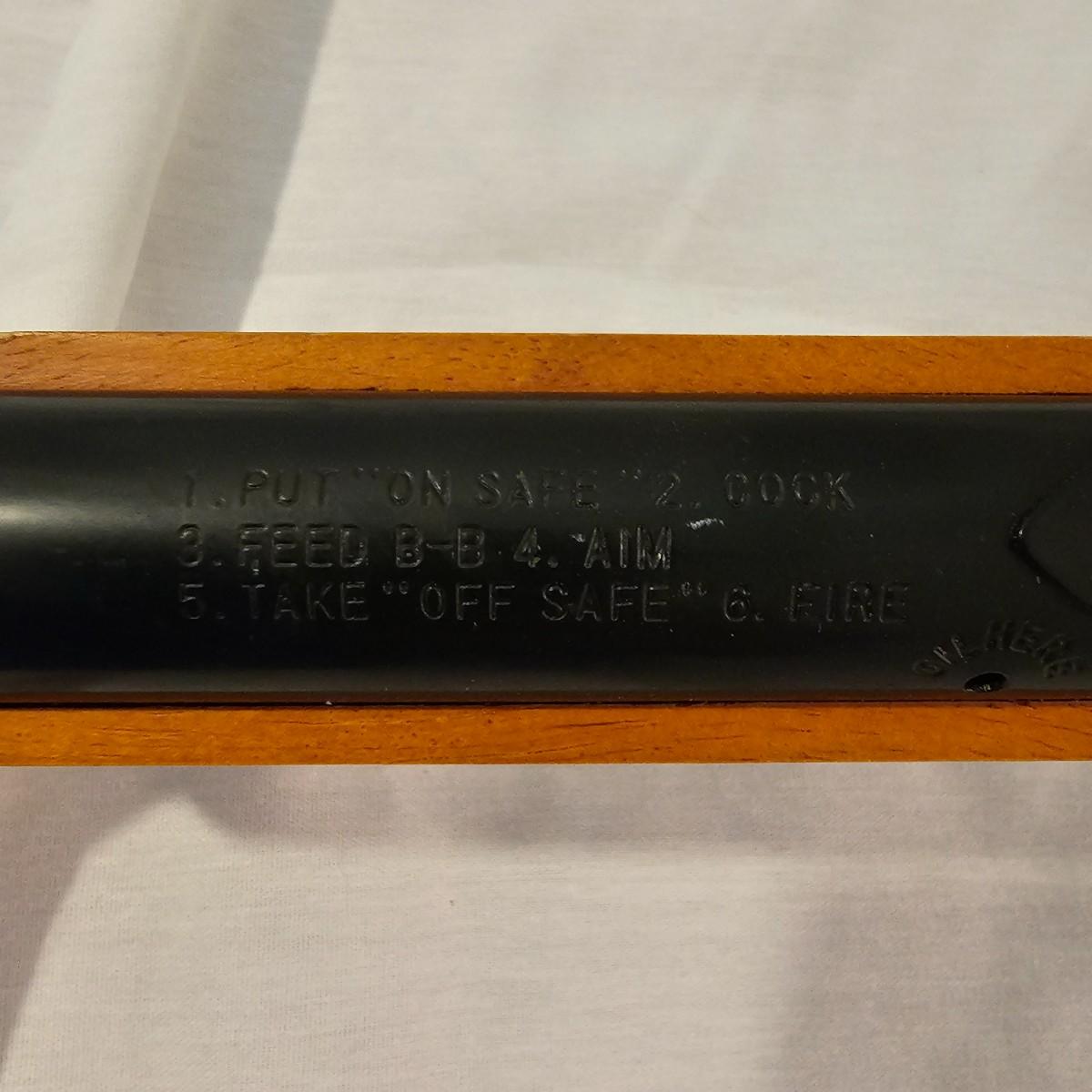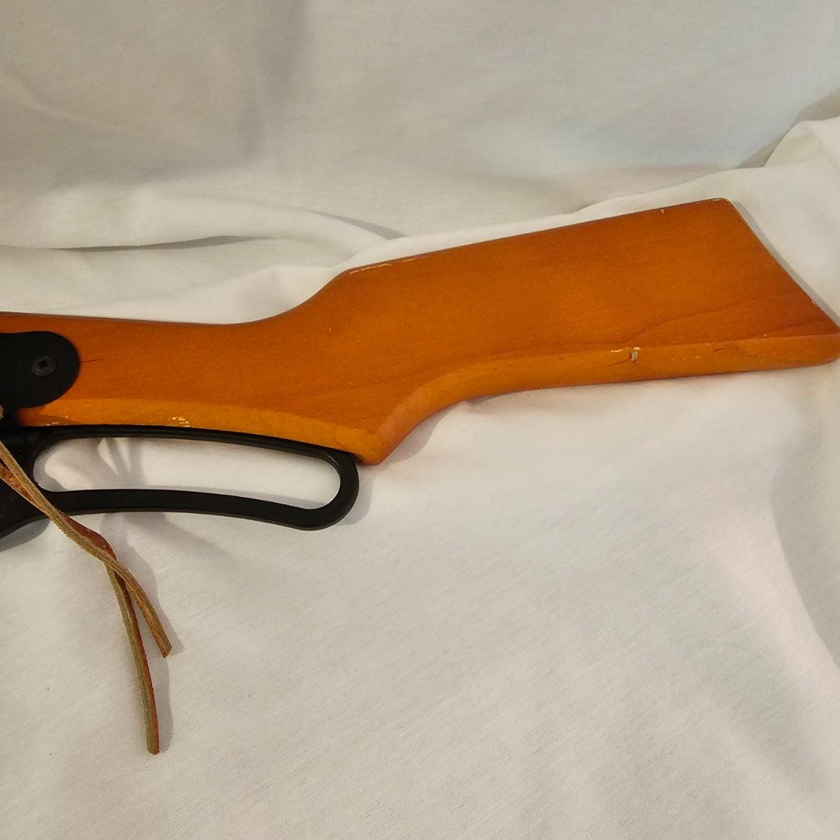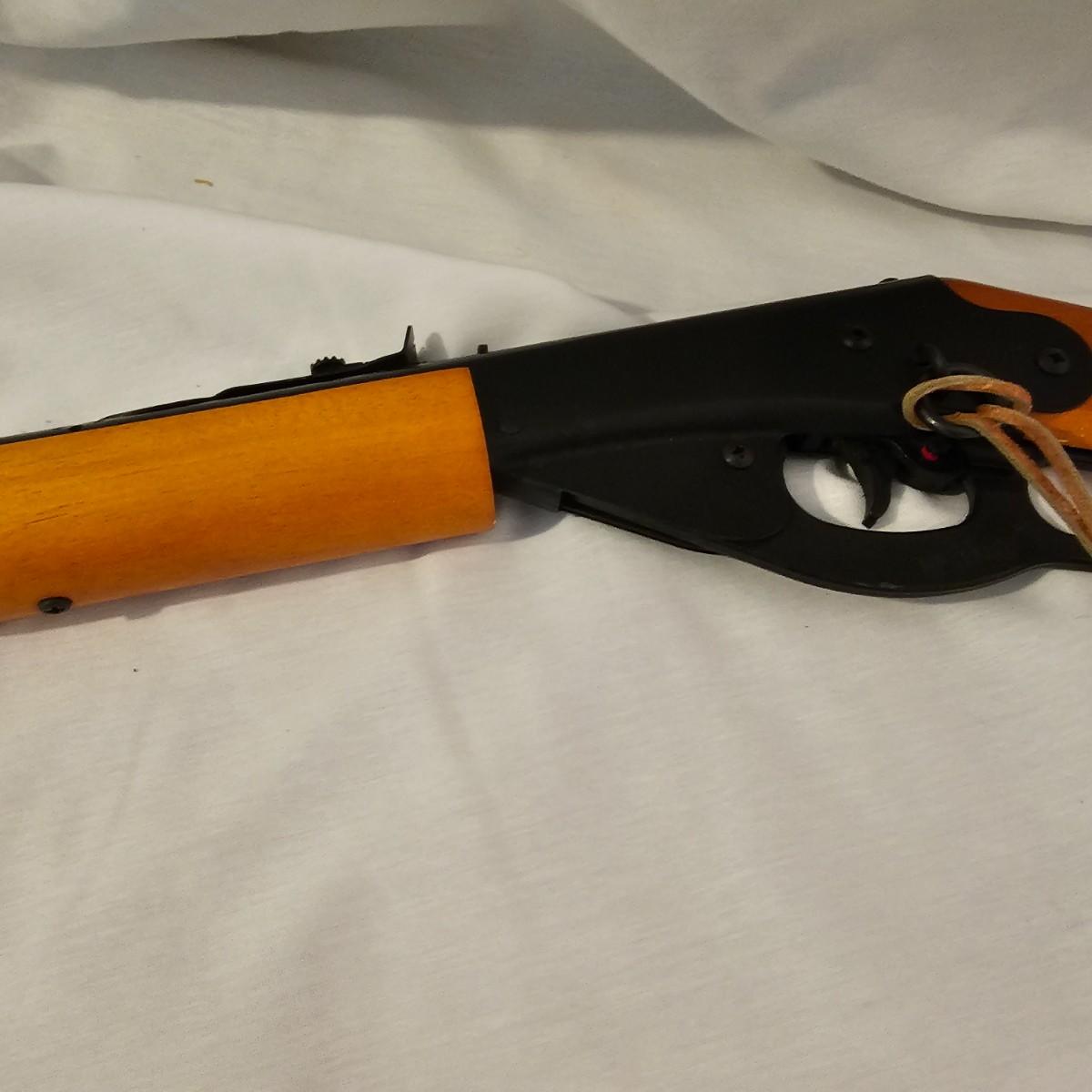 The classic Red Ryder BB gun from Daisy. Officially the Model 1938B, this item has maple colored stock and foregrip, a safety and the signature leather lanyard. Red Ryder and logo stamped into right side of stock. Gun measures 36" x 4.5"H. Includes one tube of Daisy premium BB's. See photos for details. Local pickup only.