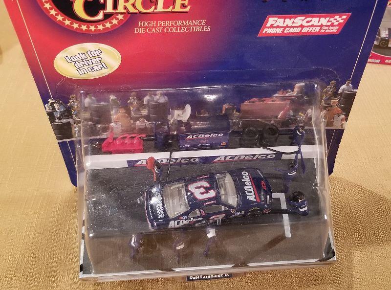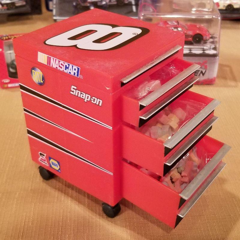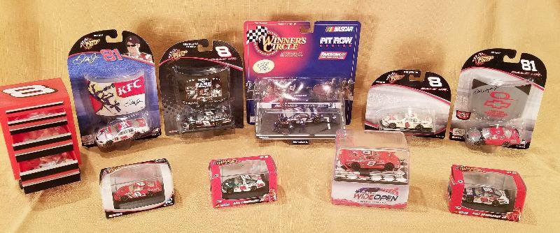 Dale Earnhardt Jr. Lot D: This lot includes a collection of 7 packaged mini die cast cars, 1 Winners Circle Pit Row collectible, 1 mini remote control car and a small, plastic model of a Snap-On Tool Chest filled with unopened candy tools.