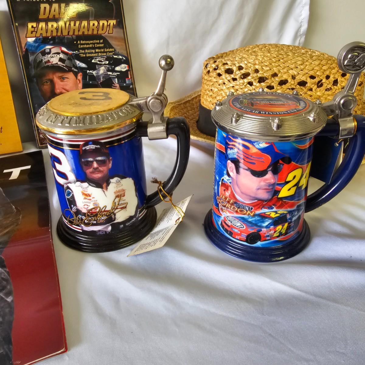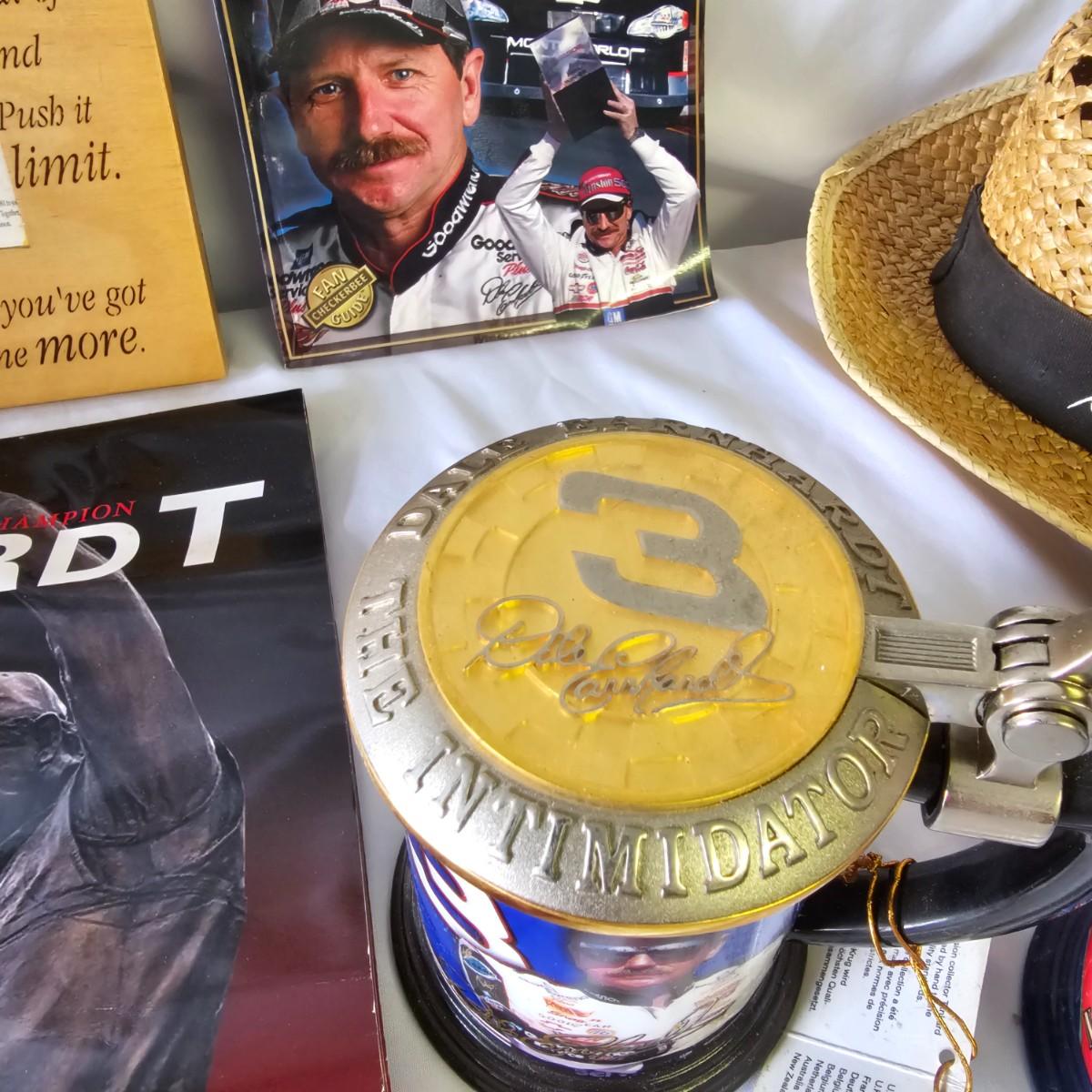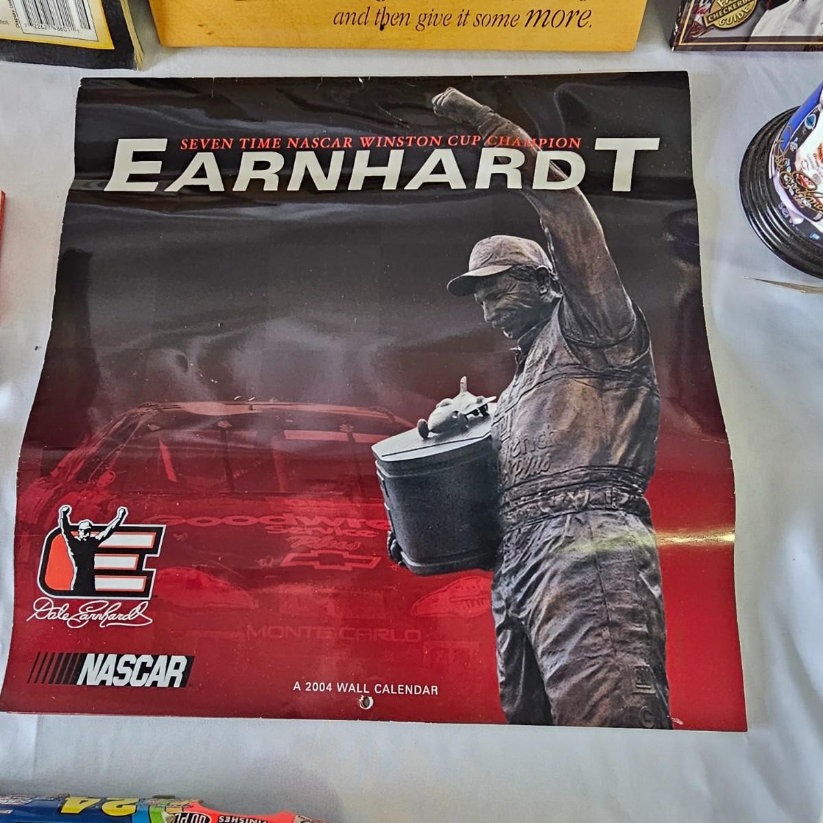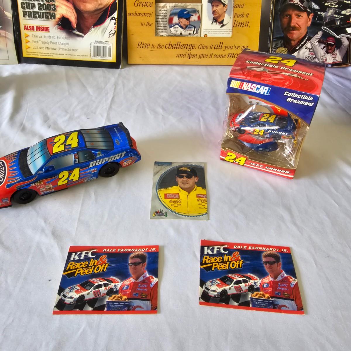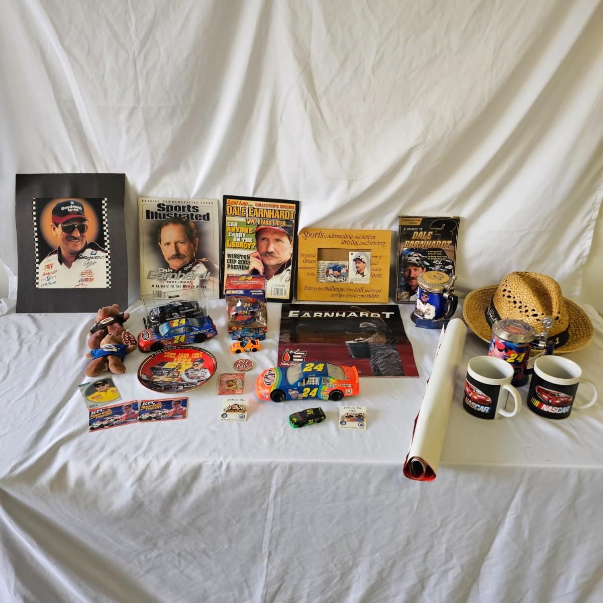 Multiple items honoring Dale Earnhardt and other Nascar drivers. Magazines, pictures, calendar, cups, more. Also some items of Jeff Gordon and Dale Jr. Dale Jr. Poster is 19" x 26". Note one car is missing a wheel. See photos for details. Shipping available.