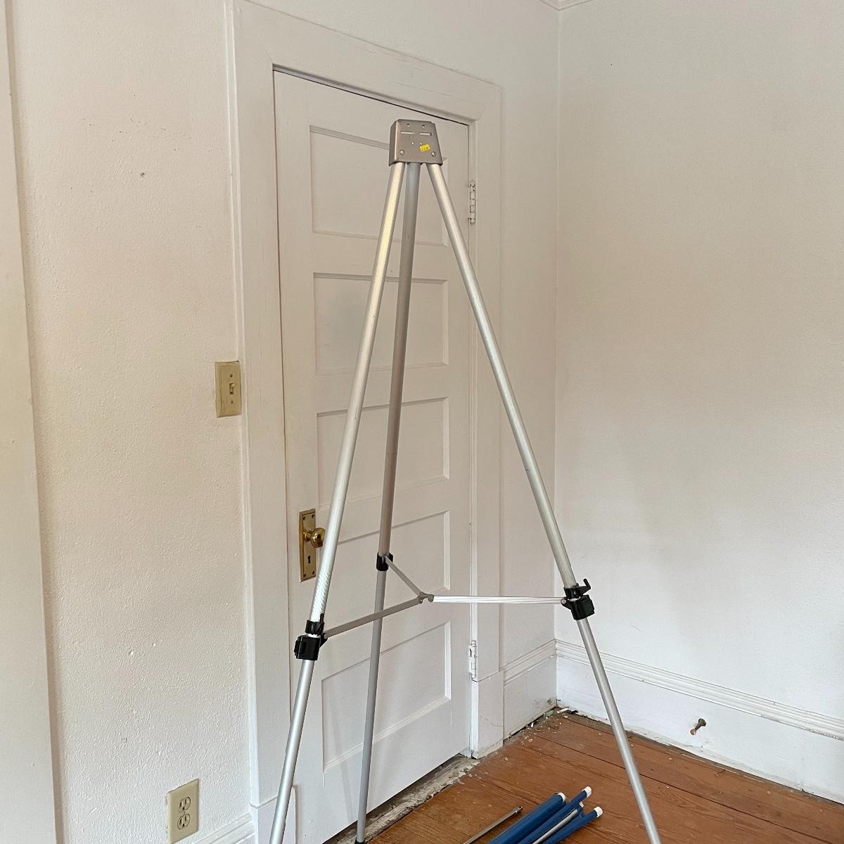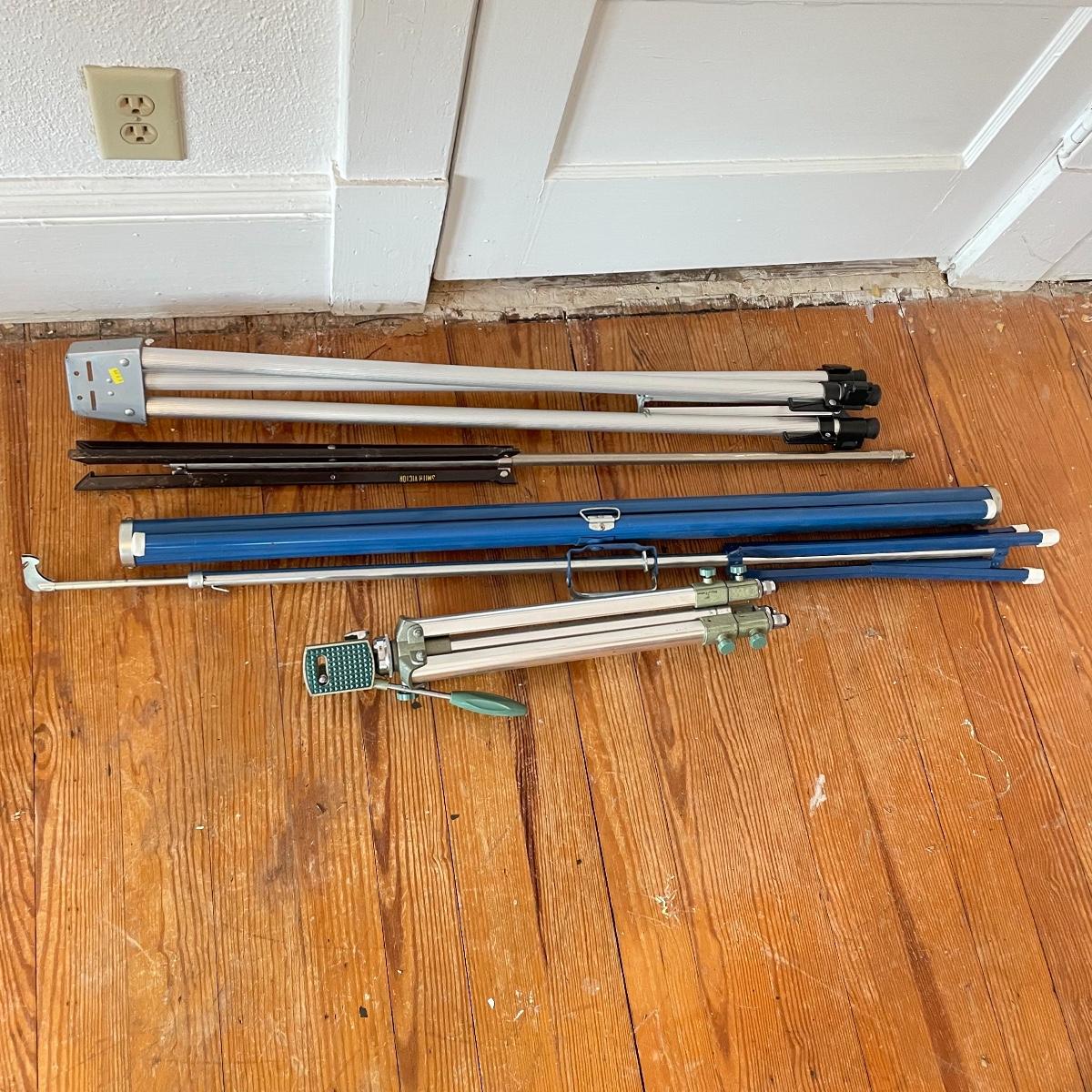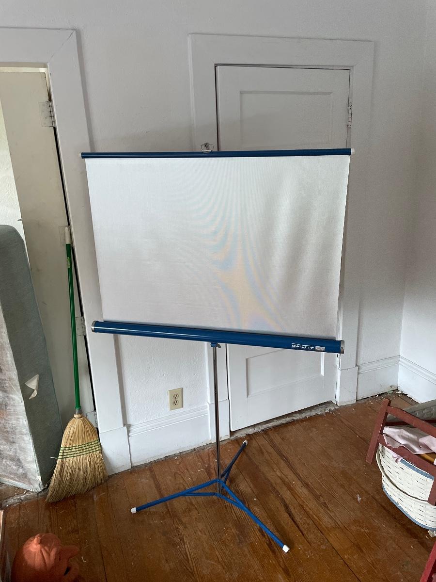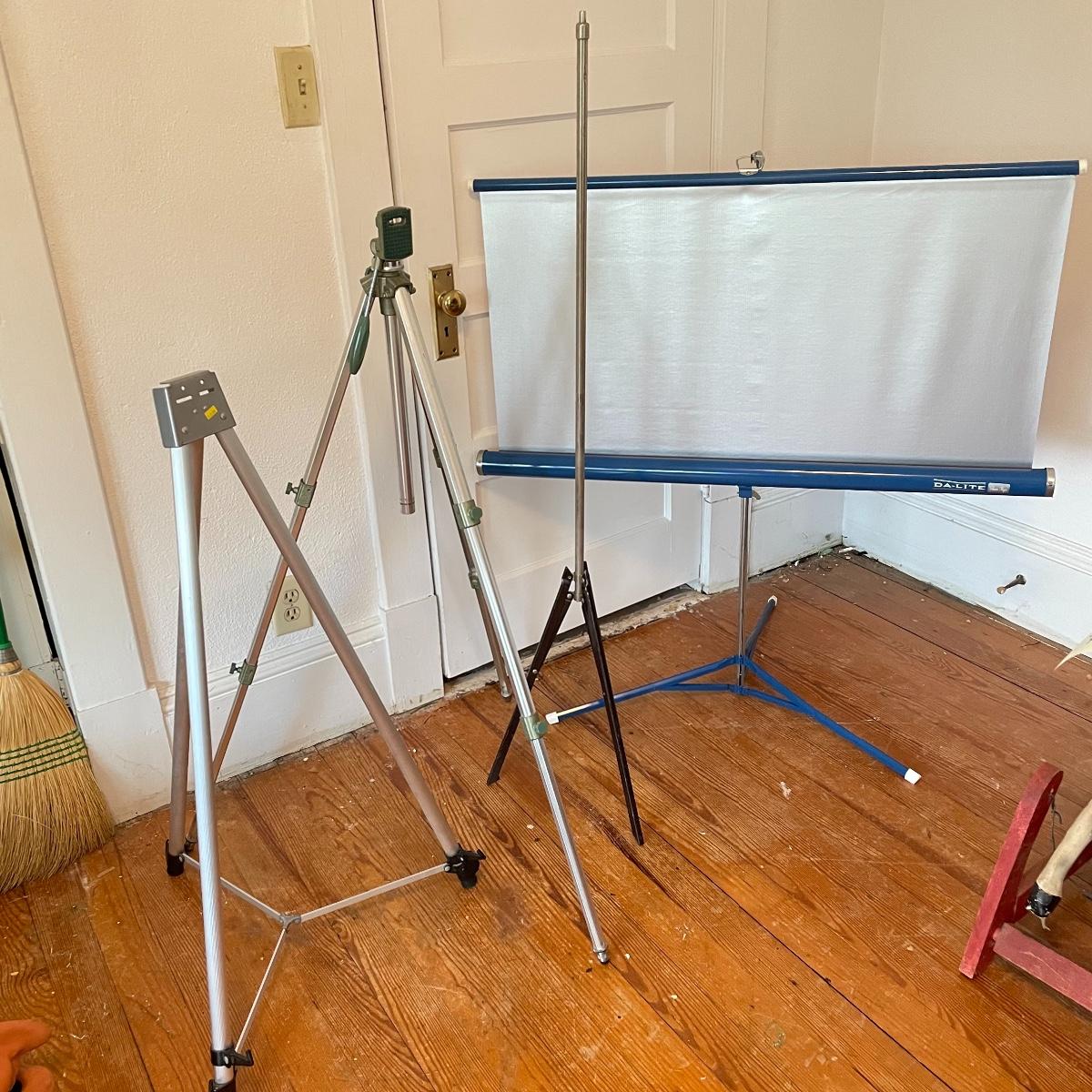 Da-Lite Silver Flyer 40”sq screen in nice condition, screen measures 32” x 40”(screen) and 65” tall including stand. The silver and green camera tripod can stand as tall as 44”. Lot also contains a Smith-Victor tripod and a 70” tall aluminum easel. Local pick up only.
