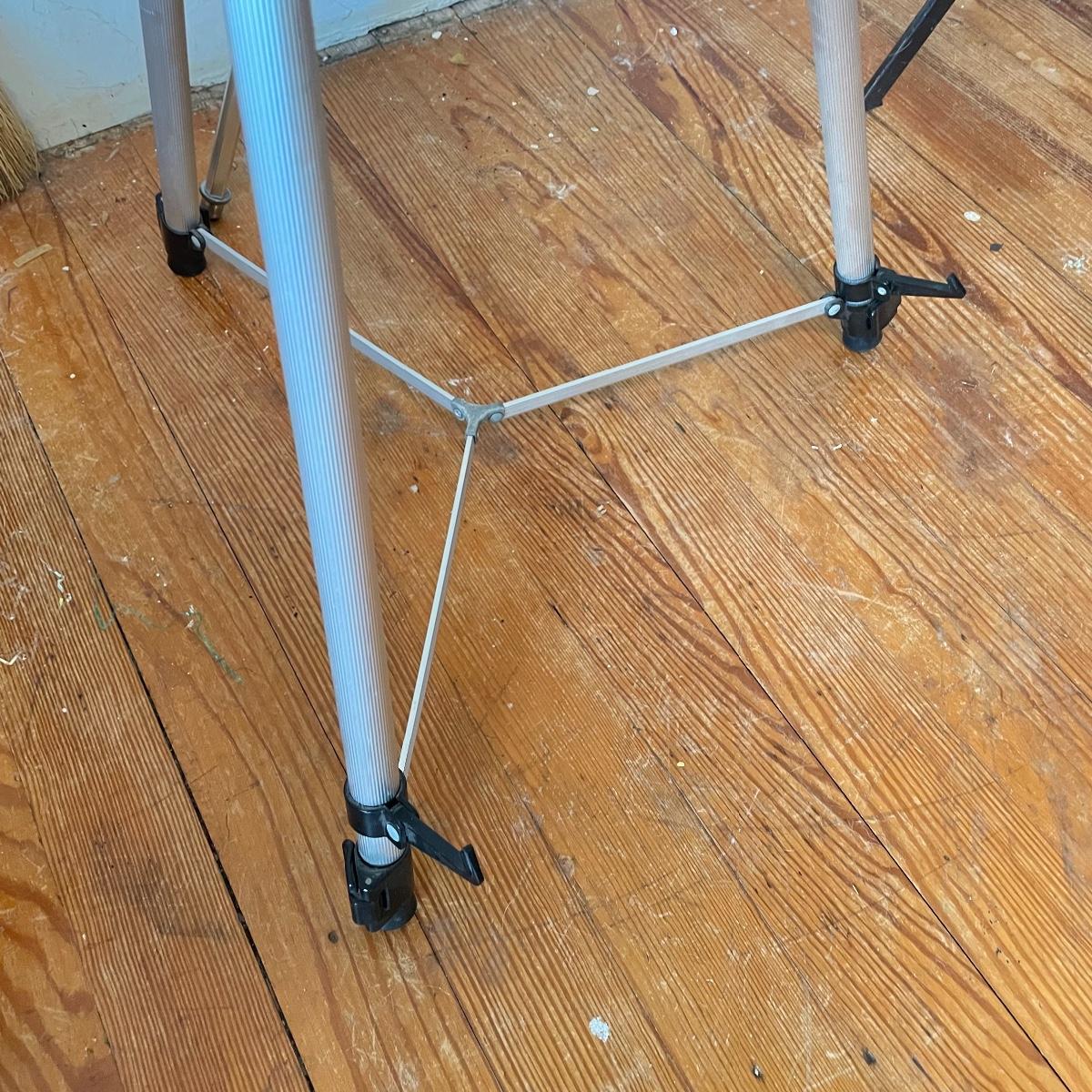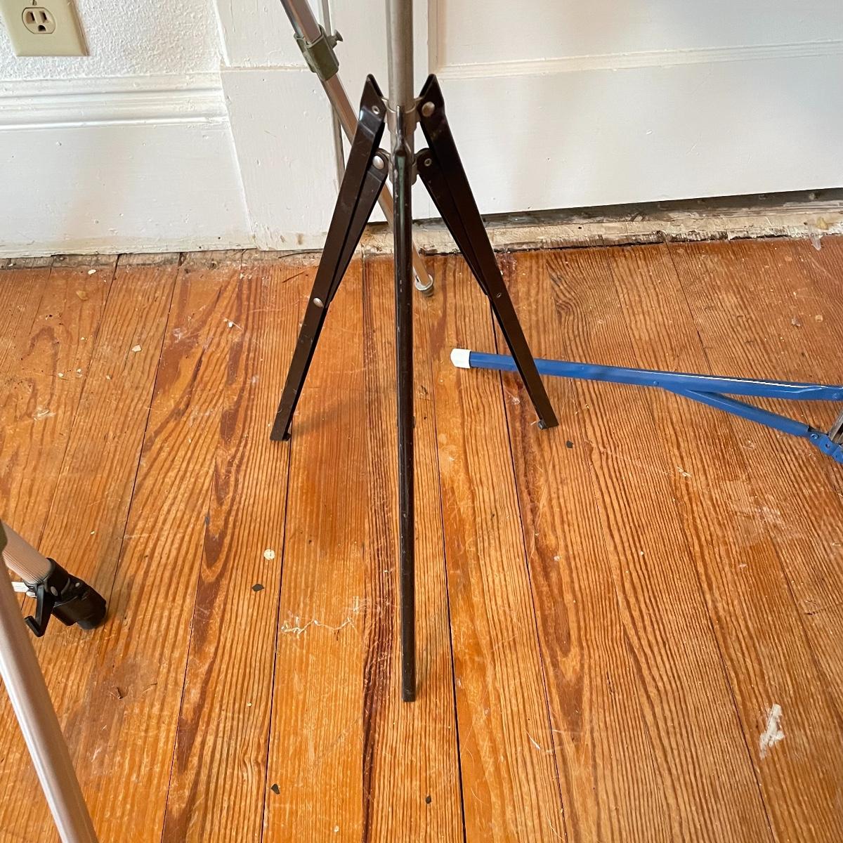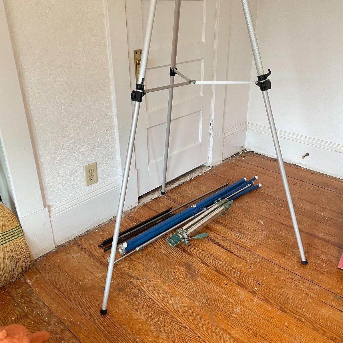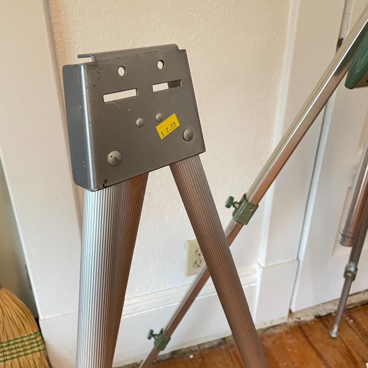 Da-Lite Silver Flyer 40”sq screen in nice condition, screen measures 32” x 40”(screen) and 65” tall including stand. The silver and green camera tripod can stand as tall as 44”. Lot also contains a Smith-Victor tripod and a 70” tall aluminum easel. Local pick up only.