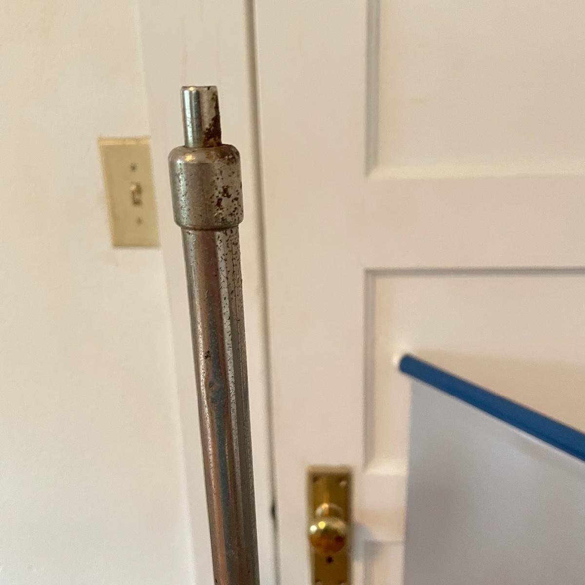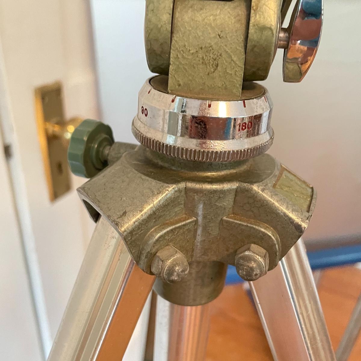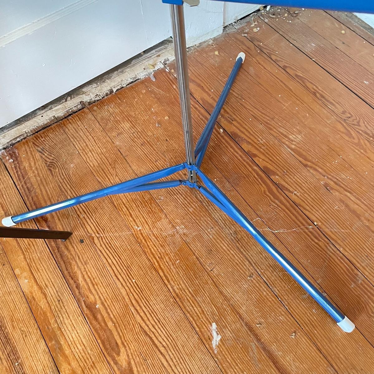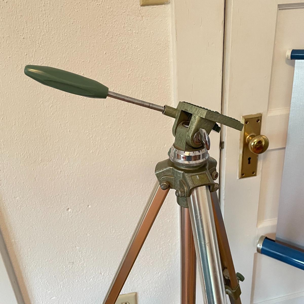Da-Lite Silver Flyer 40”sq screen in nice condition, screen measures 32” x 40”(screen) and 65” tall including stand. The silver and green camera tripod can stand as tall as 44”. Lot also contains a Smith-Victor tripod and a 70” tall aluminum easel. Local pick up only.