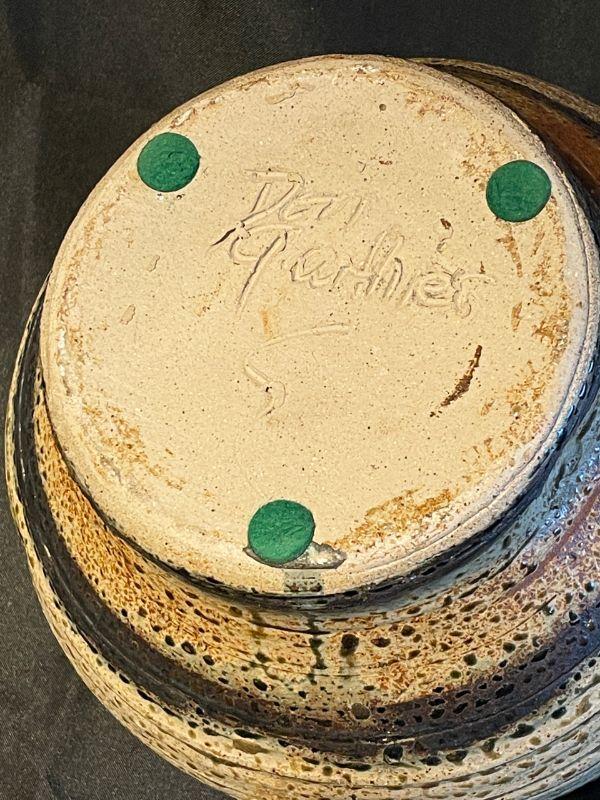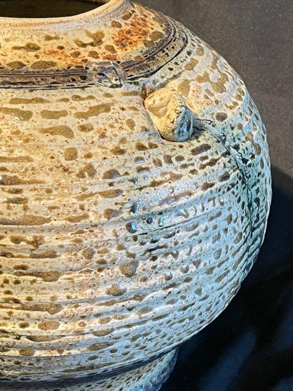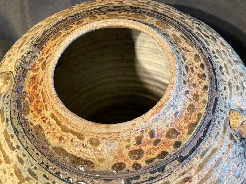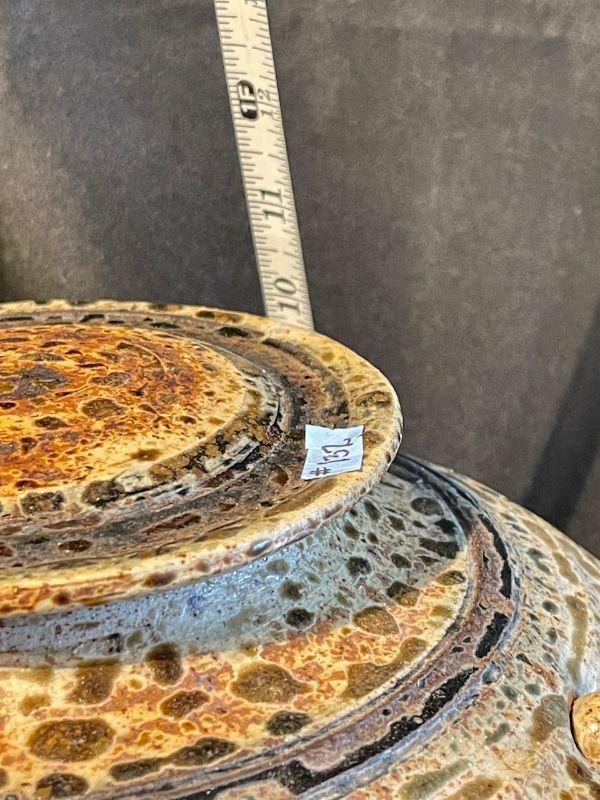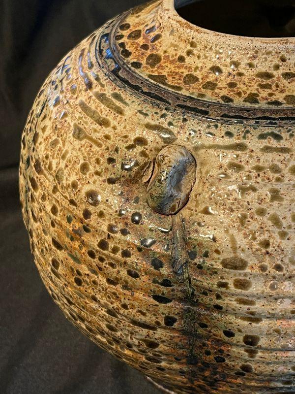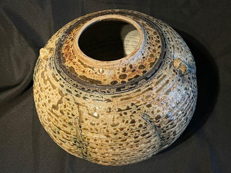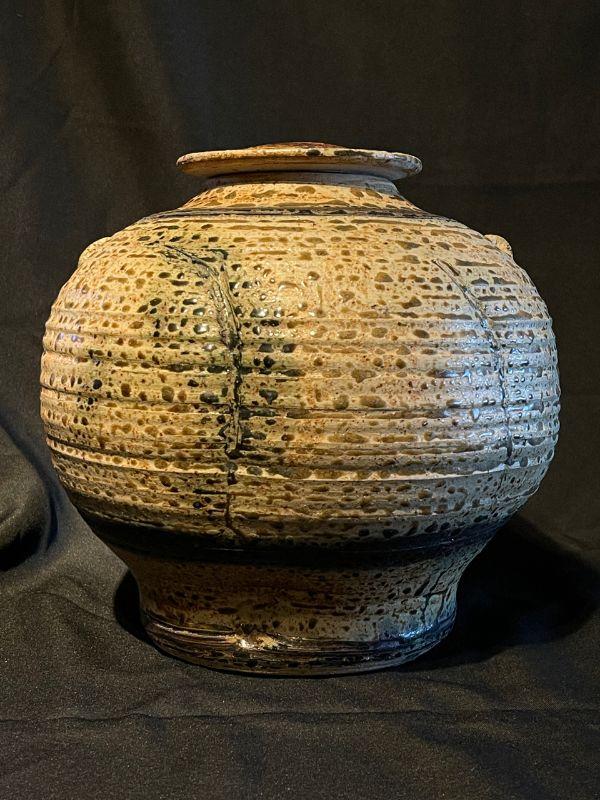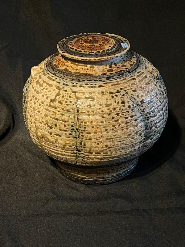 This is a fine, salt fired studio pot by Dan Gauthier. This master potter has created a lidded pot reminiscent of those thrown by 12th C Korean potters who created this squat-bulbous shape for storage. Dan Gauthier graduated from Wichita State University in the late 70's and subsequently taught ceramic art there.The unique surface/glazing treatment has created a varied and, as always, an unpredictable, but exciting surface.