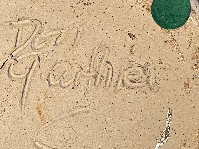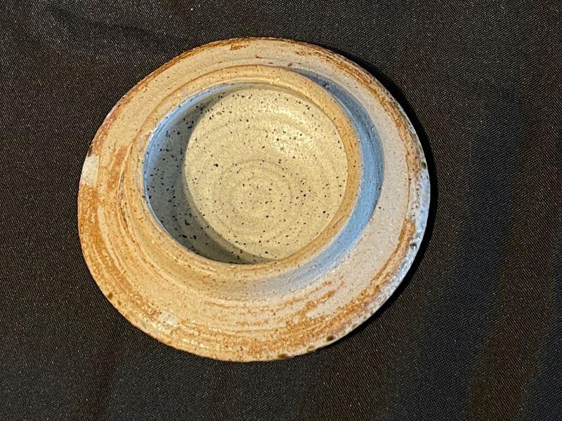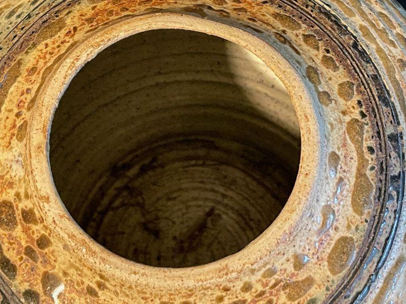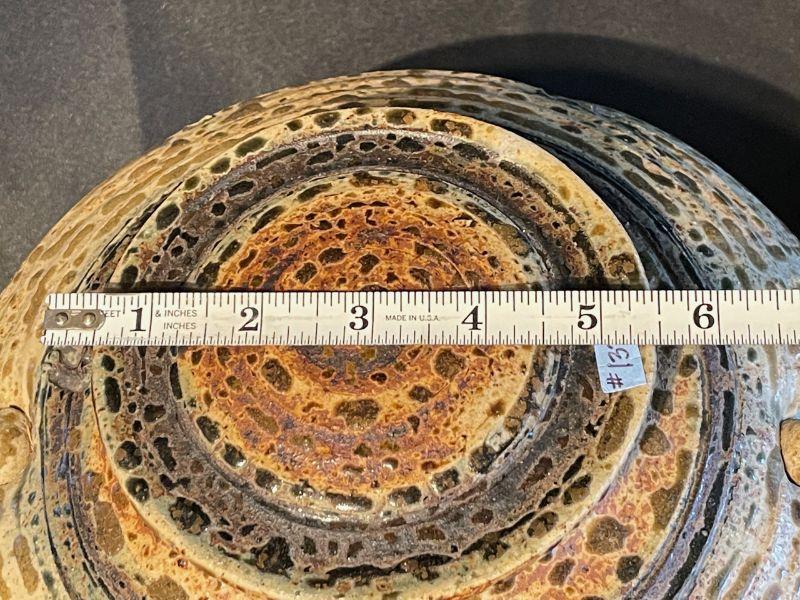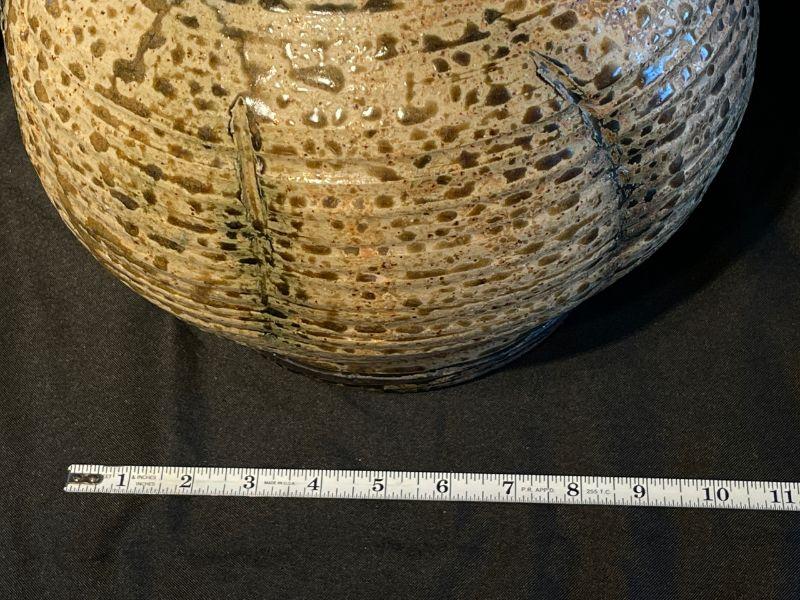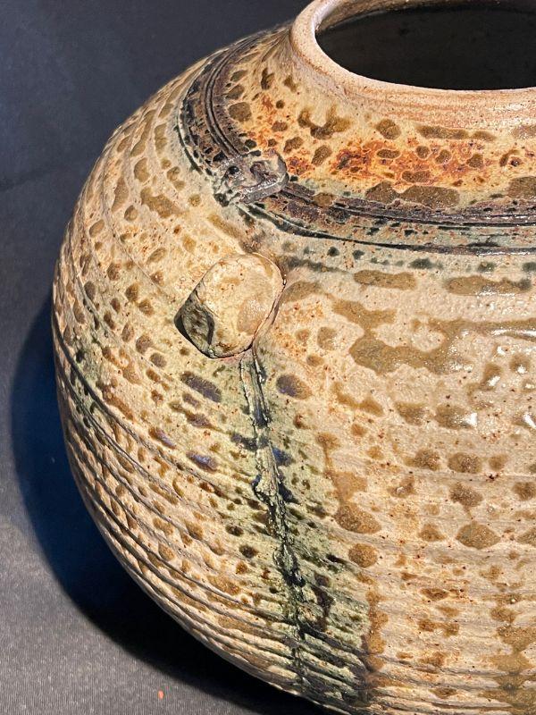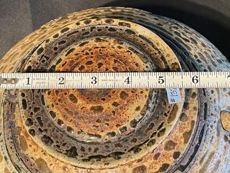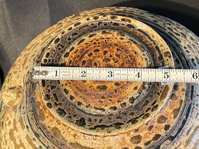 This is a fine, salt fired studio pot by Dan Gauthier. This master potter has created a lidded pot reminiscent of those thrown by 12th C Korean potters who created this squat-bulbous shape for storage. Dan Gauthier graduated from Wichita State University in the late 70's and subsequently taught ceramic art there.The unique surface/glazing treatment has created a varied and, as always, an unpredictable, but exciting surface.
