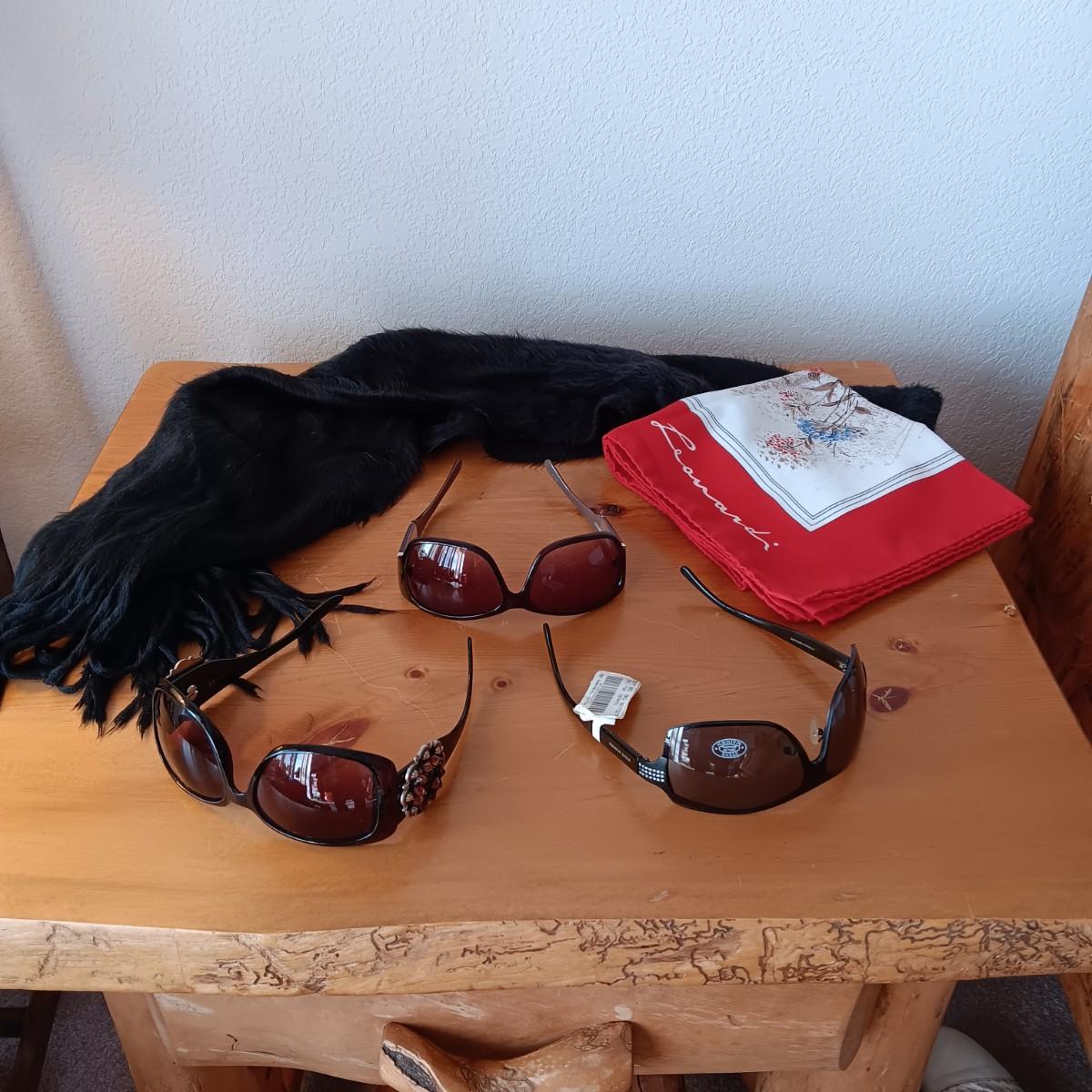 DANA BUCHMAN, STEVE MADDEN & ANOTHER PAIR OF LADIES SUNGLASSES PLUS 2 SCARVES