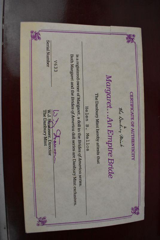Danbury Mint "Brides of America" Doll with Box, COA, & Stand. Margaret, An Empire Bride, Vintage 1986