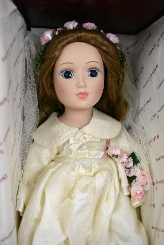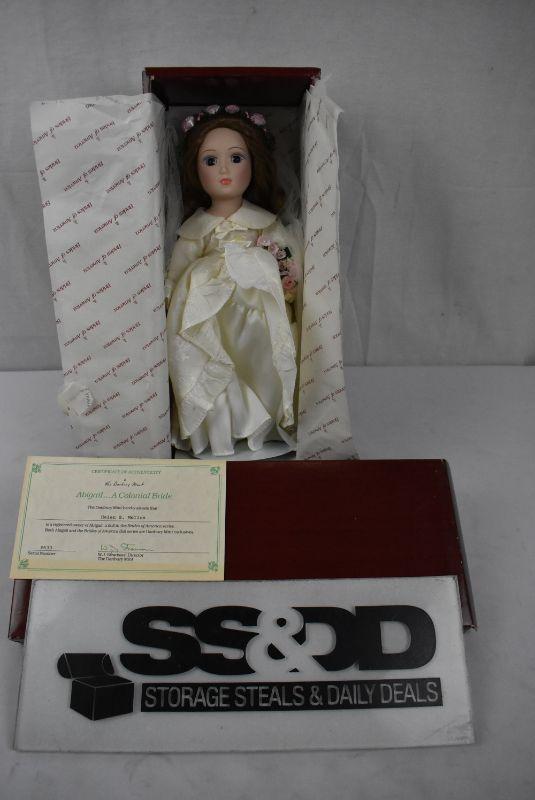Danbury Mint "Brides of America" Doll w/ Box, COW, & Stand. Abigail Vintage 1987