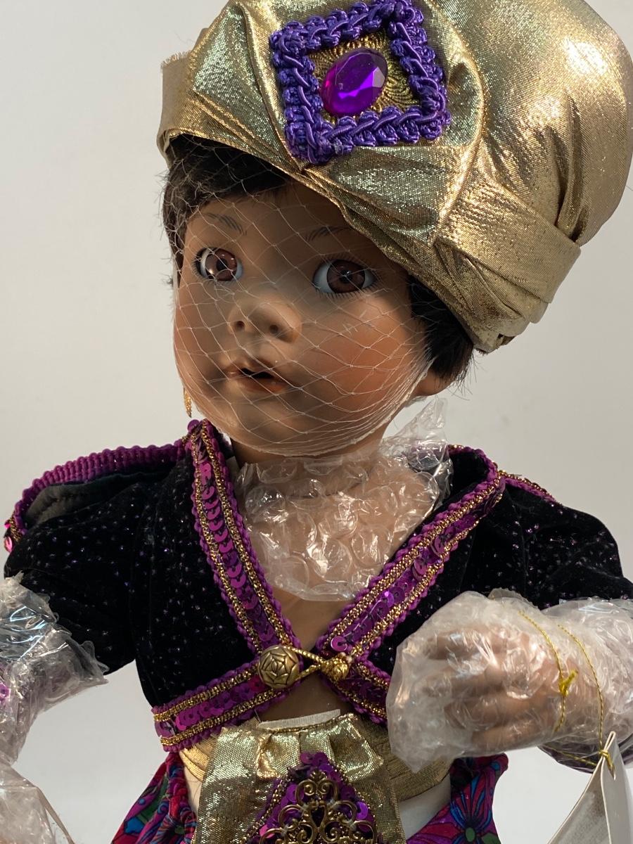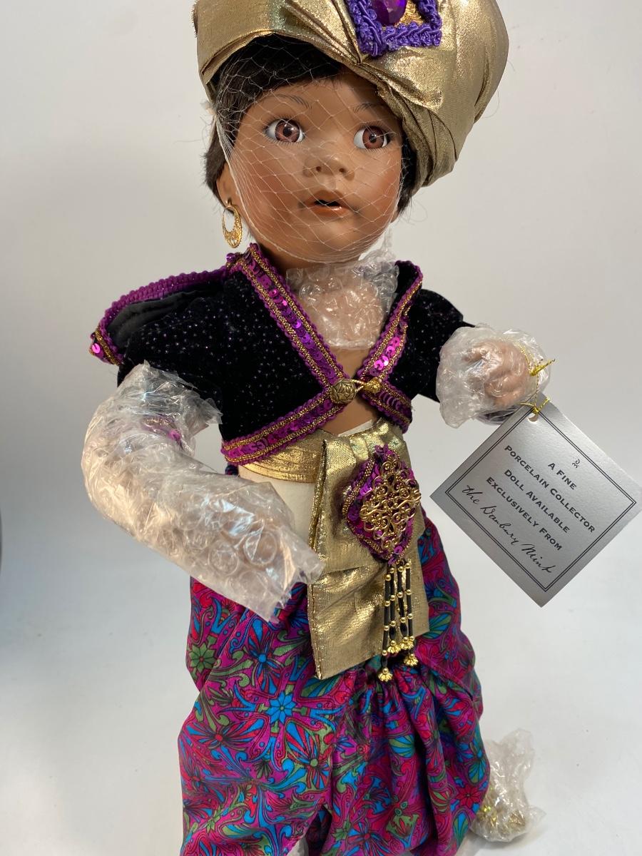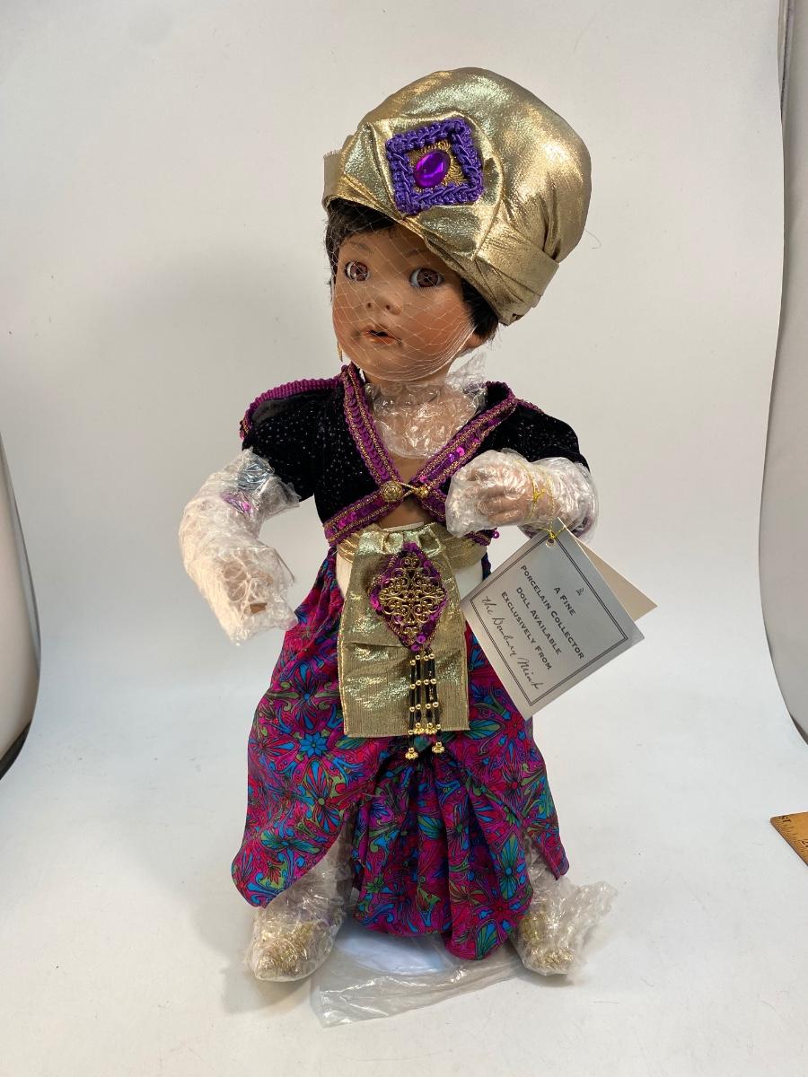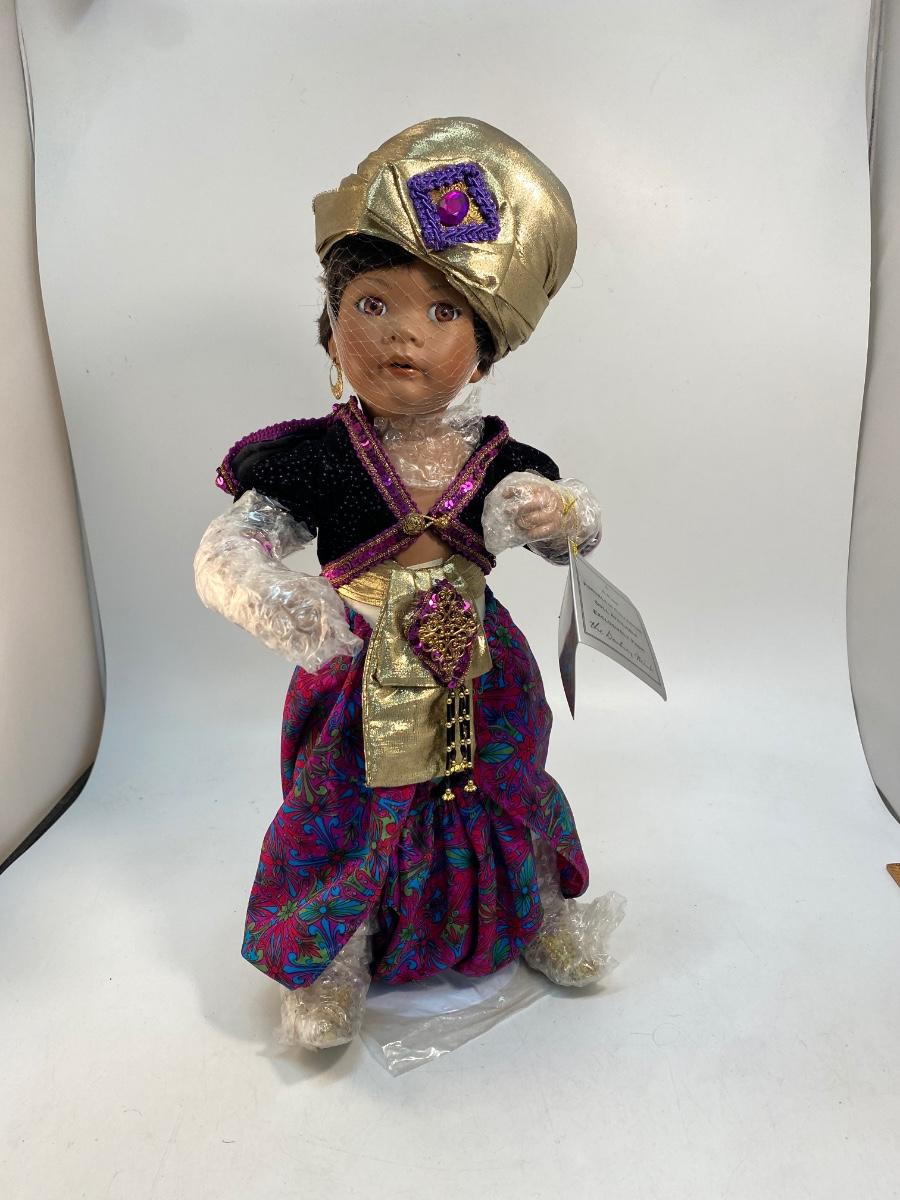Danbury Mint Porcelain Collector Doll Genie Partially Wrapped. I’m good condition. No box but limbs and head are still wrapped from packaging. Pants seem to not fit well like the elastic has aged.