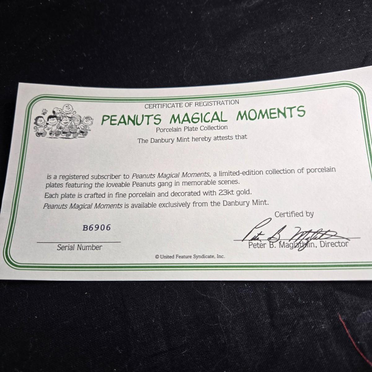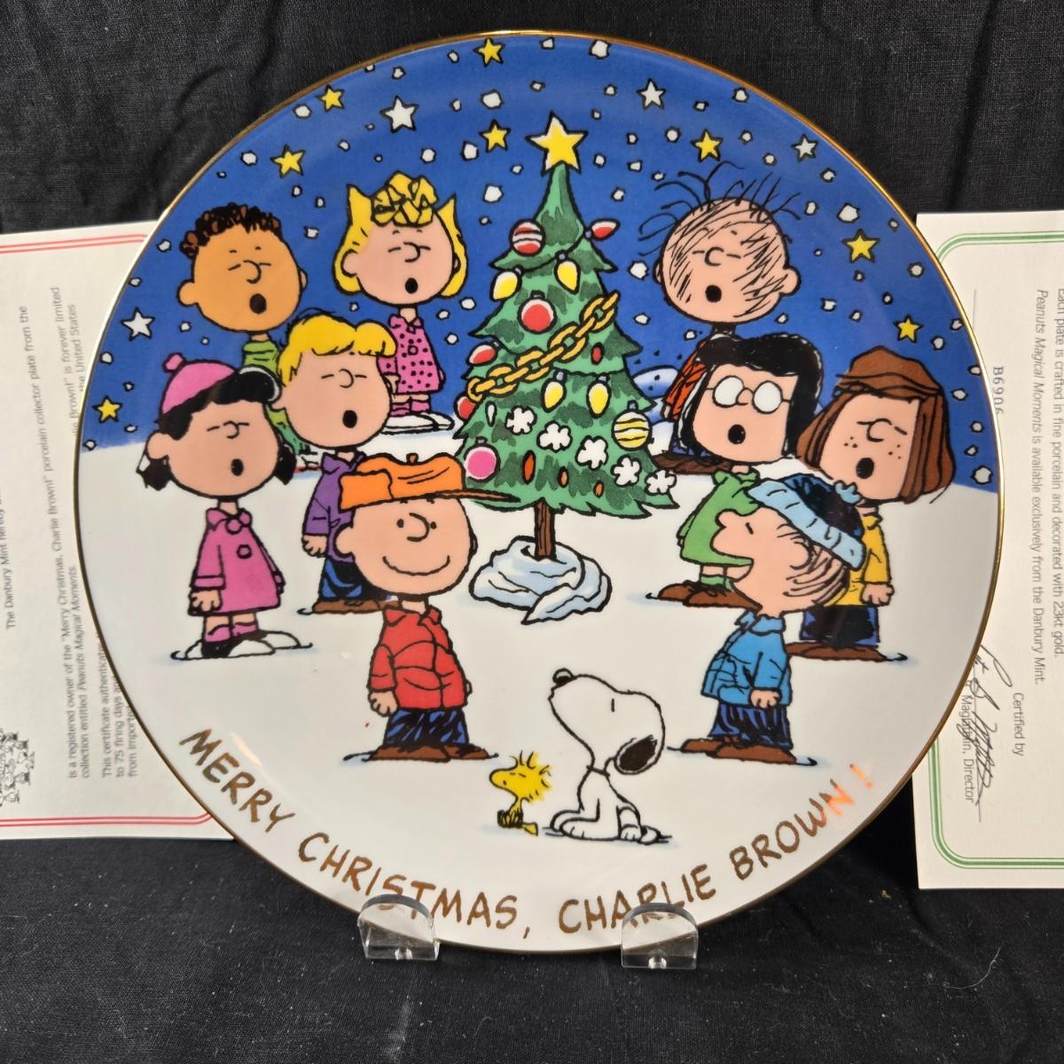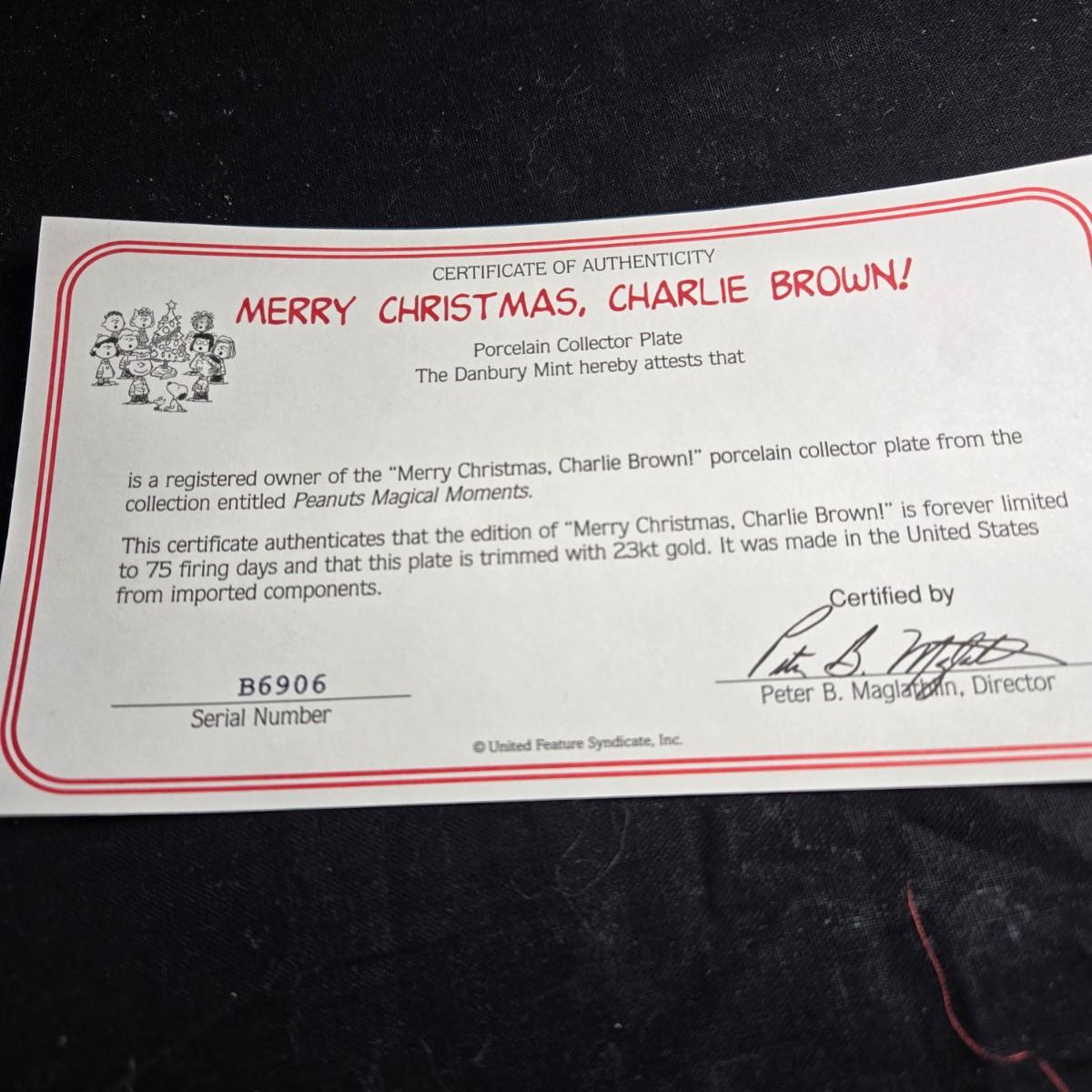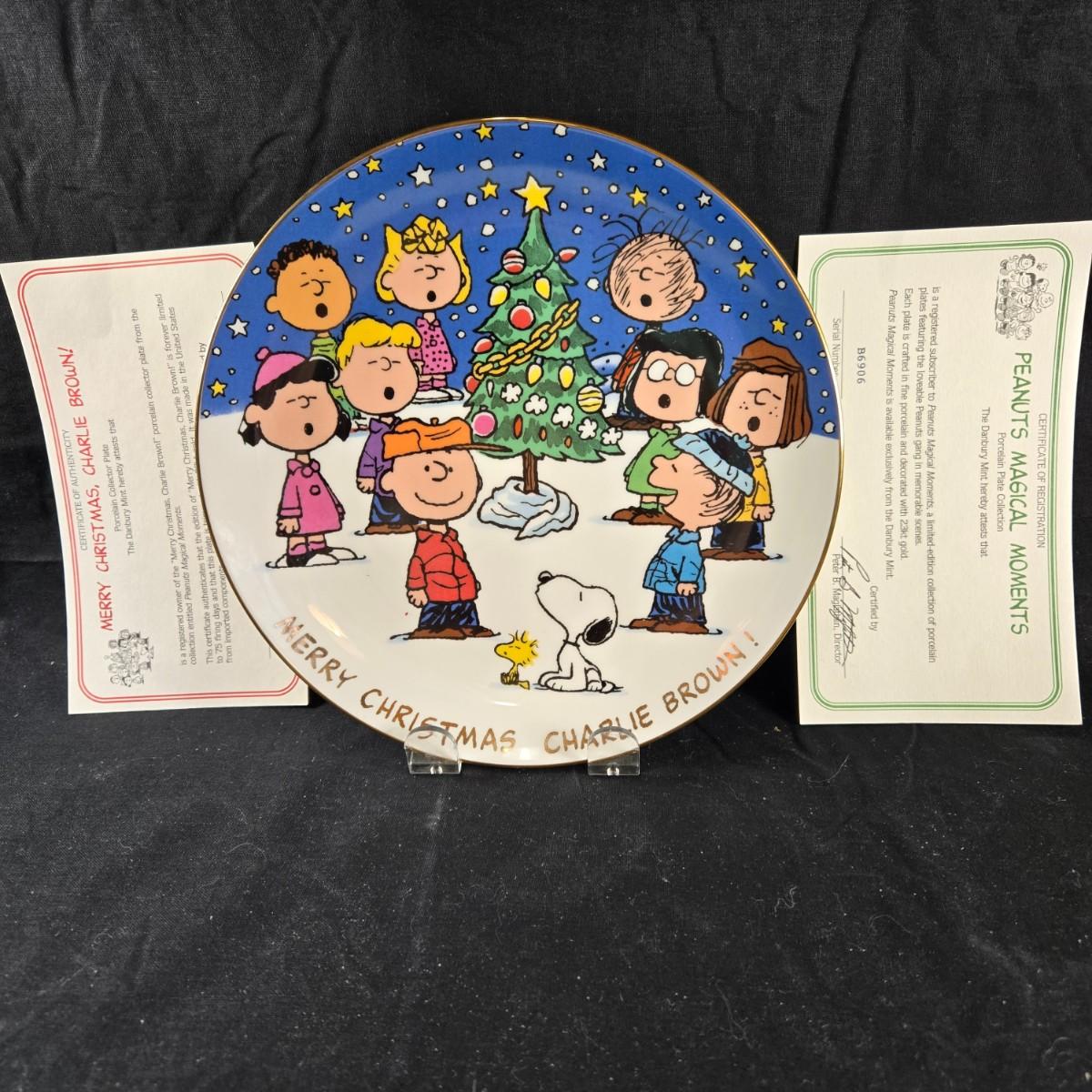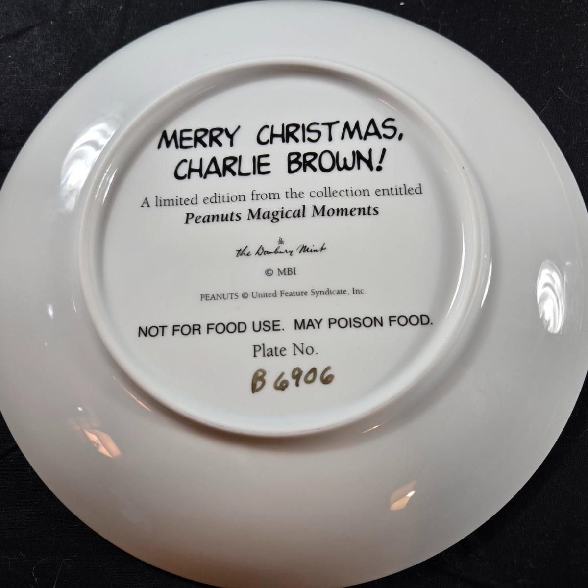 This auction lot is for a Danbury Mint Snoopy Plate. This is a vintage Snoopy Collectible. This is a Danbury Mint Collectible Plate - # B6906 "Merry Christmas Charlie Brown" from the "Peanut's Magical Moments" Limited Edition. Includes Certificates of Authenticity. It is about 8.25-inches in diameter.