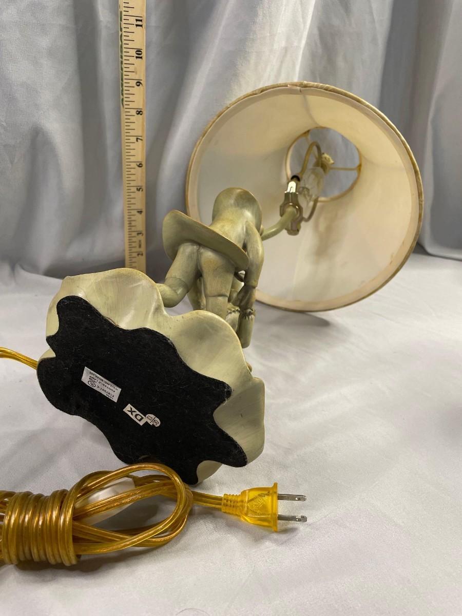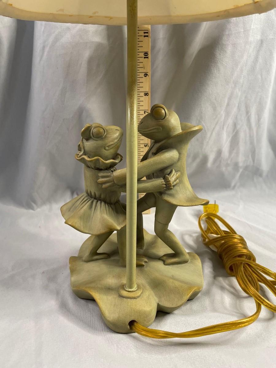 This would be perfect for a child&#39;s room. It is a frog couple who are dancing on a lily pad and made of a resin type of material. I didn&#39;t find any issues with this adorable lamp. The power switch is on the cord.<br />