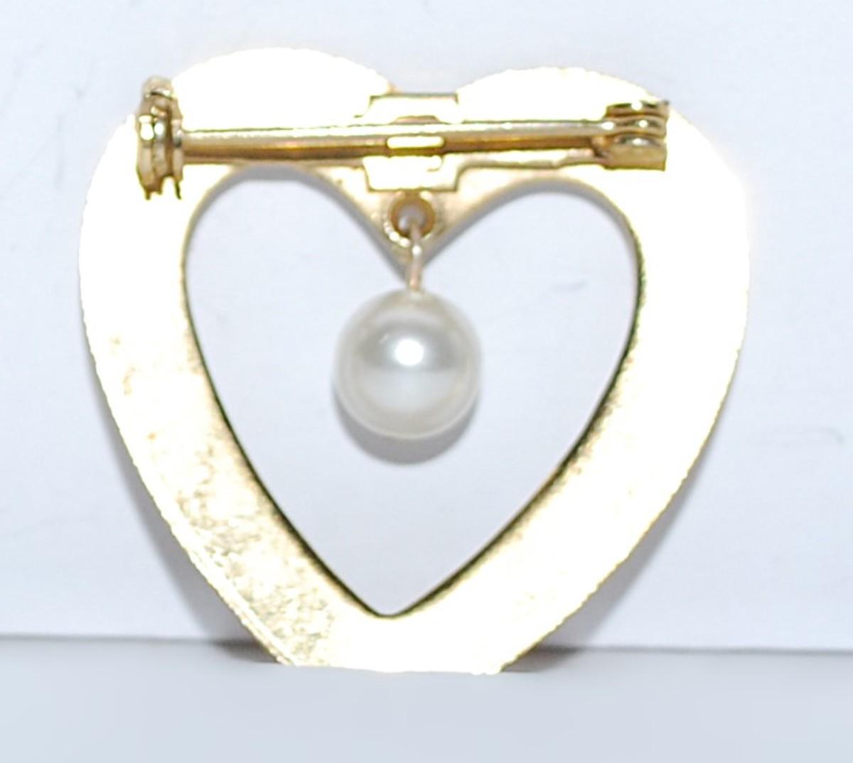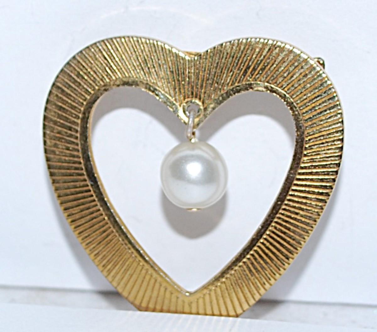 Dangle PEARL HEART BROOCH (1½" x 1¼") on a Gold Tone Setting