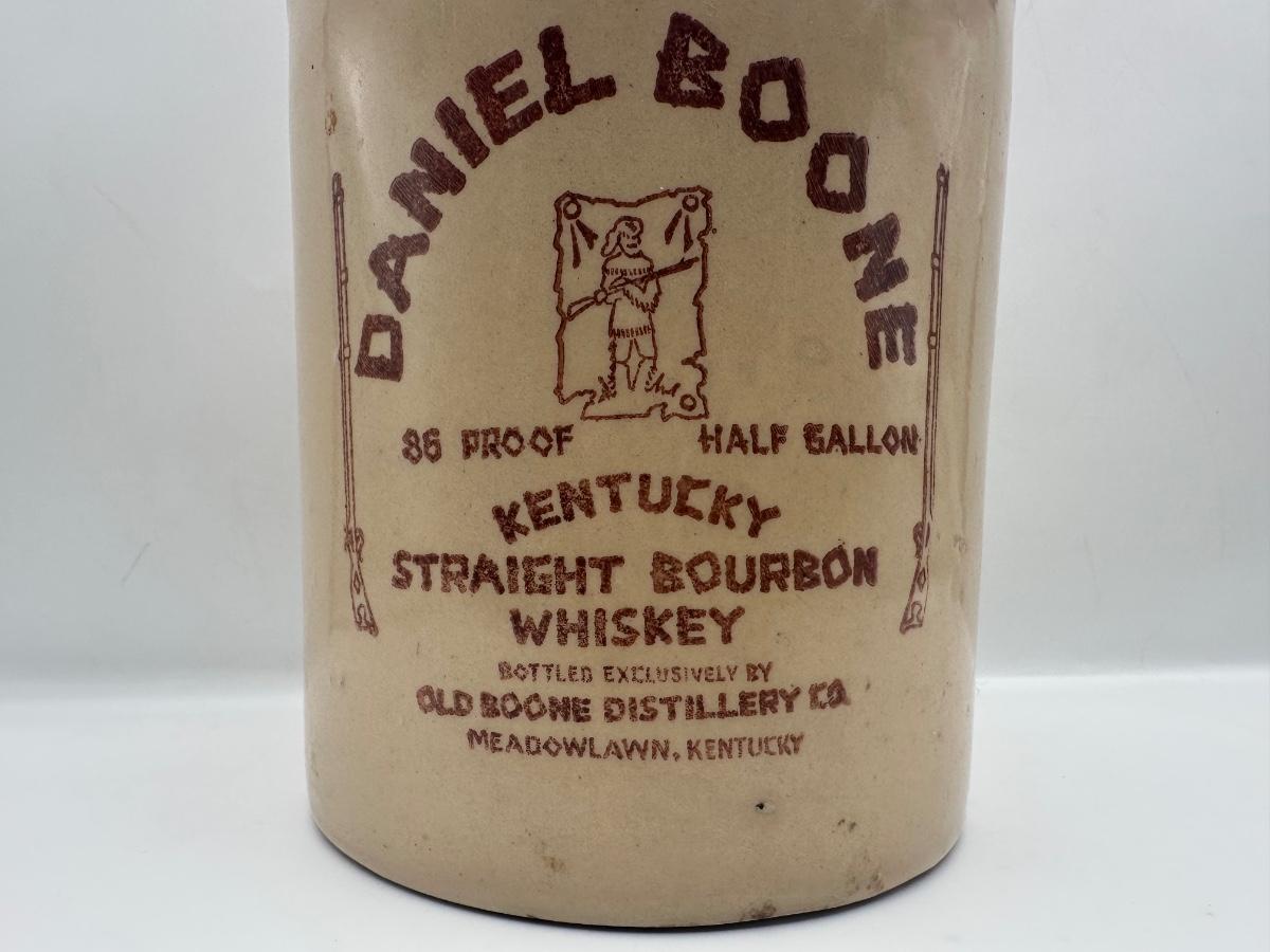 Stoneware whiskey jug labeled “Daniel Boone” Kentucky Straight Bourbon Whiskey, half gallon, 86 proof. Marked on base “Liquor Bottle 11-D16” with cork stopper present.