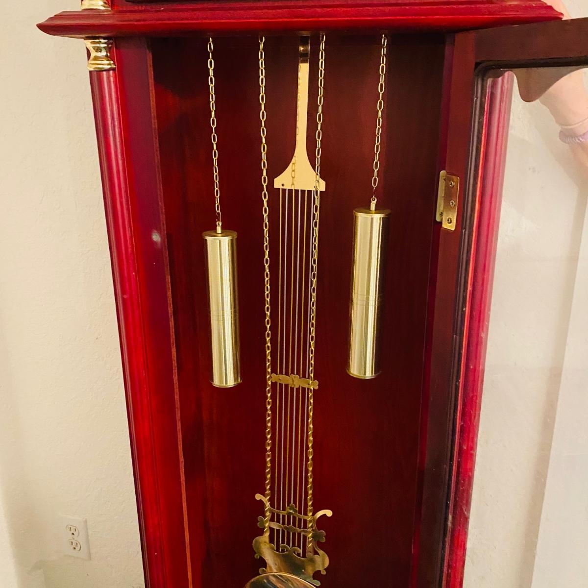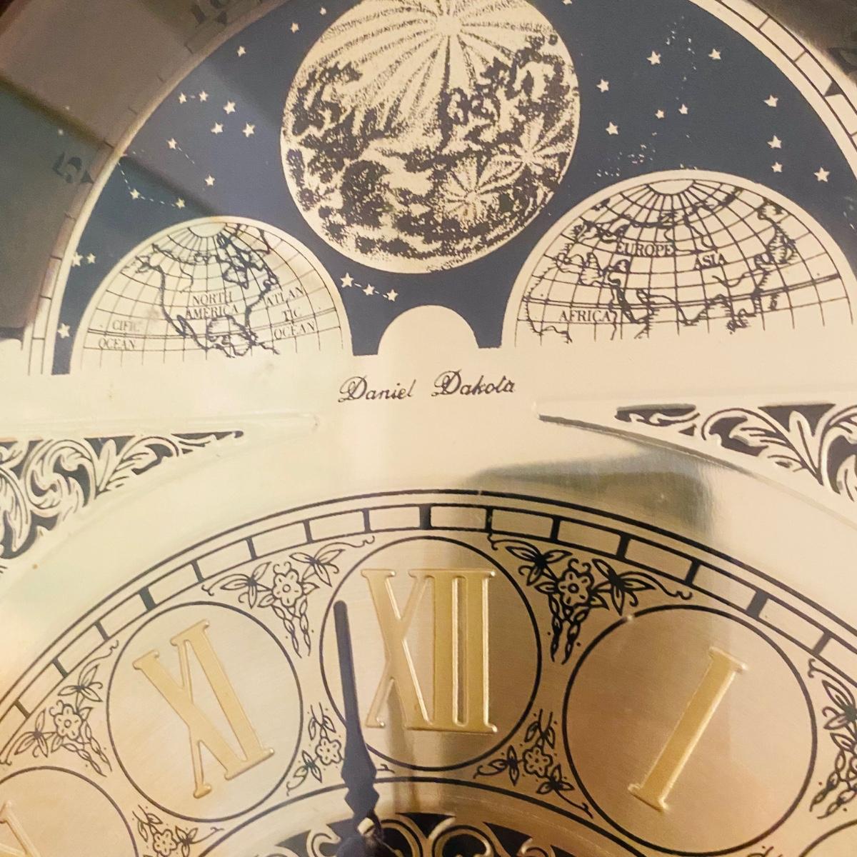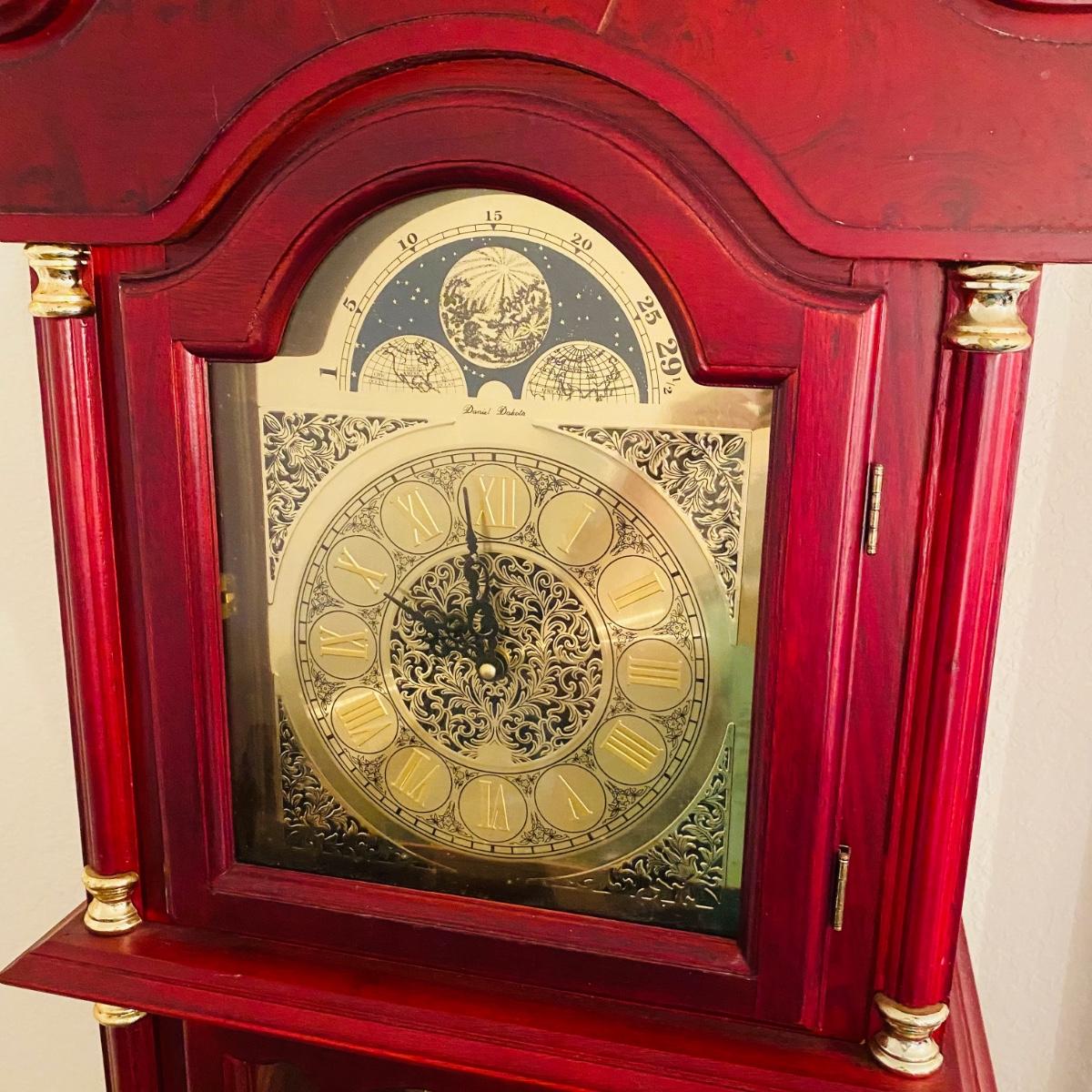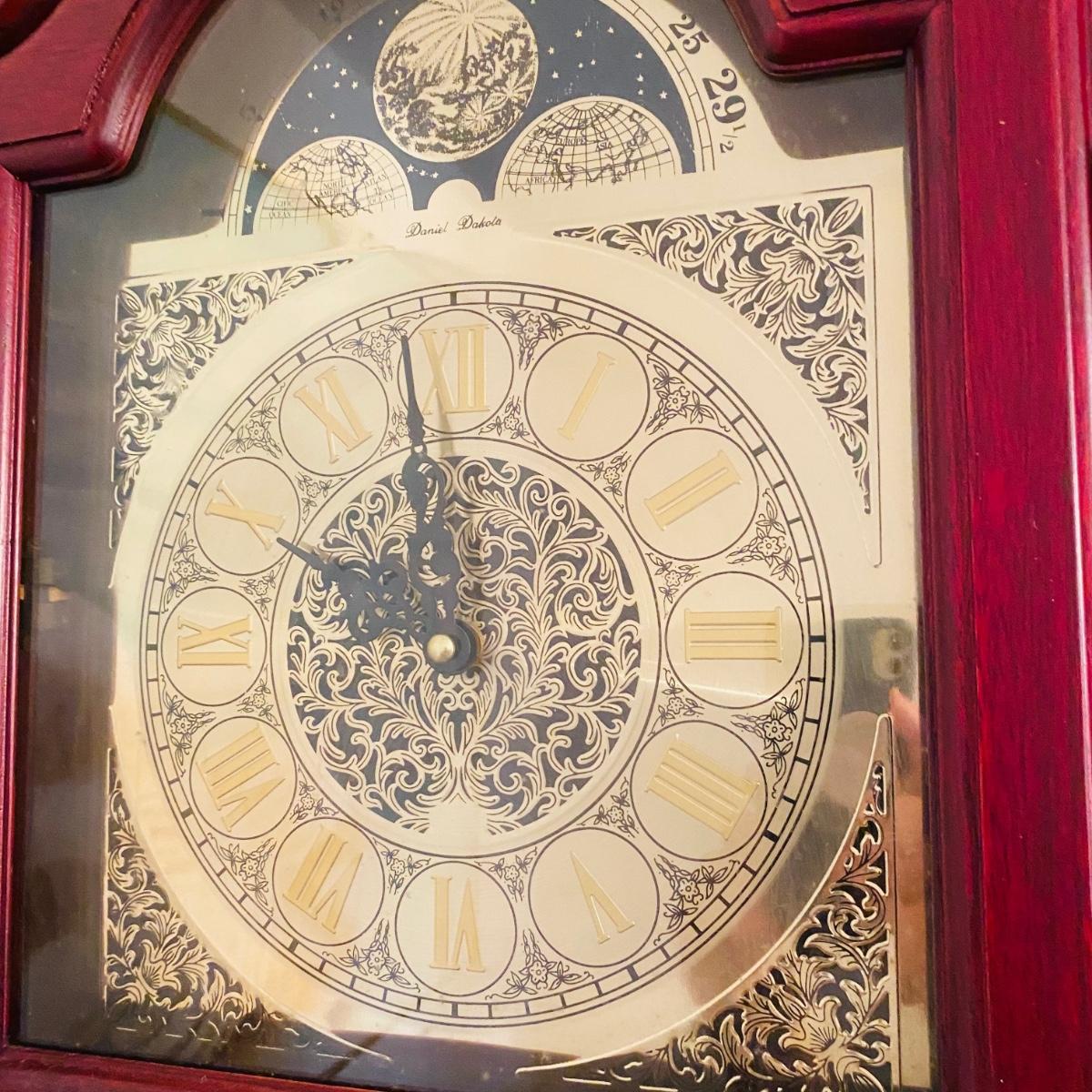 Daniel Dakota grandfather clock. Cherry wood like finish. Measures 19”L x “9 W x 79”H.
