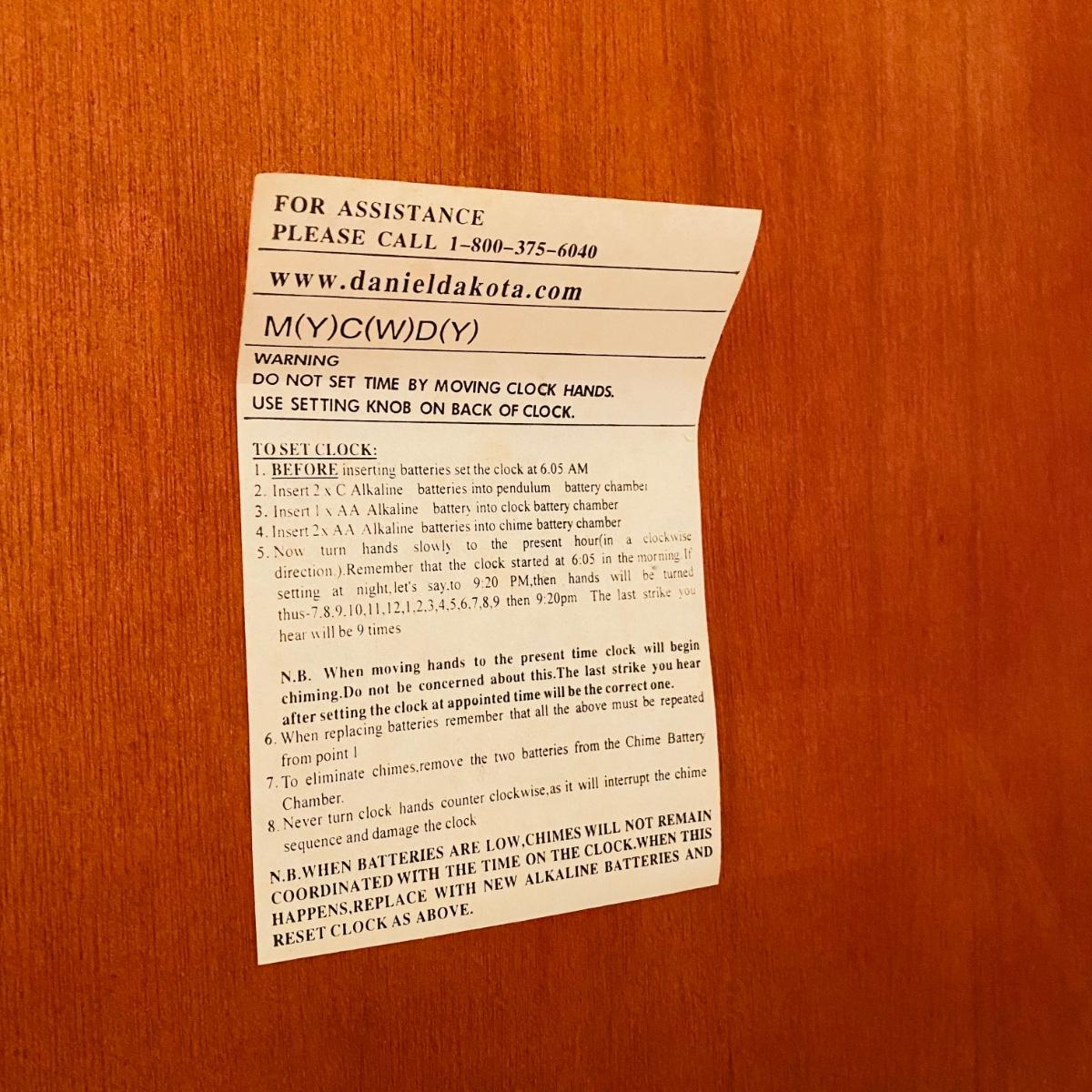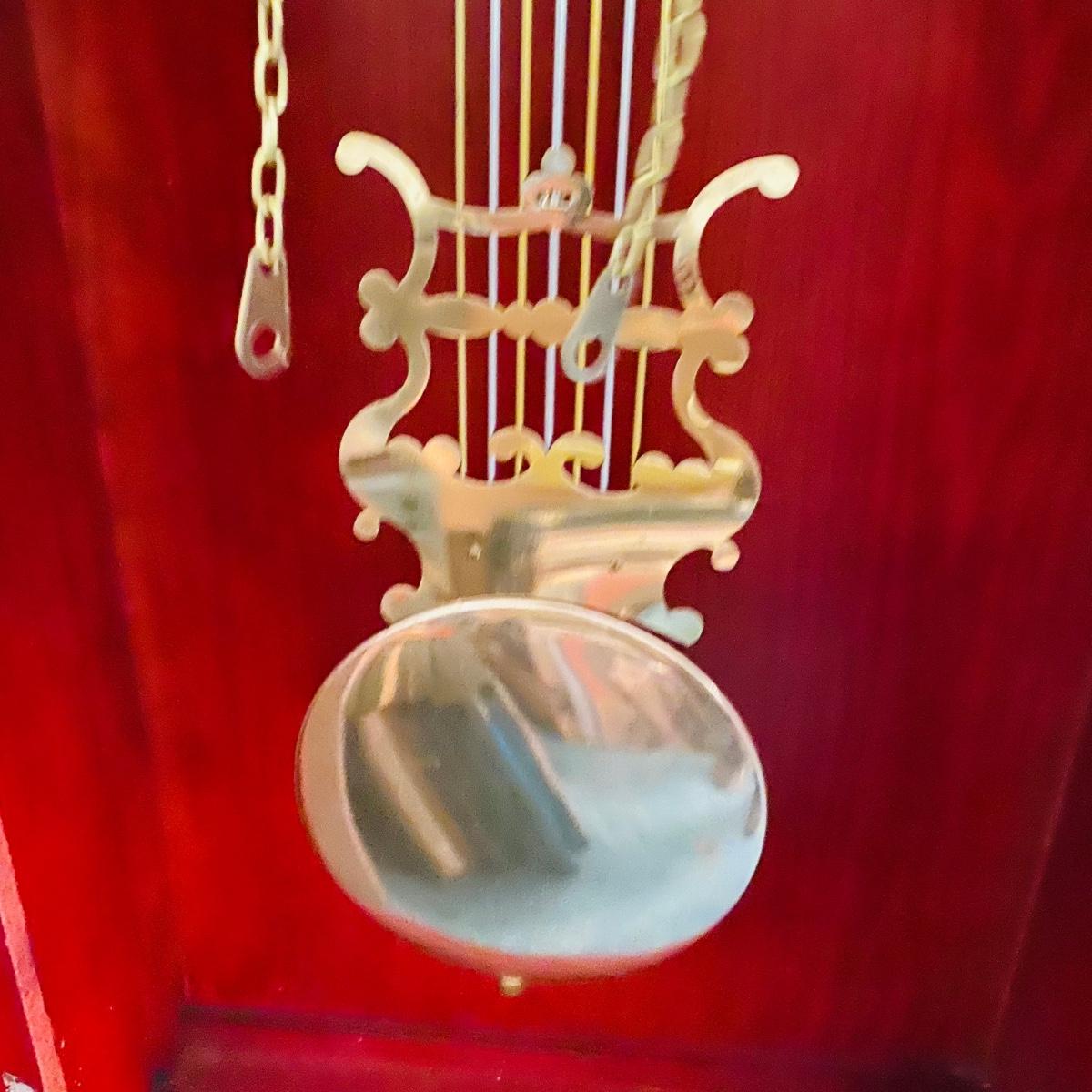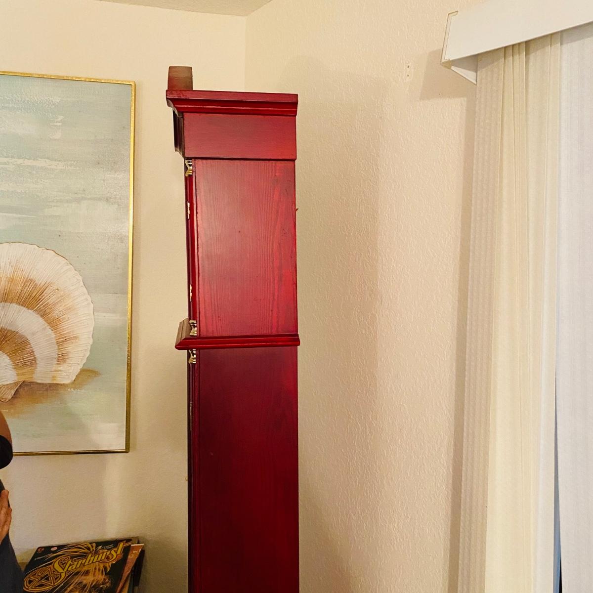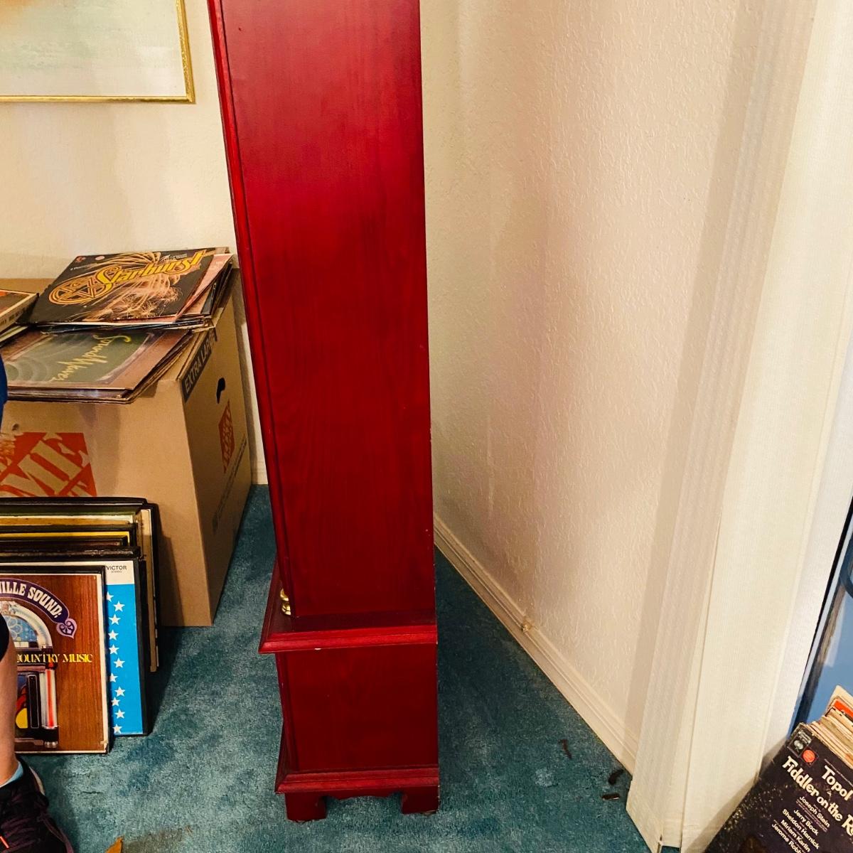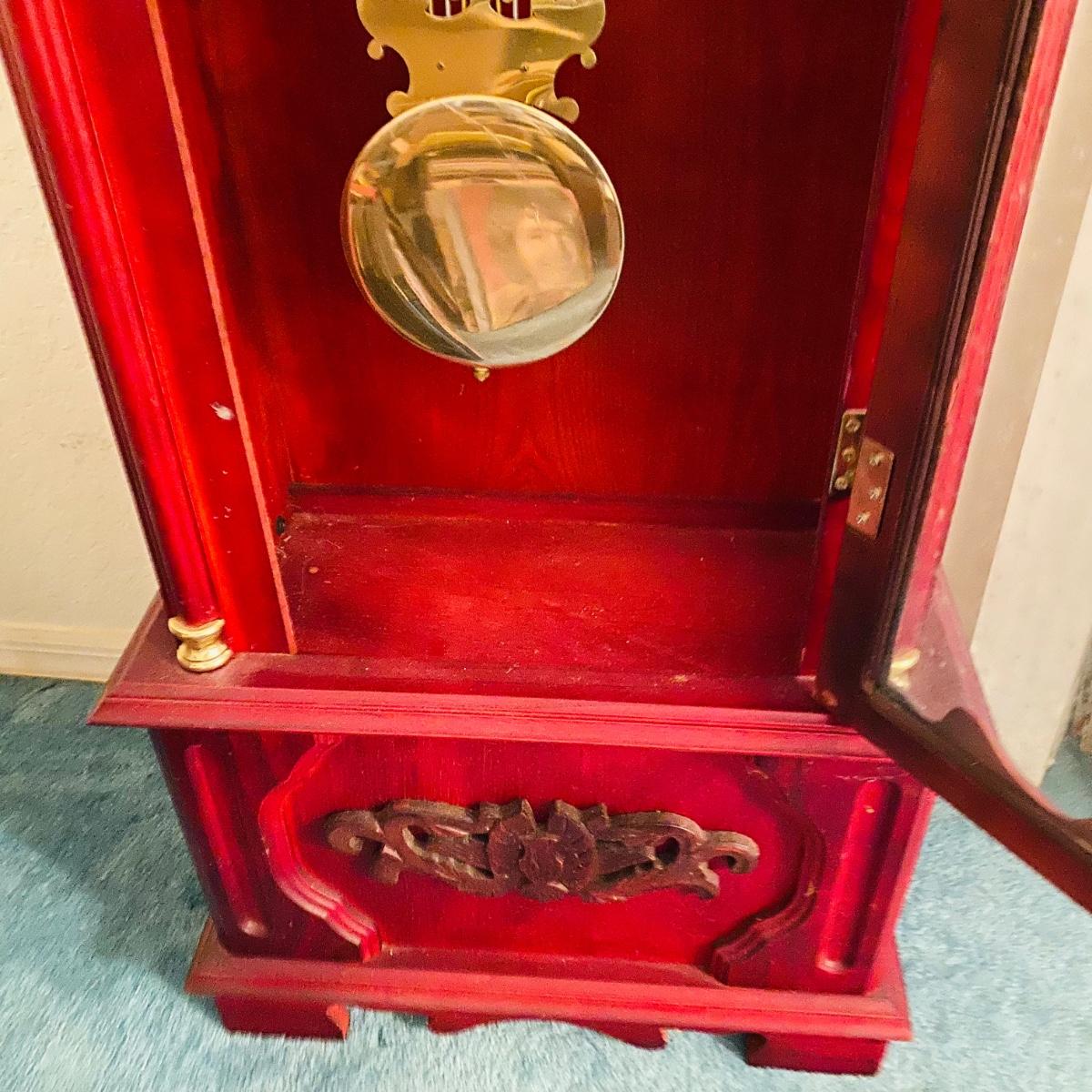 Daniel Dakota grandfather clock. Cherry wood like finish. Measures 19”L x “9 W x 79”H.