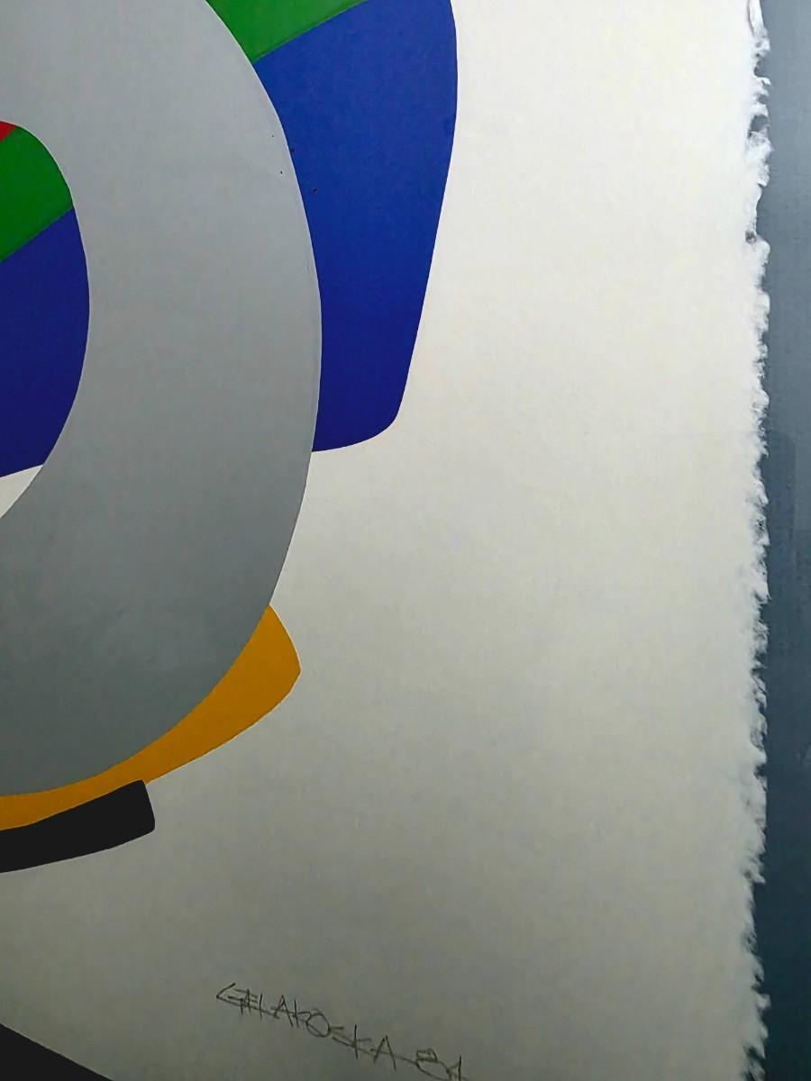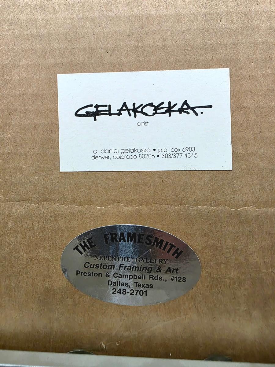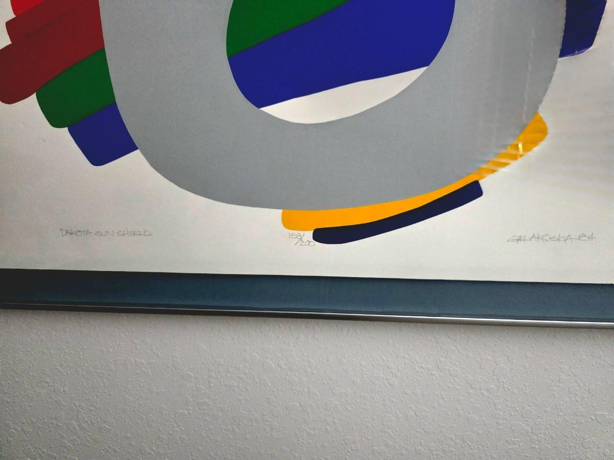 Vibrant contemporary abstract serigraph/print by Serbian American postmodern artist, Daniel Gelakoska (1944/5-2015) "Dakota Sun Shield" 1984 signed and numbered 158/200 professionally framed. Gelakoska graduated from Kendall College of Art and Design in Grand Rapids, MI and later moved to Denver, CO where he opened his gallery in 1970. His art has been showcased throughout the USA and abroad.