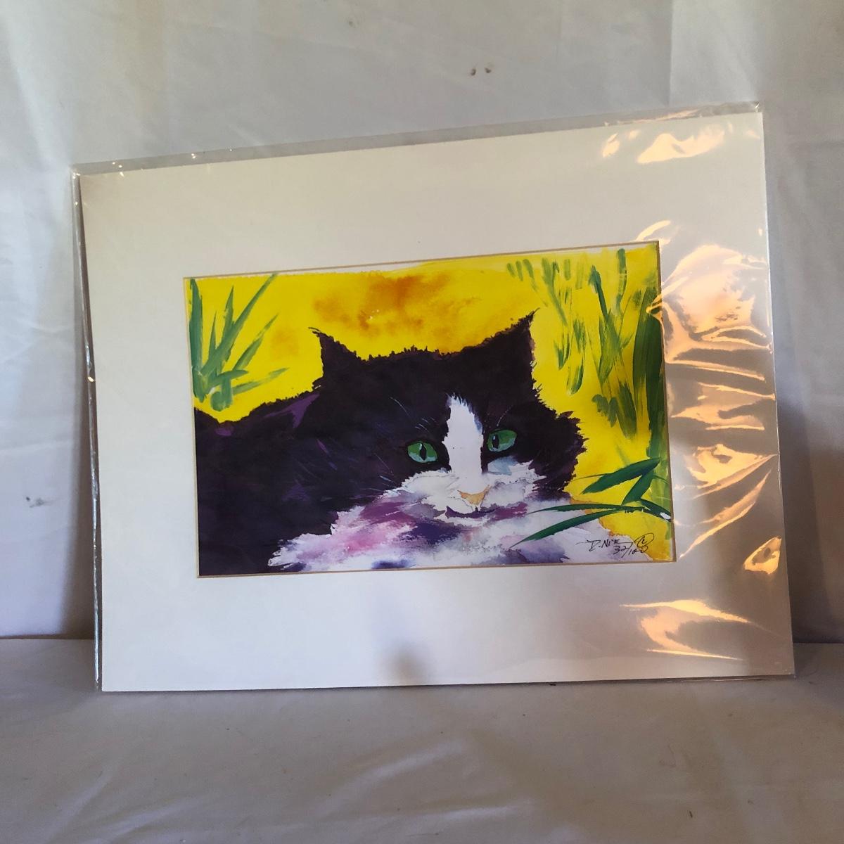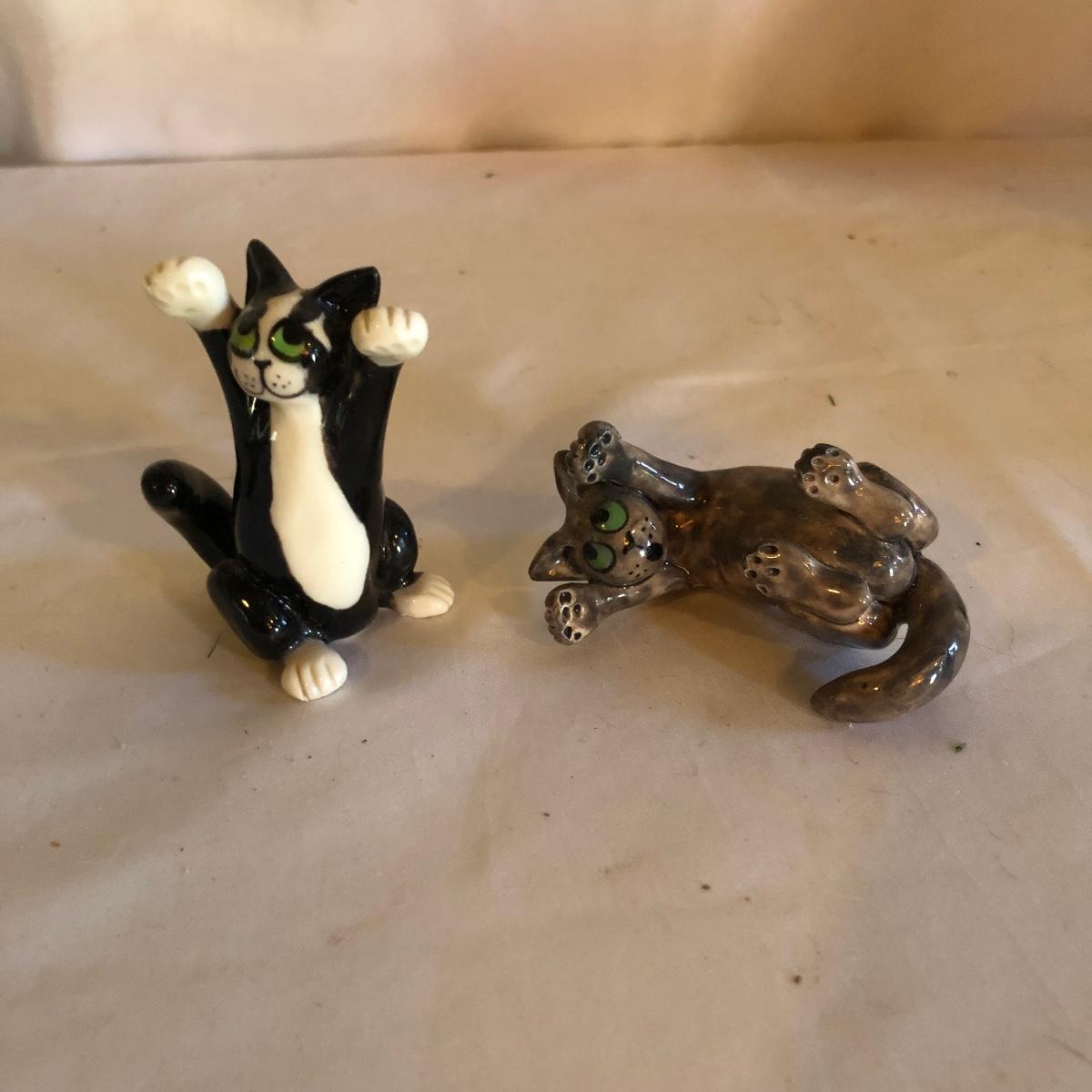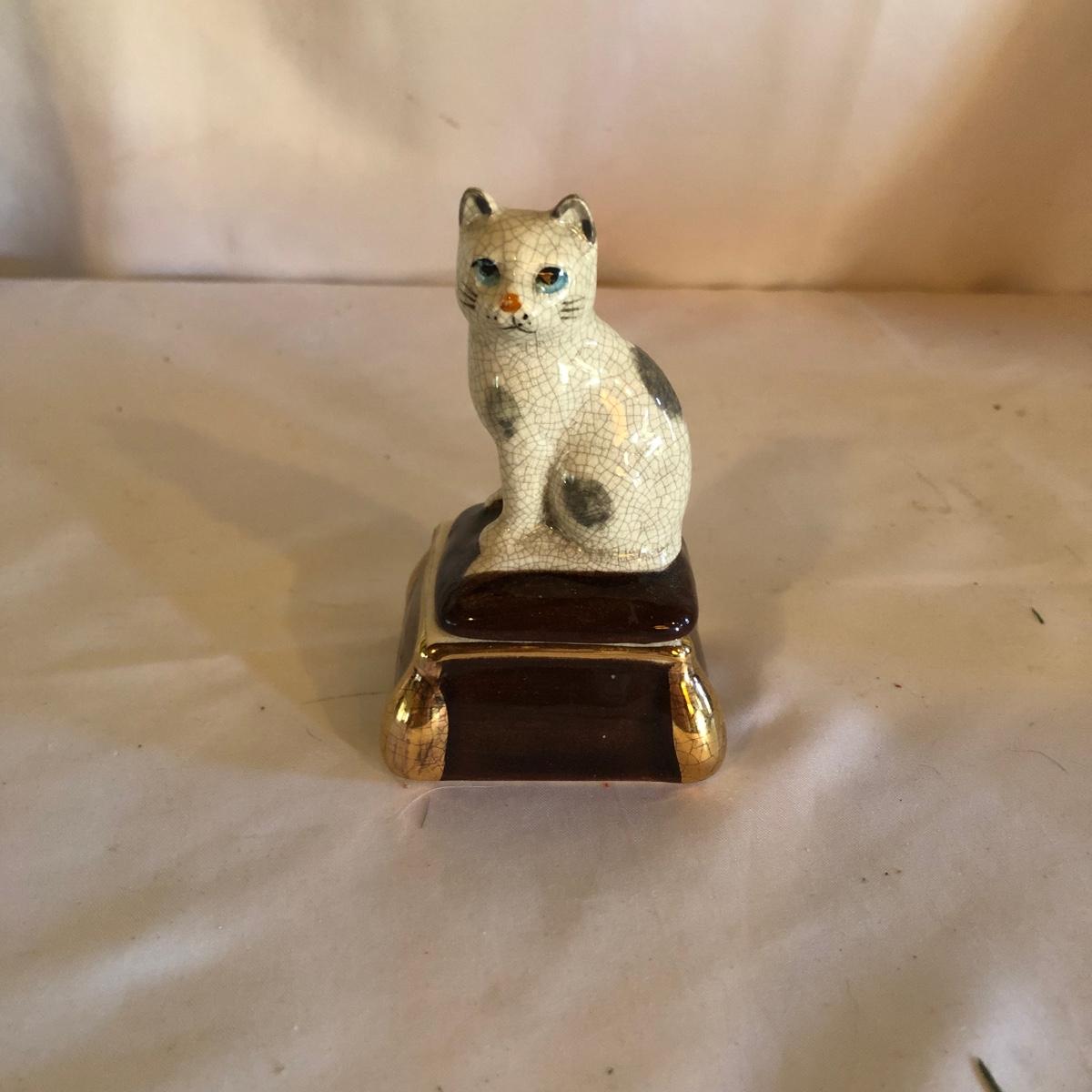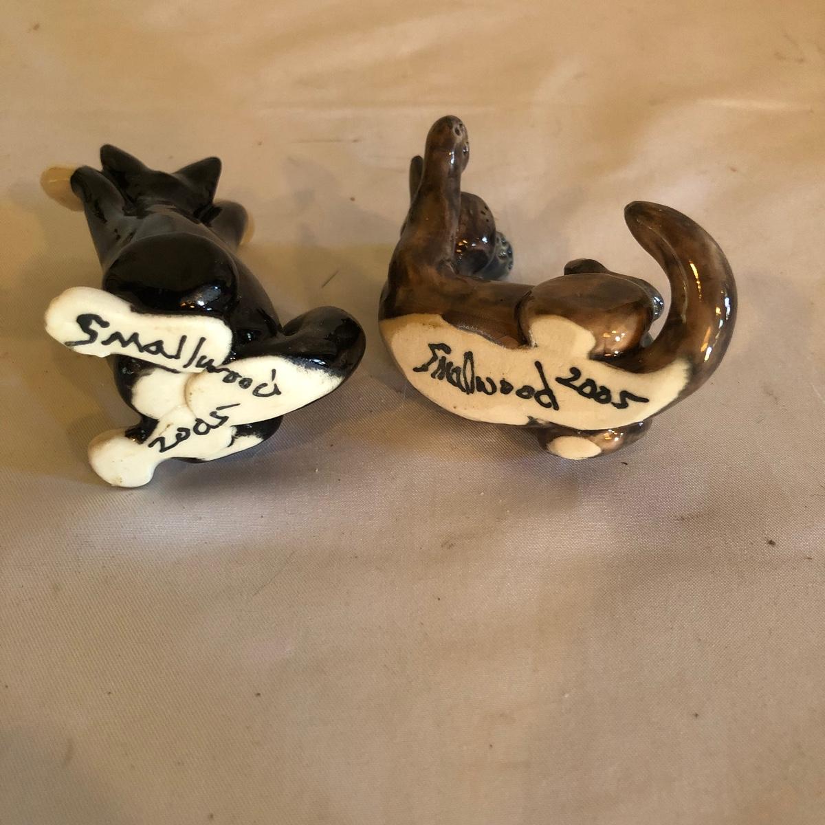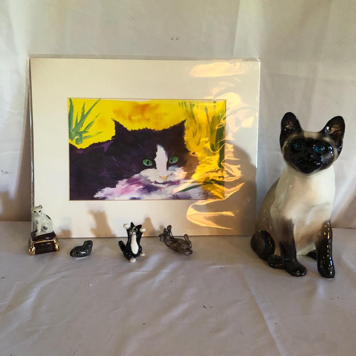 Lot includes Daniel Nie signed and numbered print, two signed Smallwood ceramic cats, Takakashi ceramic cat box and a ceramic cat made in England from Saks Fifth Ave.