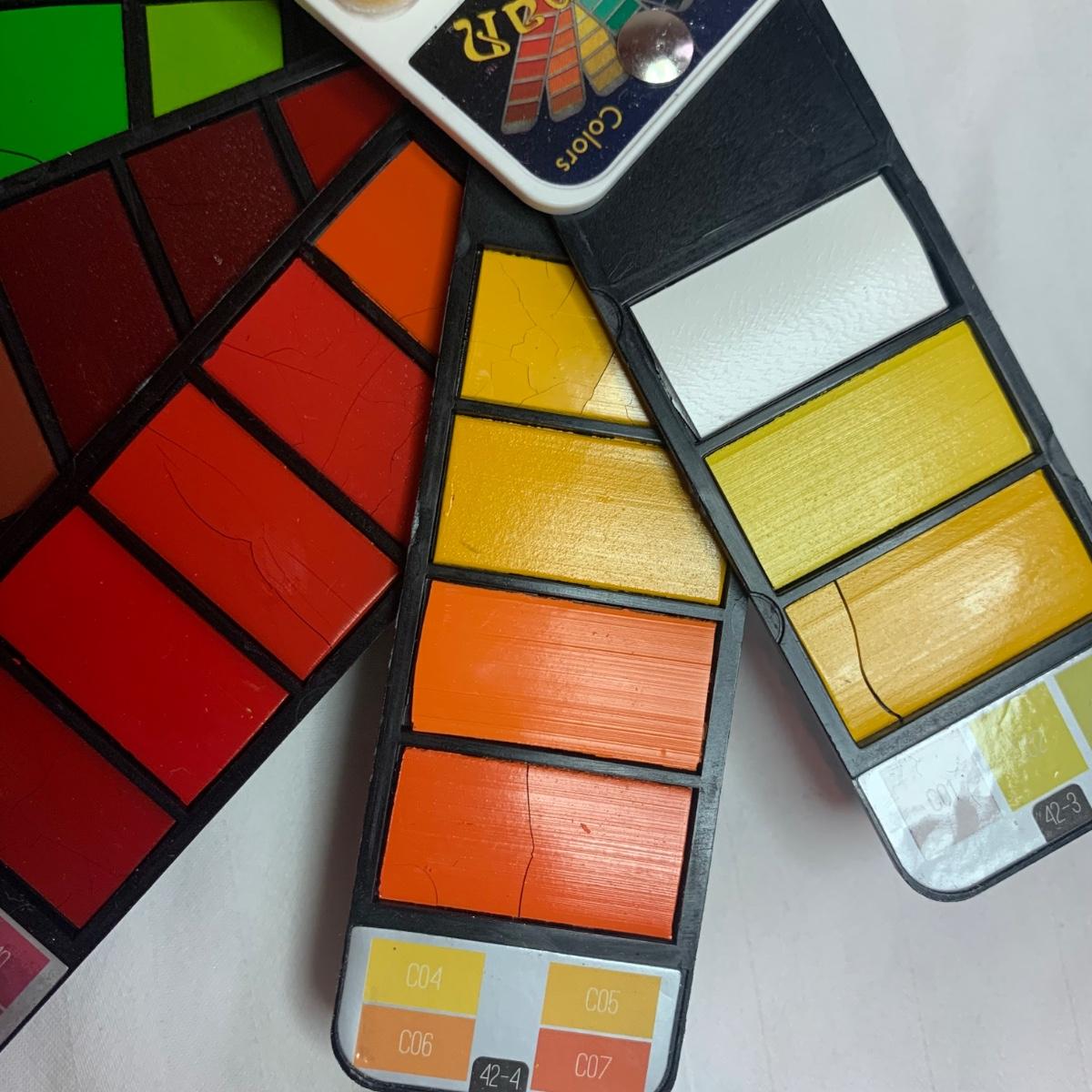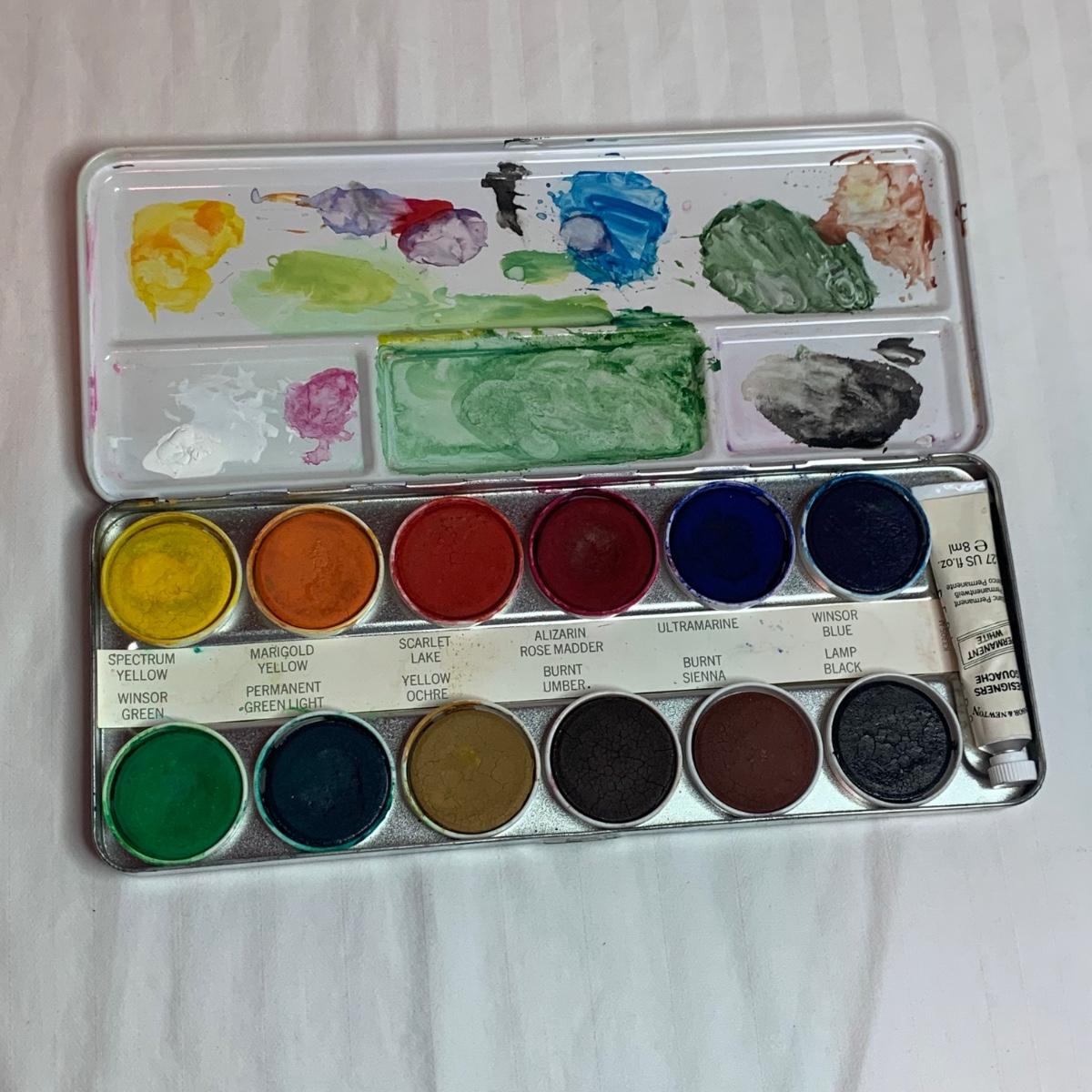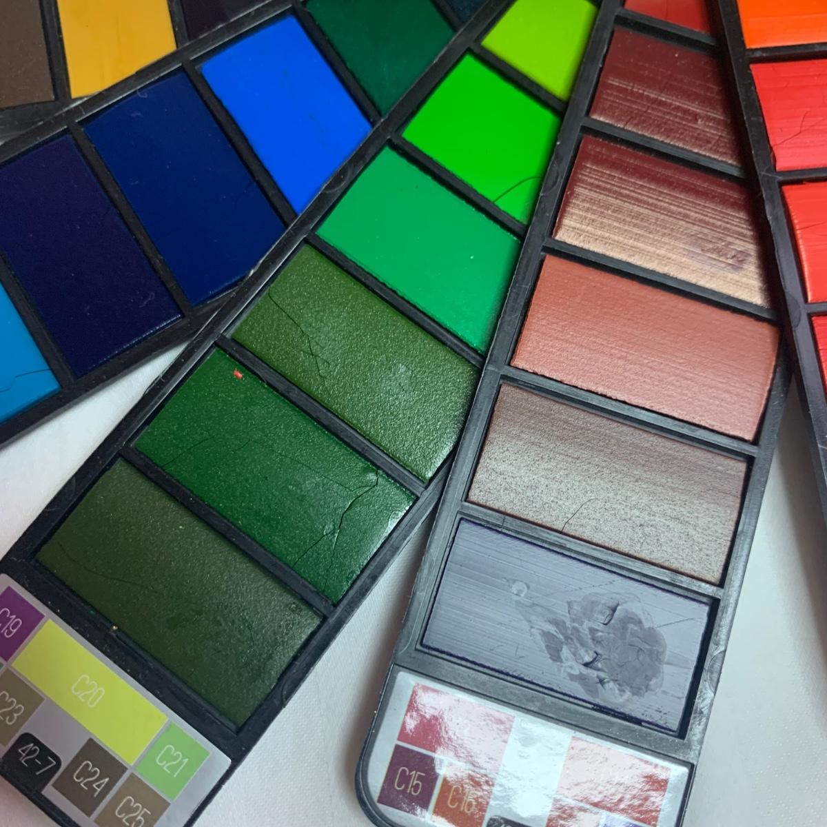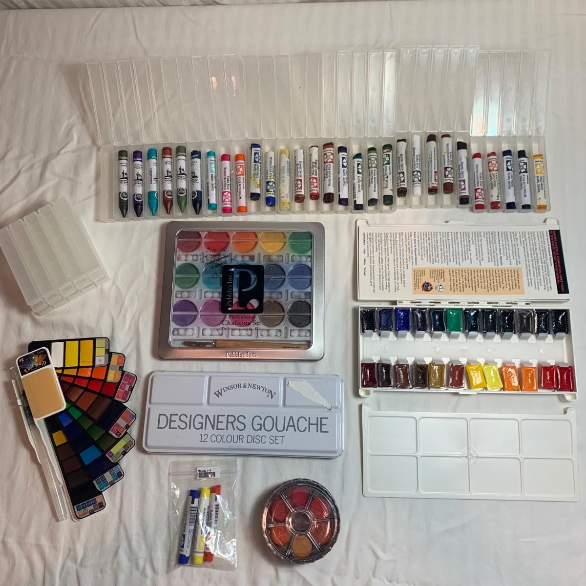 In this paint collection there are 26 Daniel Smith Extra Fine Watercolor Sticks, six Professional American Journey Artists’ Watercolor Sticks, a set of 24 Yarka St. Petersburg Artists’ Water Colours, a Pebbles Inc. Pearlescent Chalking Set, a 42 color Fan Pan set, a Koh-I-Noor Watercolor Wheel Stack Pack with 24 colors, and a Windsor & Newton Designers Gouache 12 Colour Disc Set. Some of the paints have been used, but most have not. We cannot guarantee the quality of the paints. Three empty plastic watercolor stick cases are included as well.