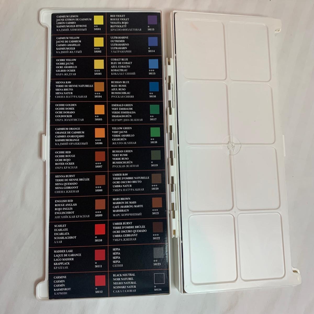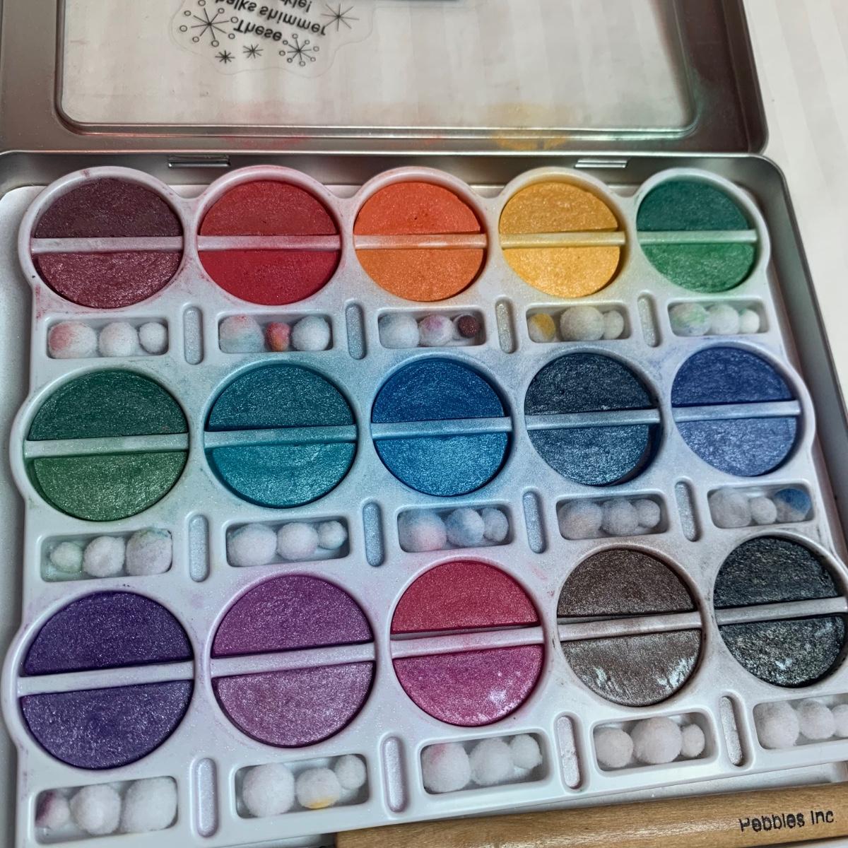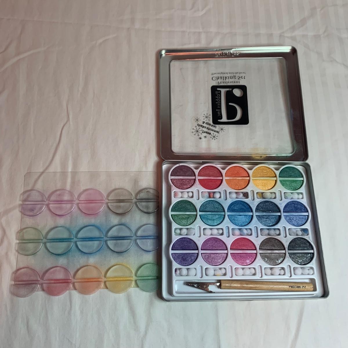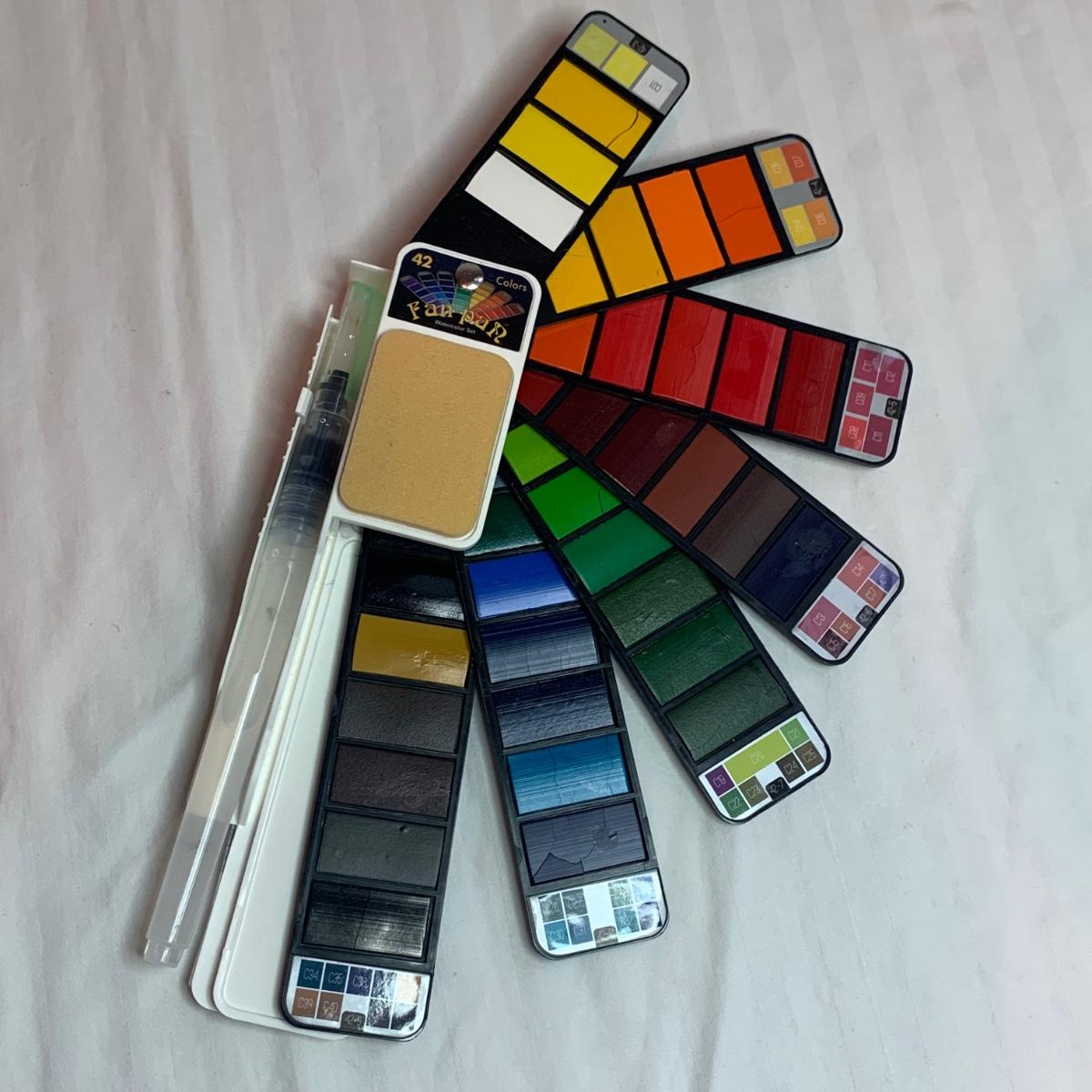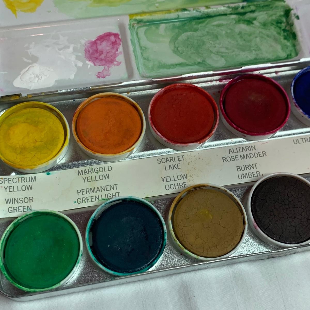 In this paint collection there are 26 Daniel Smith Extra Fine Watercolor Sticks, six Professional American Journey Artists’ Watercolor Sticks, a set of 24 Yarka St. Petersburg Artists’ Water Colours, a Pebbles Inc. Pearlescent Chalking Set, a 42 color Fan Pan set, a Koh-I-Noor Watercolor Wheel Stack Pack with 24 colors, and a Windsor & Newton Designers Gouache 12 Colour Disc Set. Some of the paints have been used, but most have not. We cannot guarantee the quality of the paints. Three empty plastic watercolor stick cases are included as well.