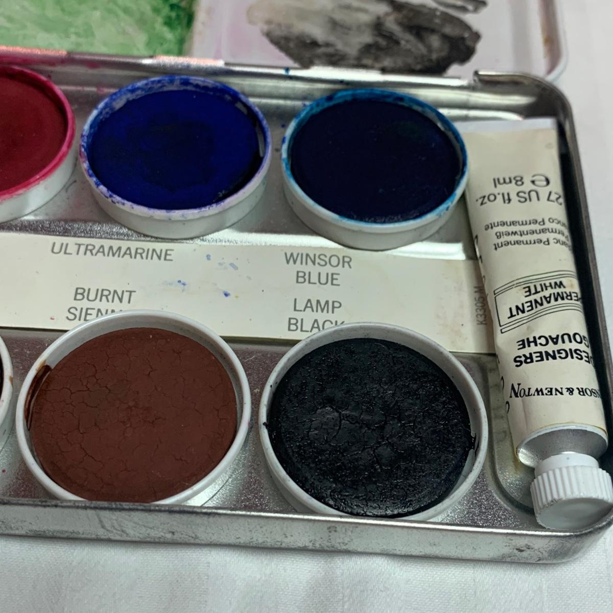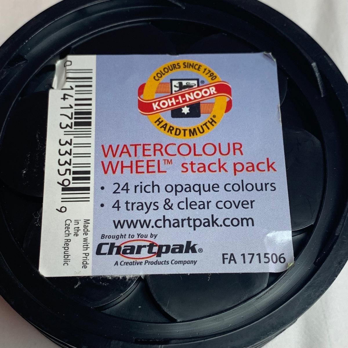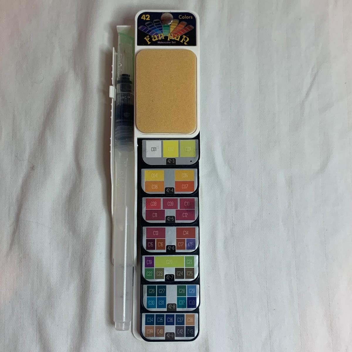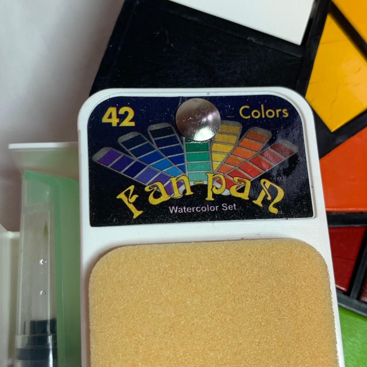In this paint collection there are 26 Daniel Smith Extra Fine Watercolor Sticks, six Professional American Journey Artists’ Watercolor Sticks, a set of 24 Yarka St. Petersburg Artists’ Water Colours, a Pebbles Inc. Pearlescent Chalking Set, a 42 color Fan Pan set, a Koh-I-Noor Watercolor Wheel Stack Pack with 24 colors, and a Windsor & Newton Designers Gouache 12 Colour Disc Set. Some of the paints have been used, but most have not. We cannot guarantee the quality of the paints. Three empty plastic watercolor stick cases are included as well.