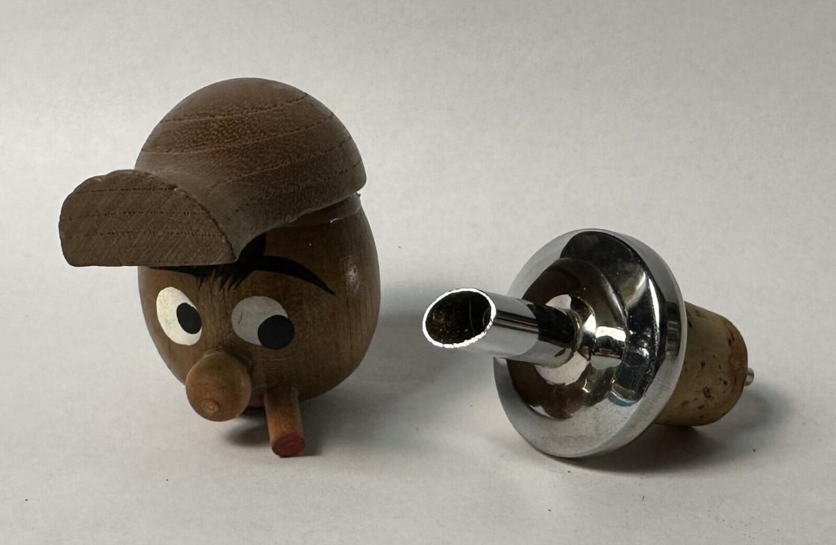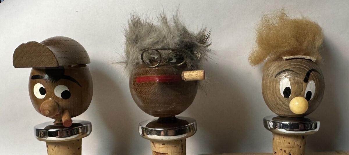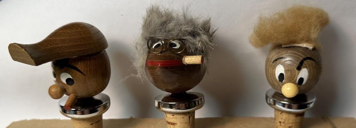three(3) character bottle stoppers with hidden pour spouts in the style of Danish designer Hans Bolling...As shown...Mid Century.