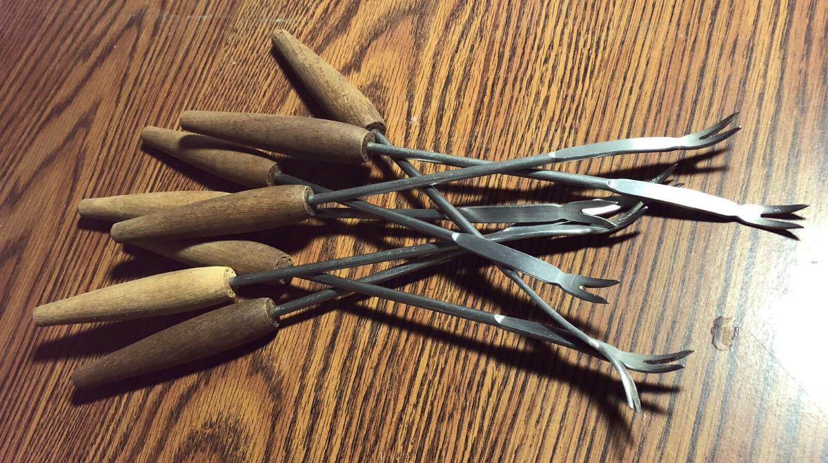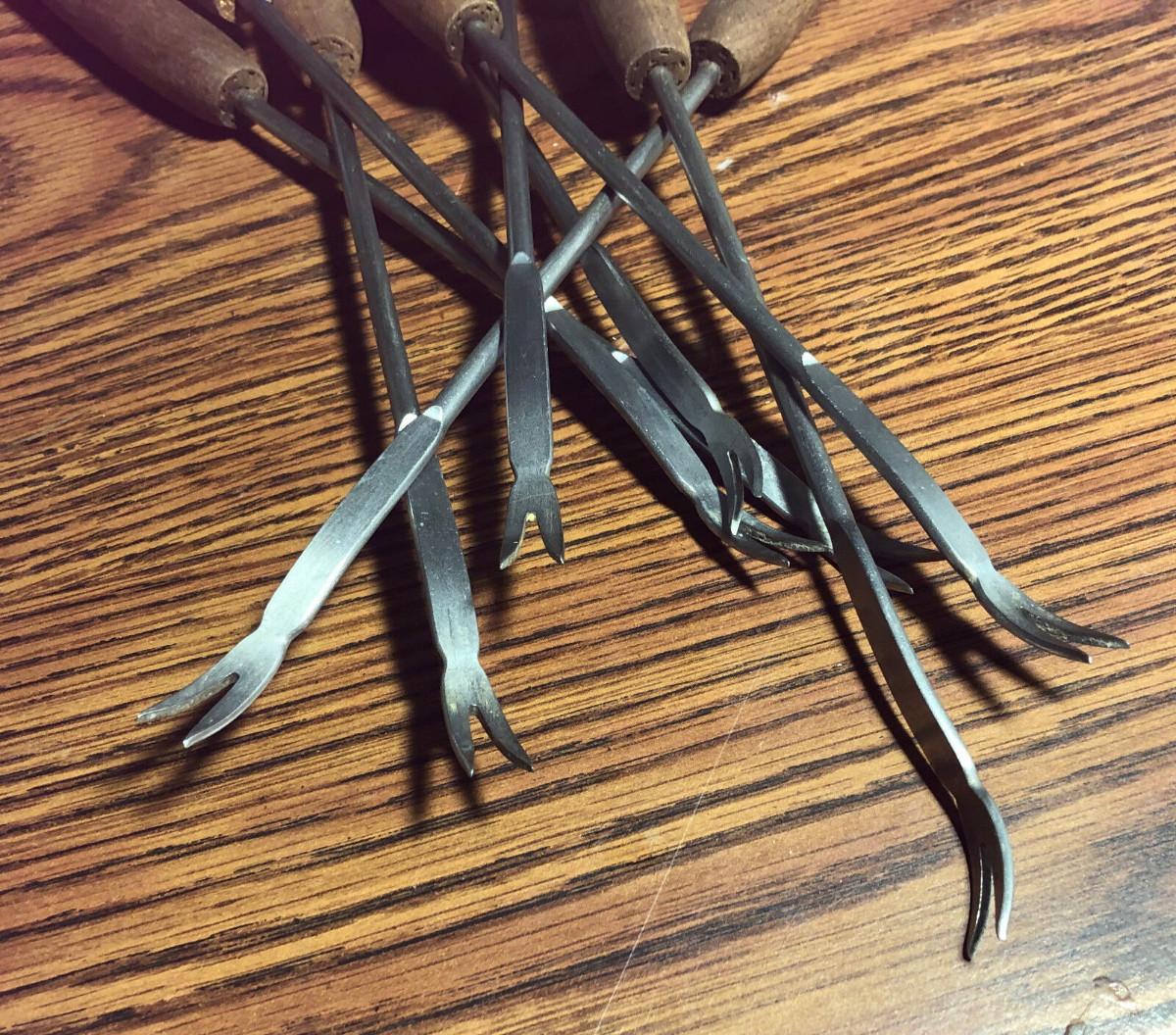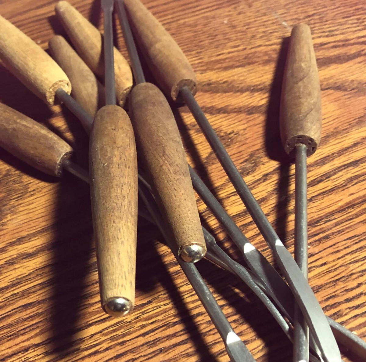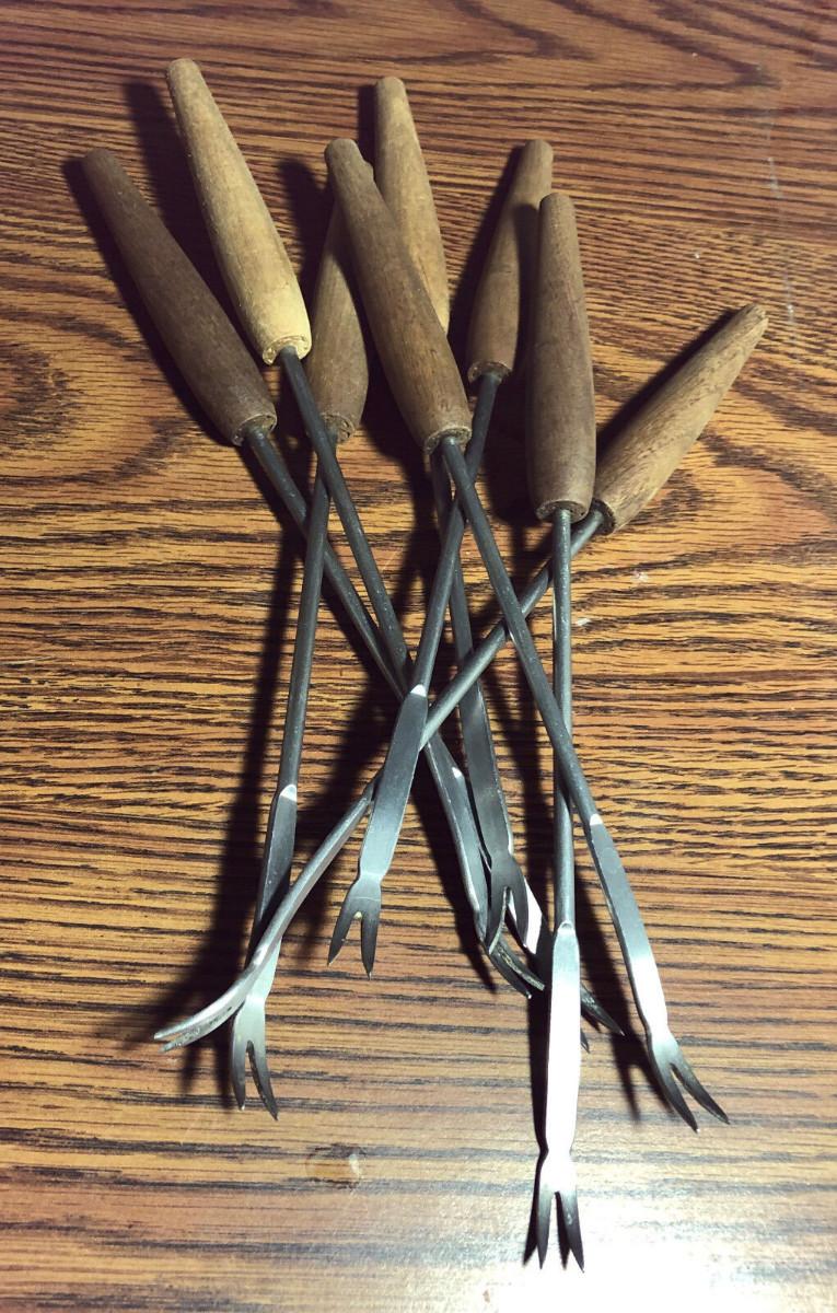 Not the usual flimsy type but solid steel and wood 11.25" long Fondue Forks....Danish Modern style...Vintage...Unknown maker....Set of eight(8)