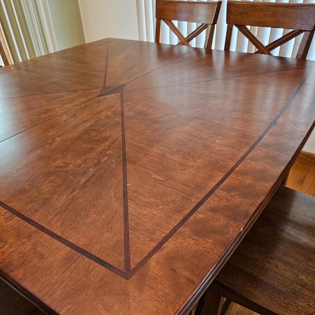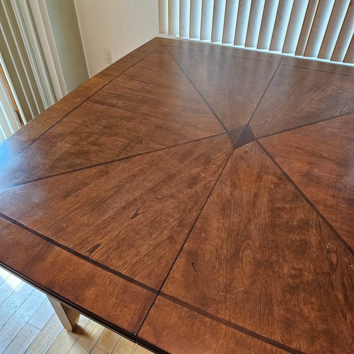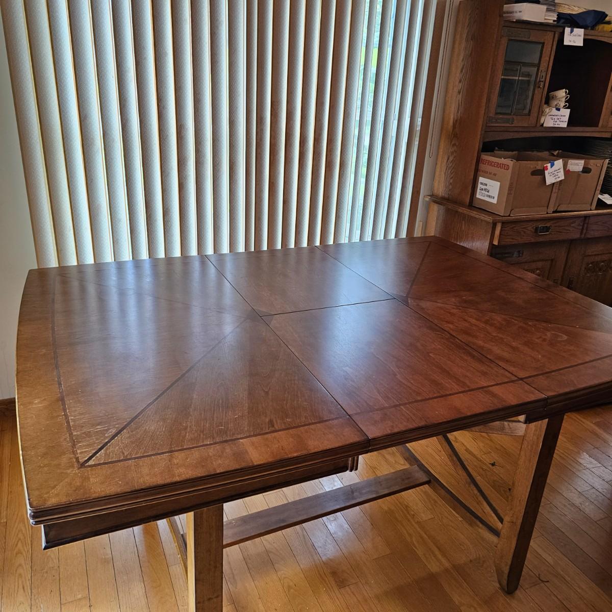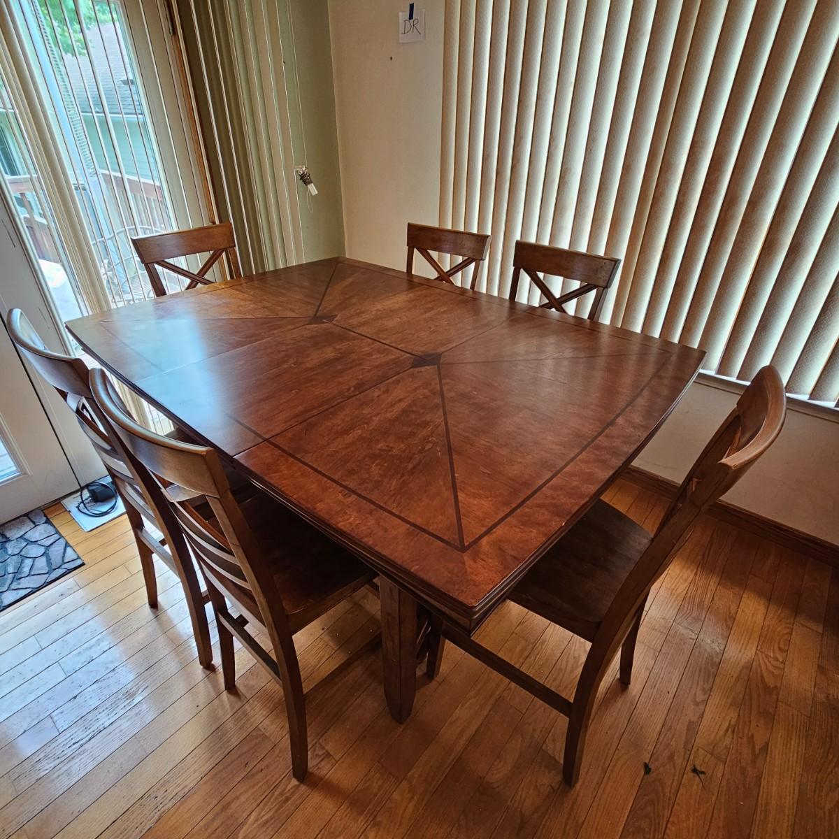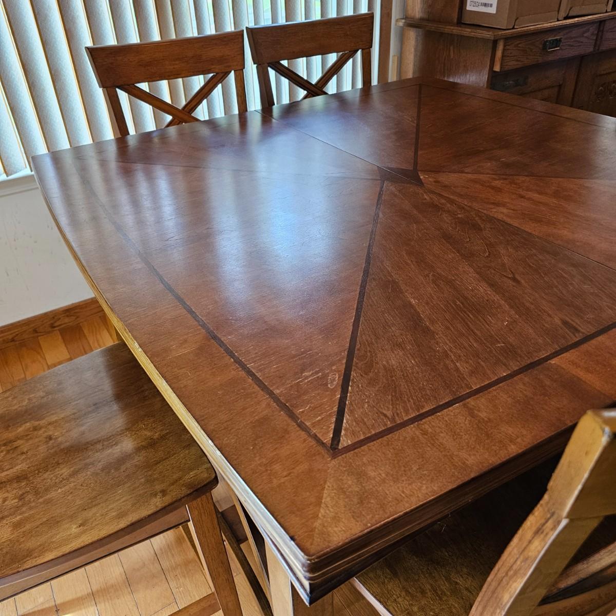 Solid wood table and chairs, table has distinctive diamond pattern and hidden leaf in center. Closed, table measures 48" x 48" x 36"H, with leaf open is 66" x 48" x 36"H. Chairs are 18" x 22" x 43"H with 24" seat height. Some small nicks and blemishes on table edges and on chairs. See photos for details. Local pickup only.