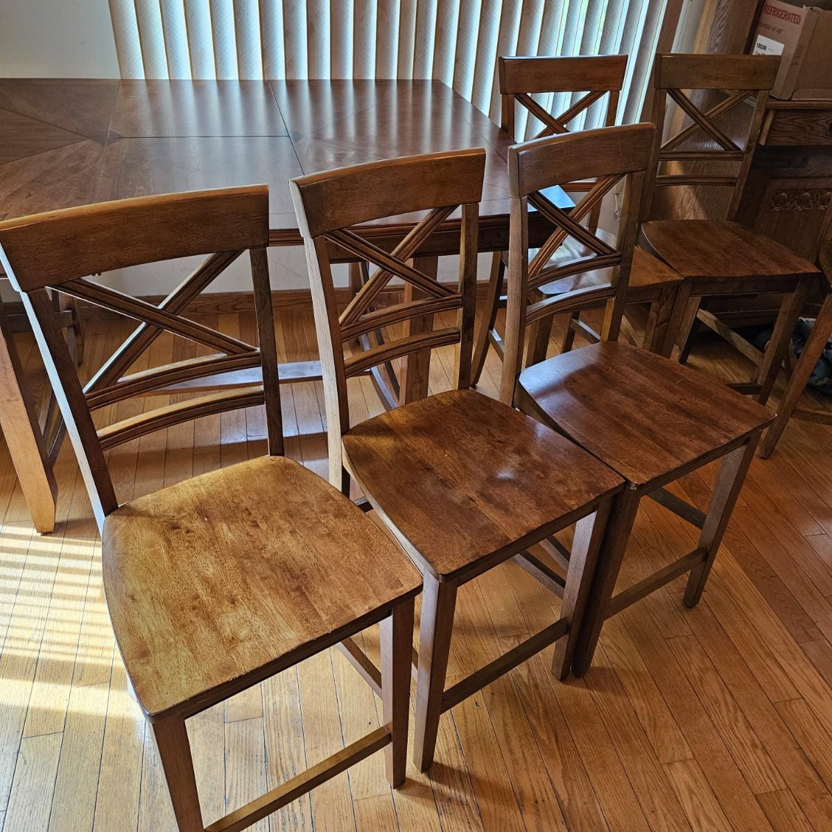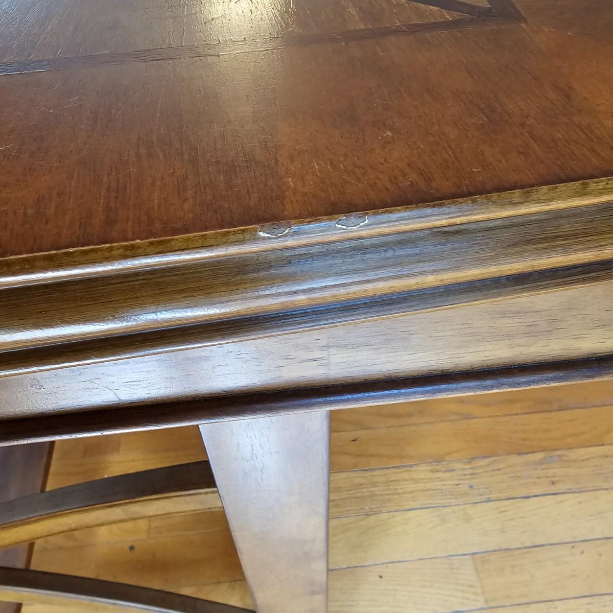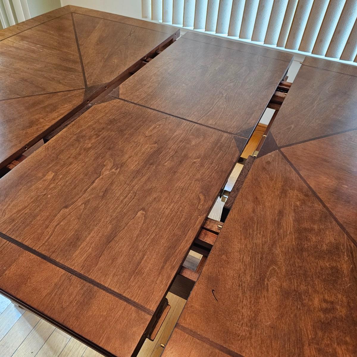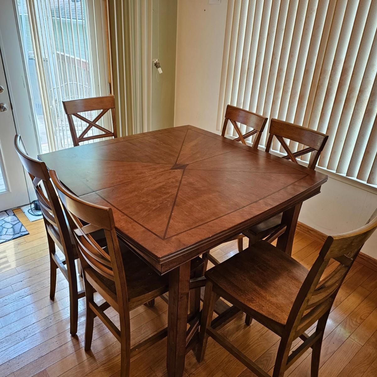Solid wood table and chairs, table has distinctive diamond pattern and hidden leaf in center. Closed, table measures 48" x 48" x 36"H, with leaf open is 66" x 48" x 36"H. Chairs are 18" x 22" x 43"H with 24" seat height. Some small nicks and blemishes on table edges and on chairs. See photos for details. Local pickup only.