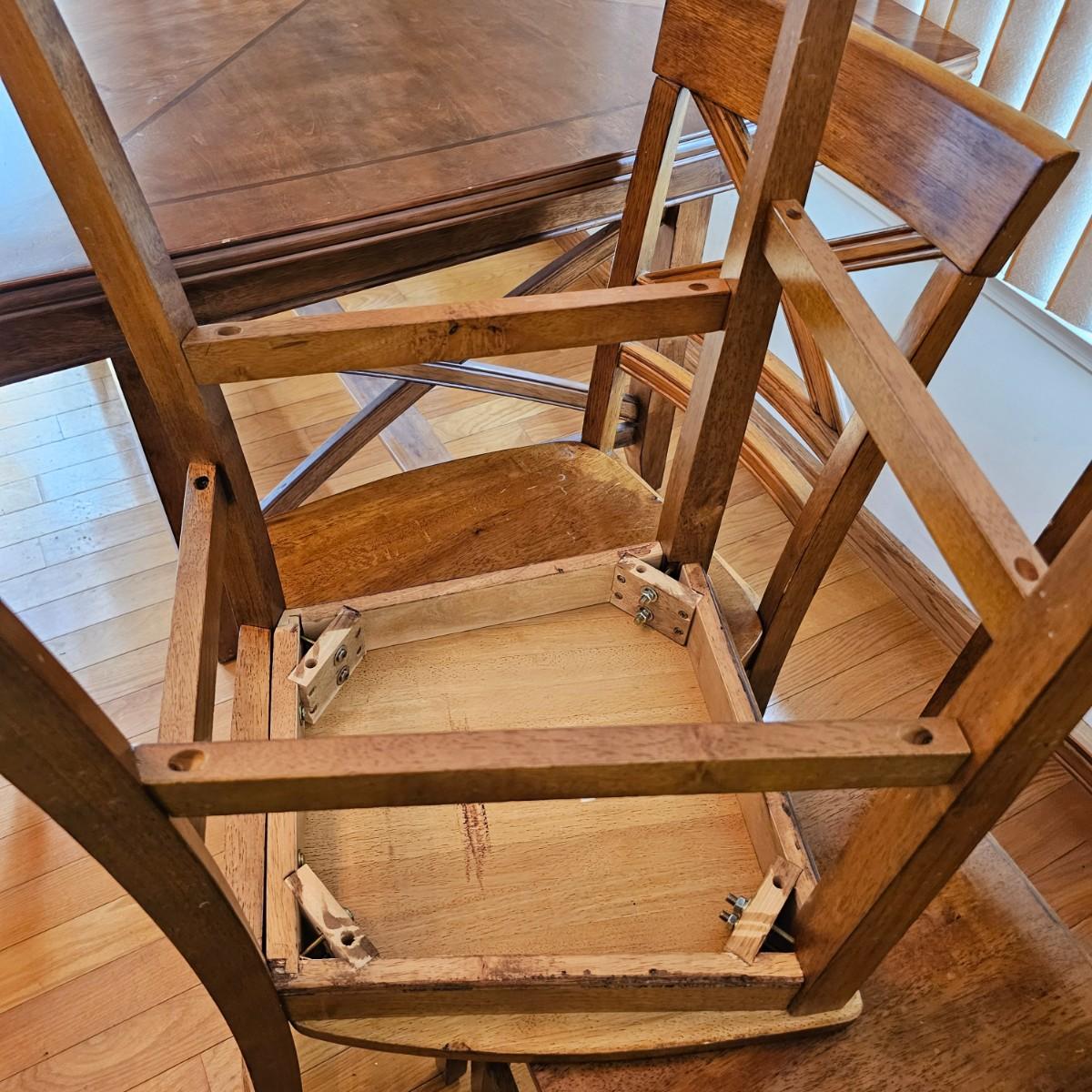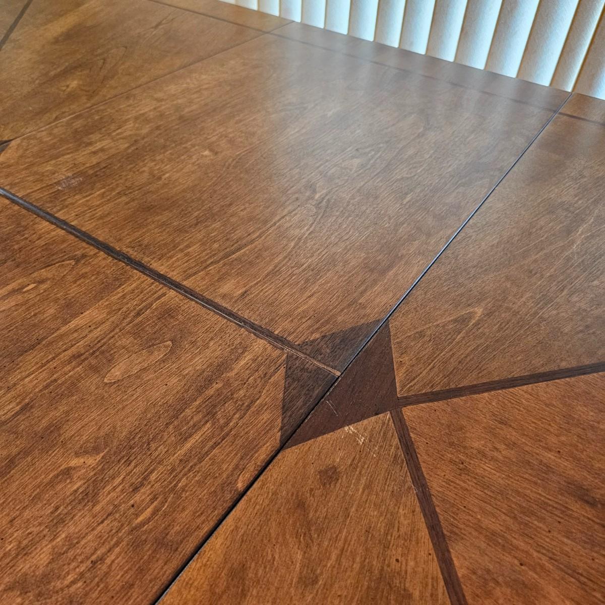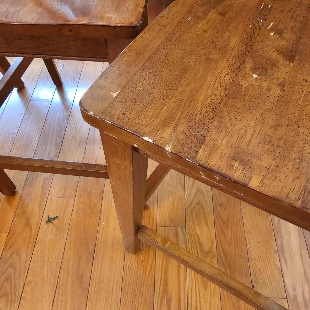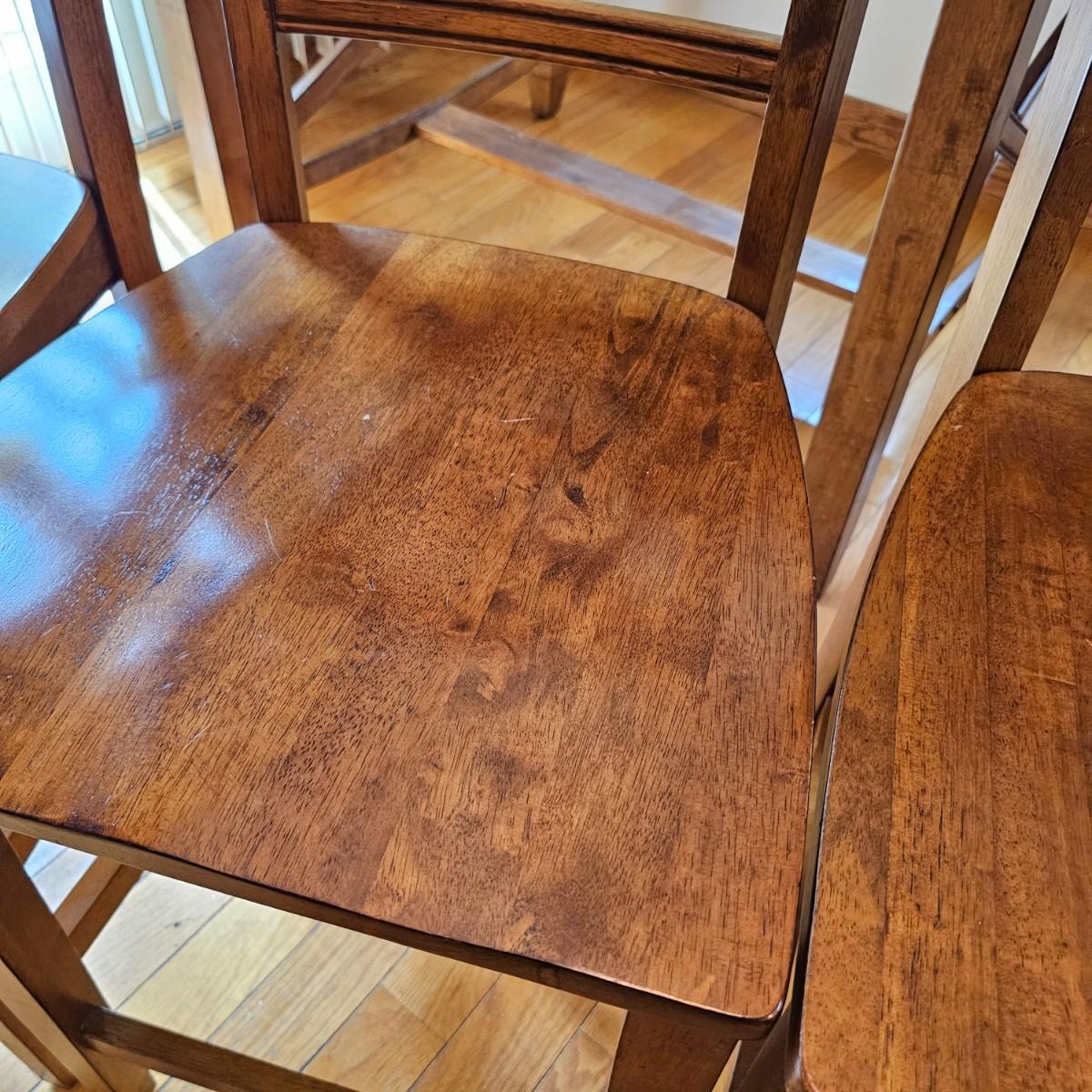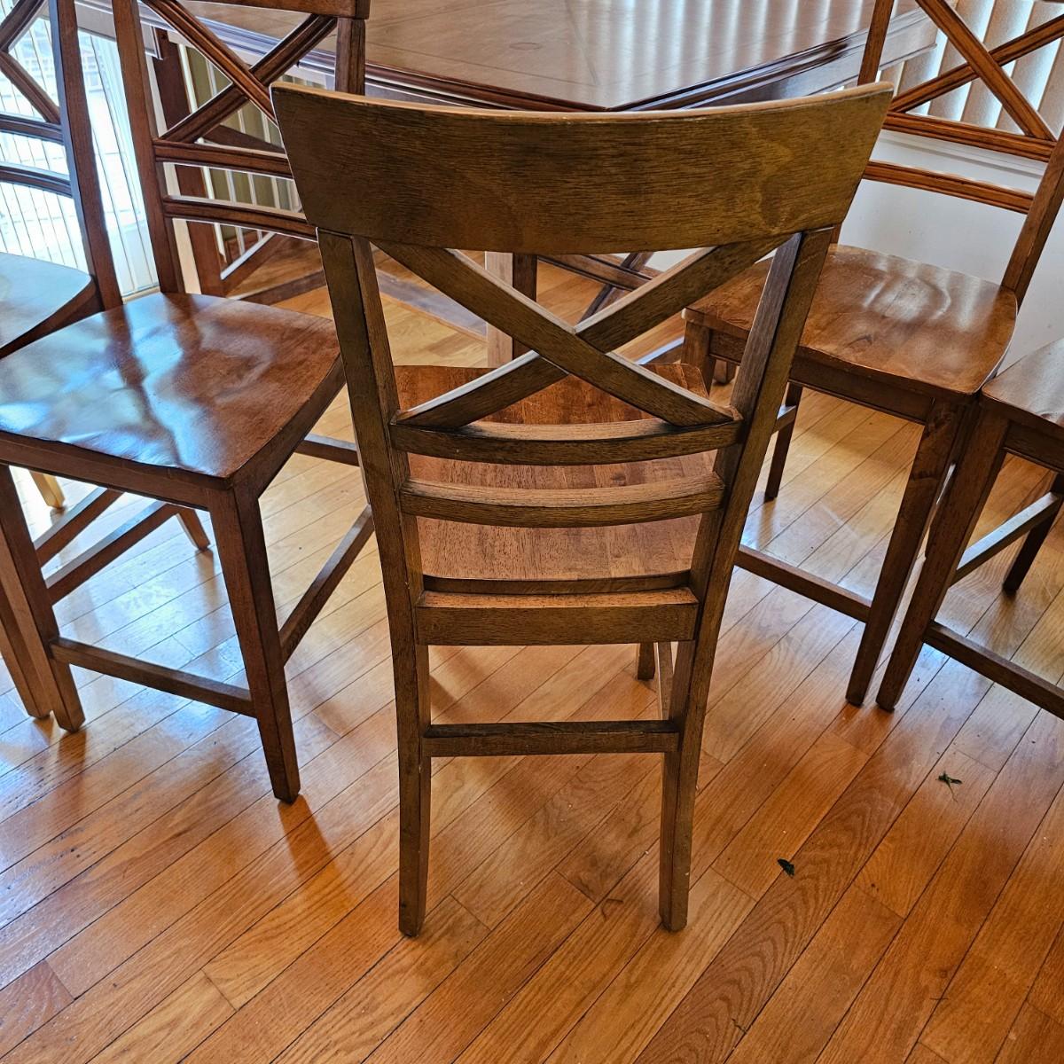Solid wood table and chairs, table has distinctive diamond pattern and hidden leaf in center. Closed, table measures 48" x 48" x 36"H, with leaf open is 66" x 48" x 36"H. Chairs are 18" x 22" x 43"H with 24" seat height. Some small nicks and blemishes on table edges and on chairs. See photos for details. Local pickup only.