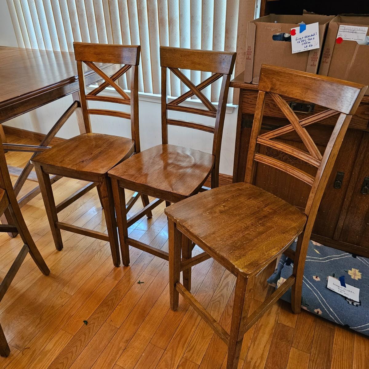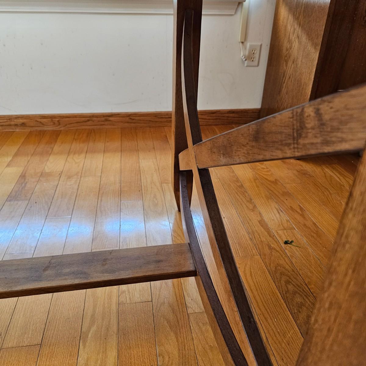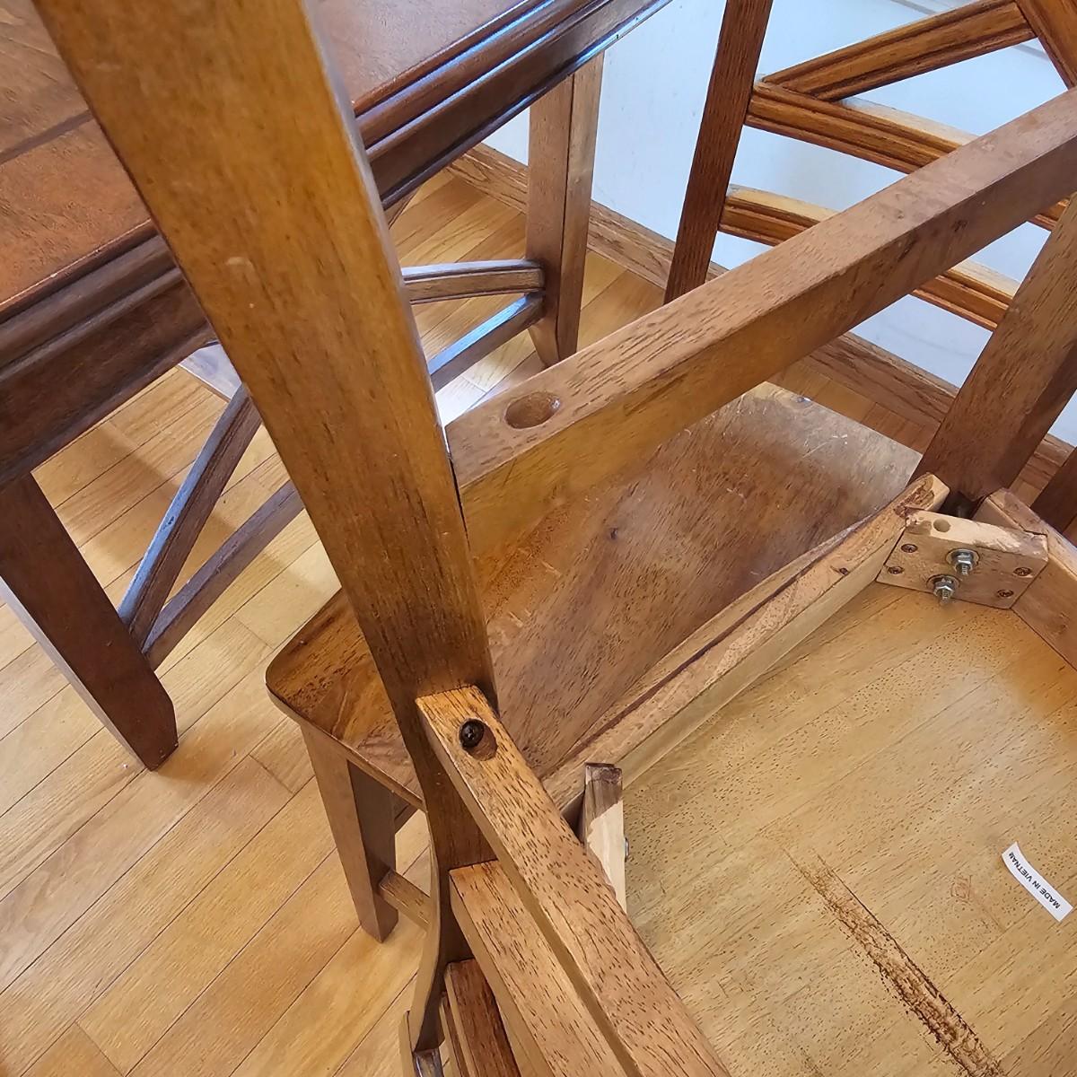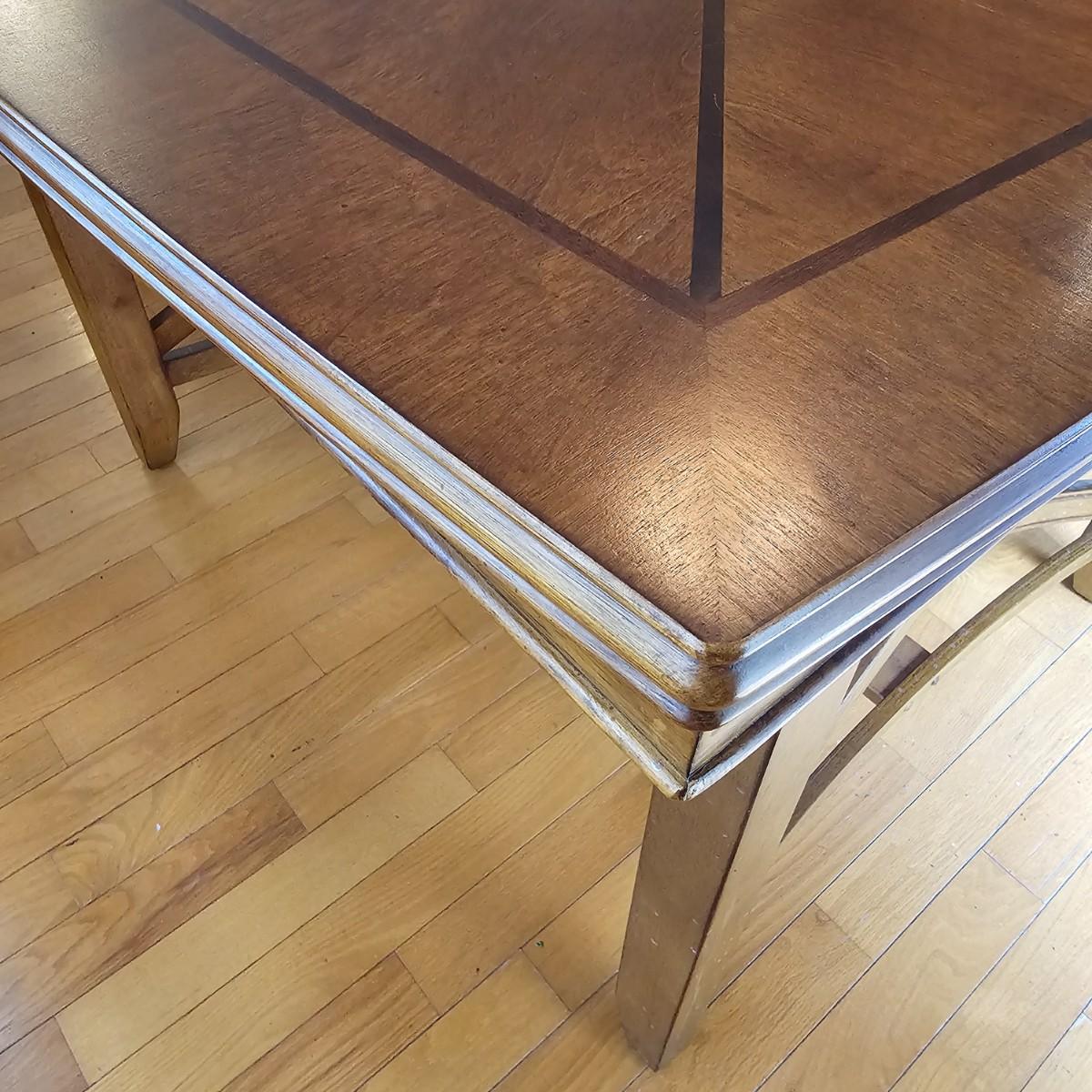 Solid wood table and chairs, table has distinctive diamond pattern and hidden leaf in center. Closed, table measures 48" x 48" x 36"H, with leaf open is 66" x 48" x 36"H. Chairs are 18" x 22" x 43"H with 24" seat height. Some small nicks and blemishes on table edges and on chairs. See photos for details. Local pickup only.