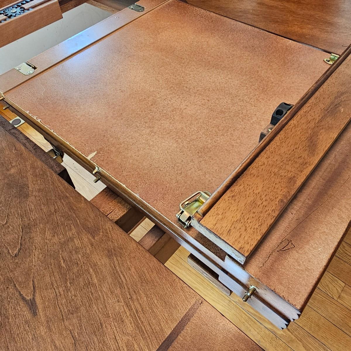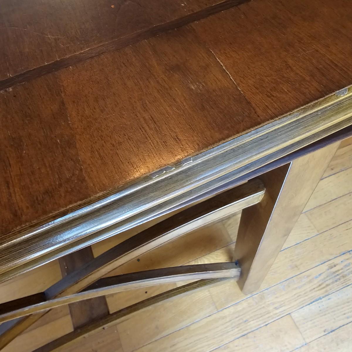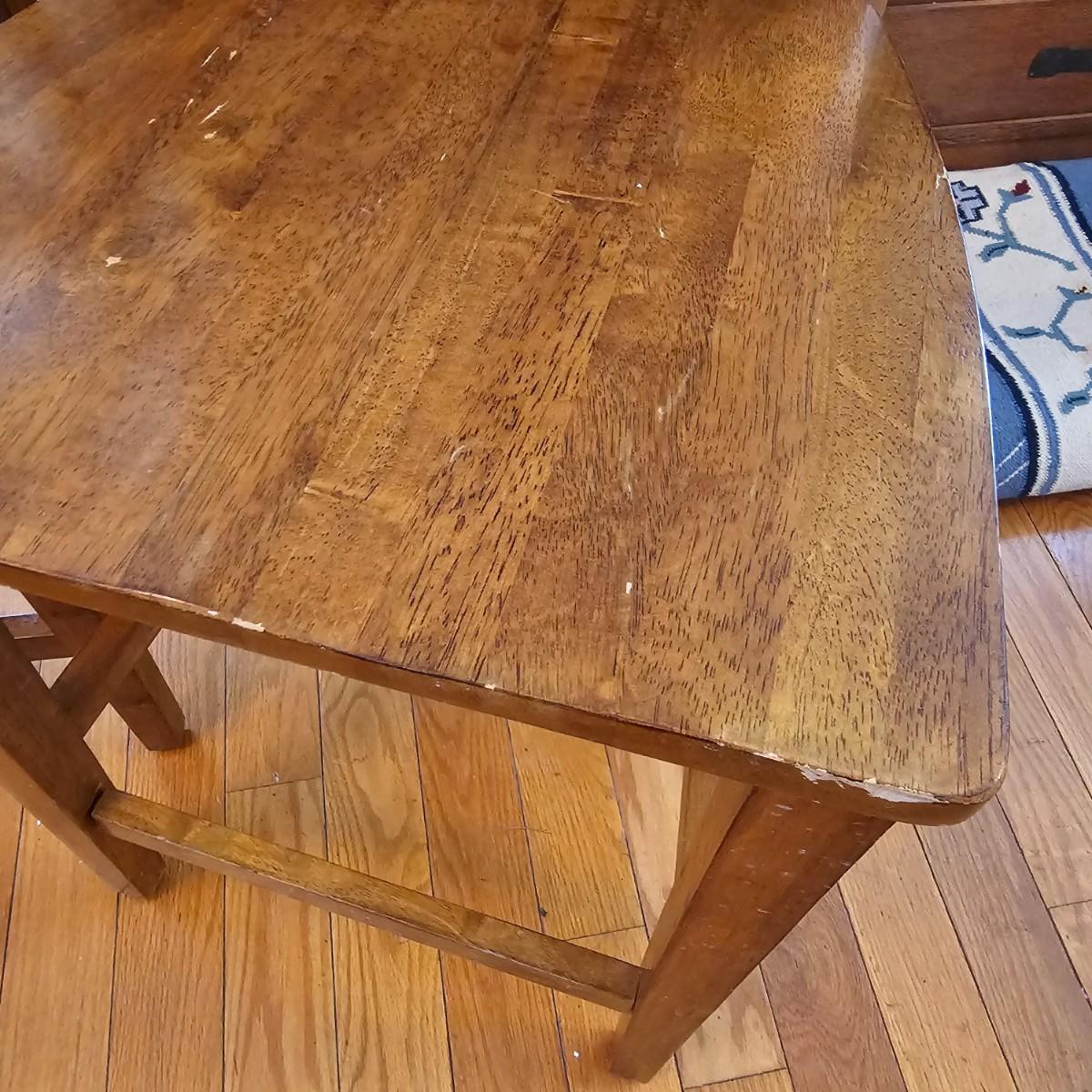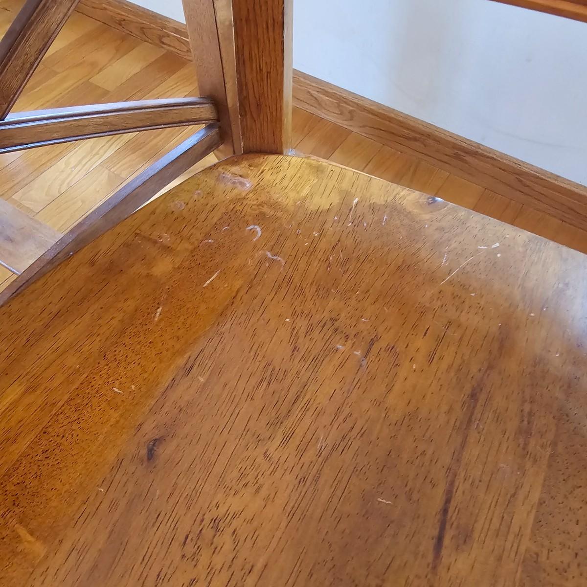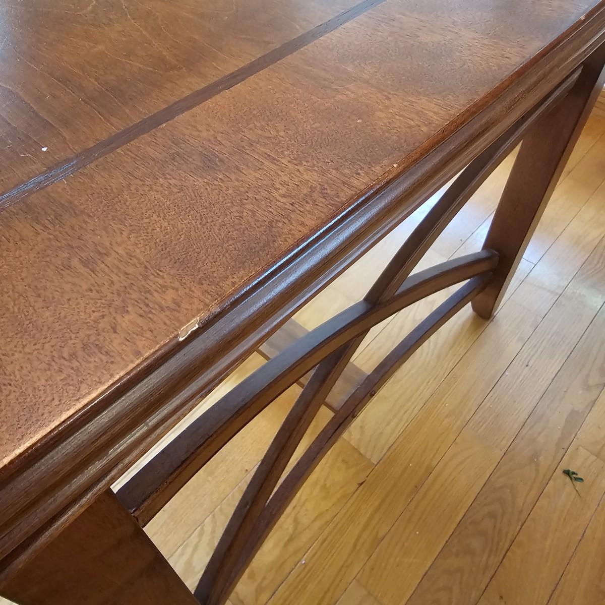 Solid wood table and chairs, table has distinctive diamond pattern and hidden leaf in center. Closed, table measures 48" x 48" x 36"H, with leaf open is 66" x 48" x 36"H. Chairs are 18" x 22" x 43"H with 24" seat height. Some small nicks and blemishes on table edges and on chairs. See photos for details. Local pickup only.