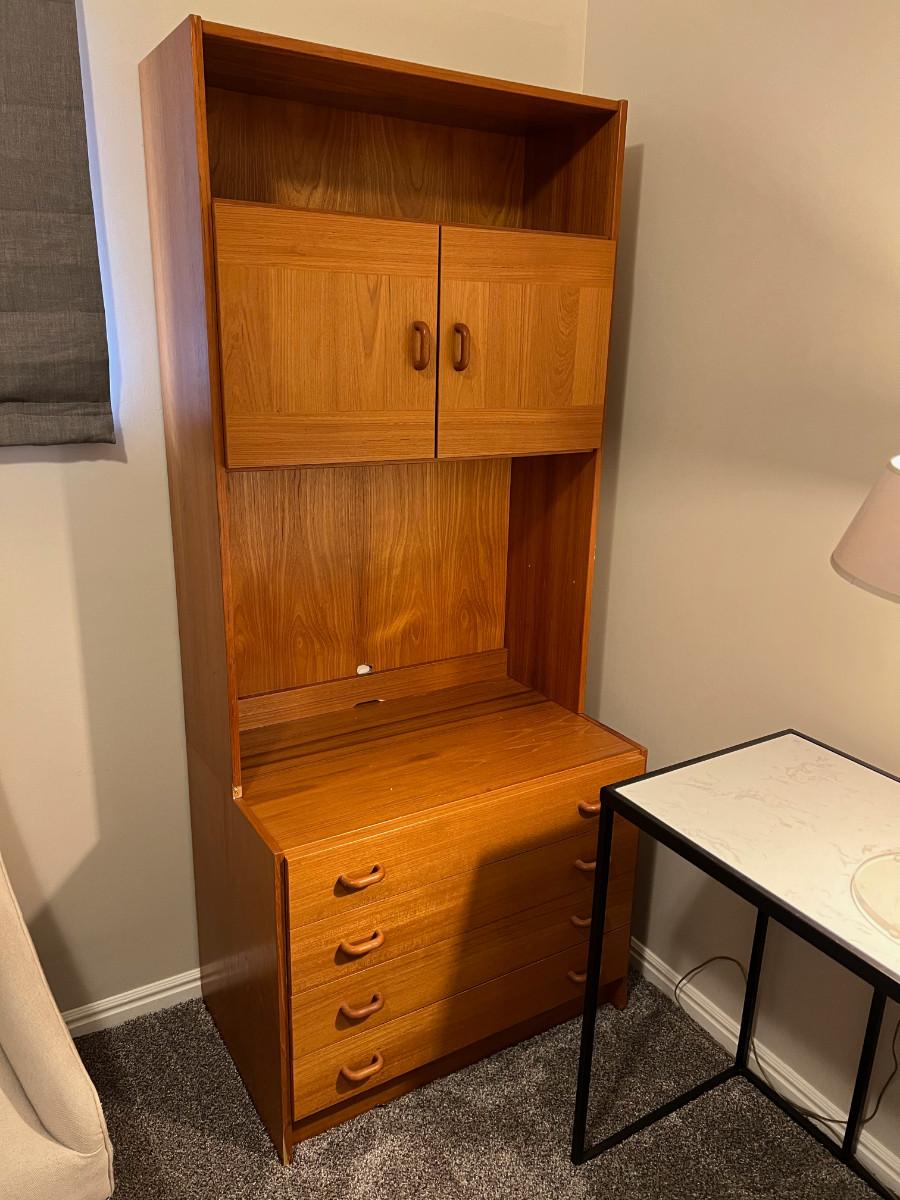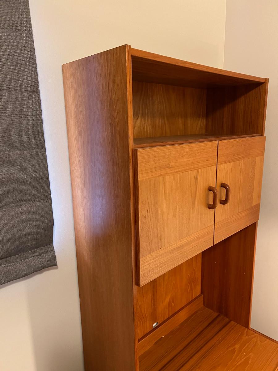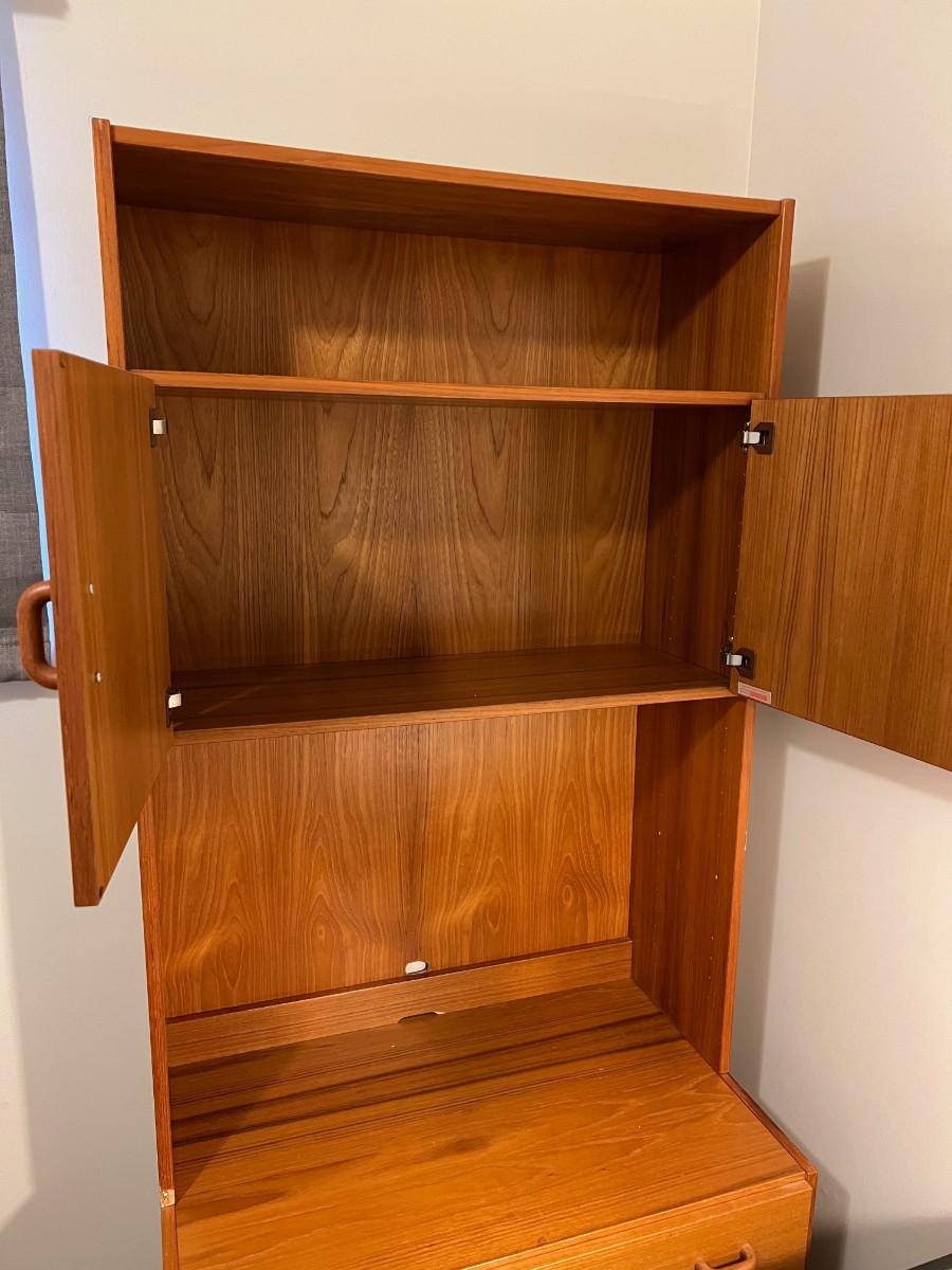 Good condition teak bookcase cabinet. Domino Mobler Denmark. Light wear from use, a couple of chips to the wood. 72” tall 32” wide 21” deep. Top lifts off for easy moving 2 separate pieces.