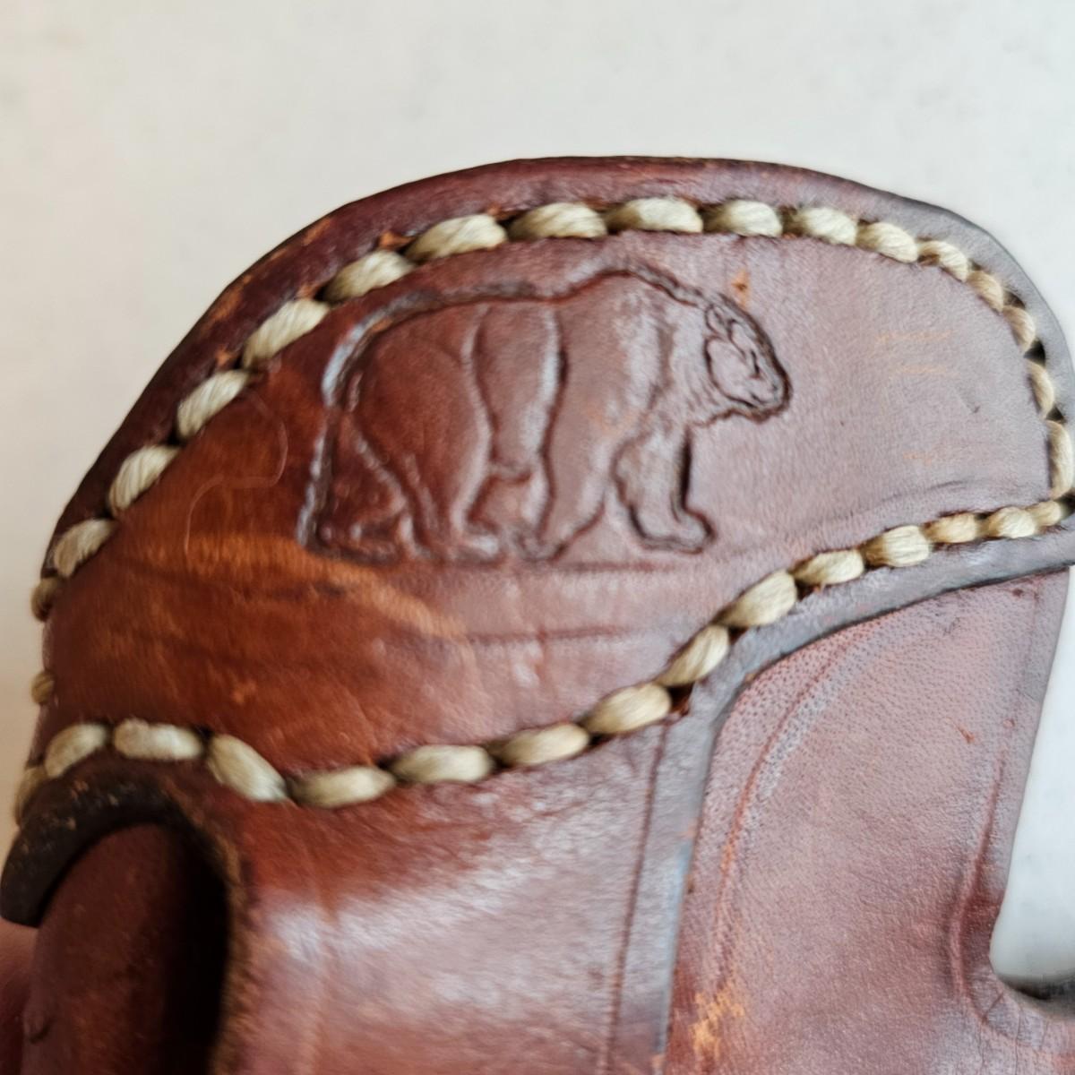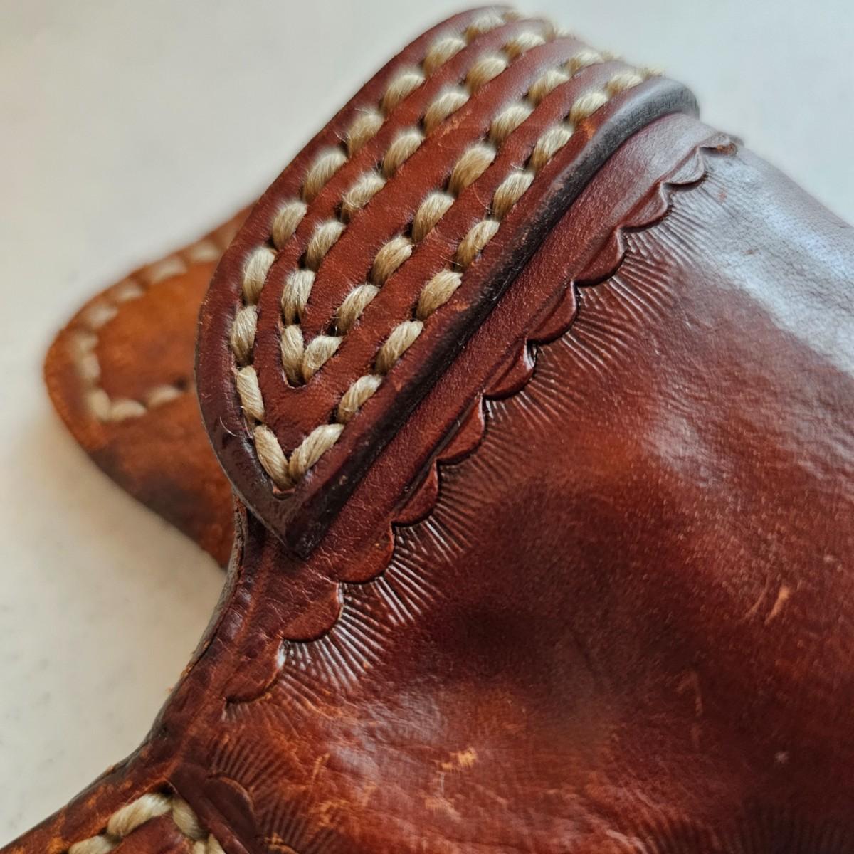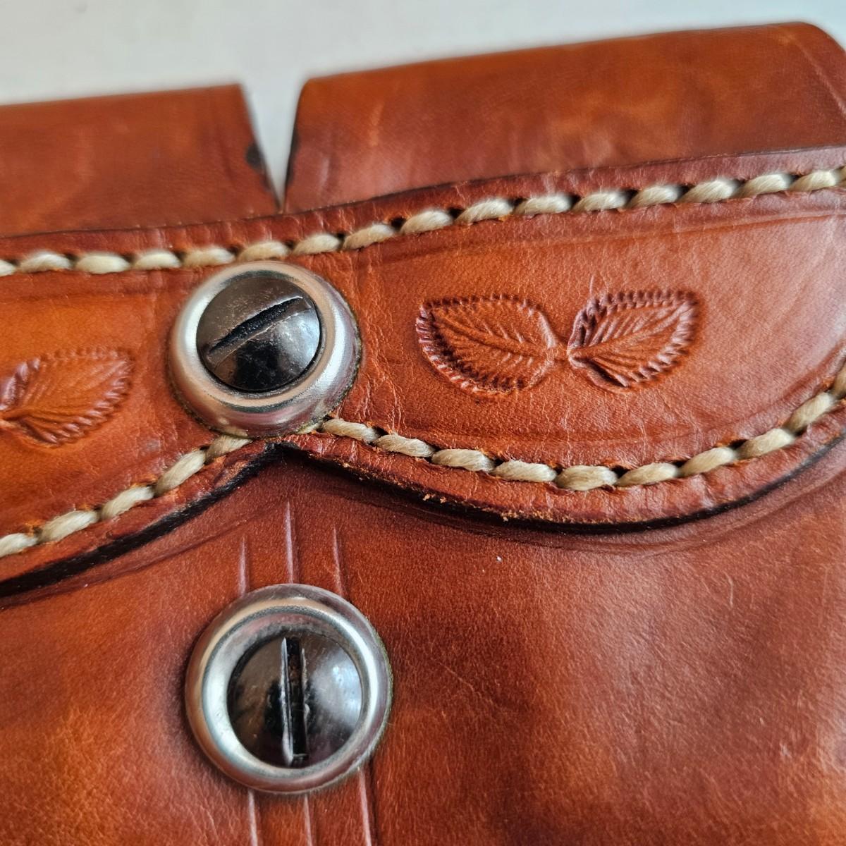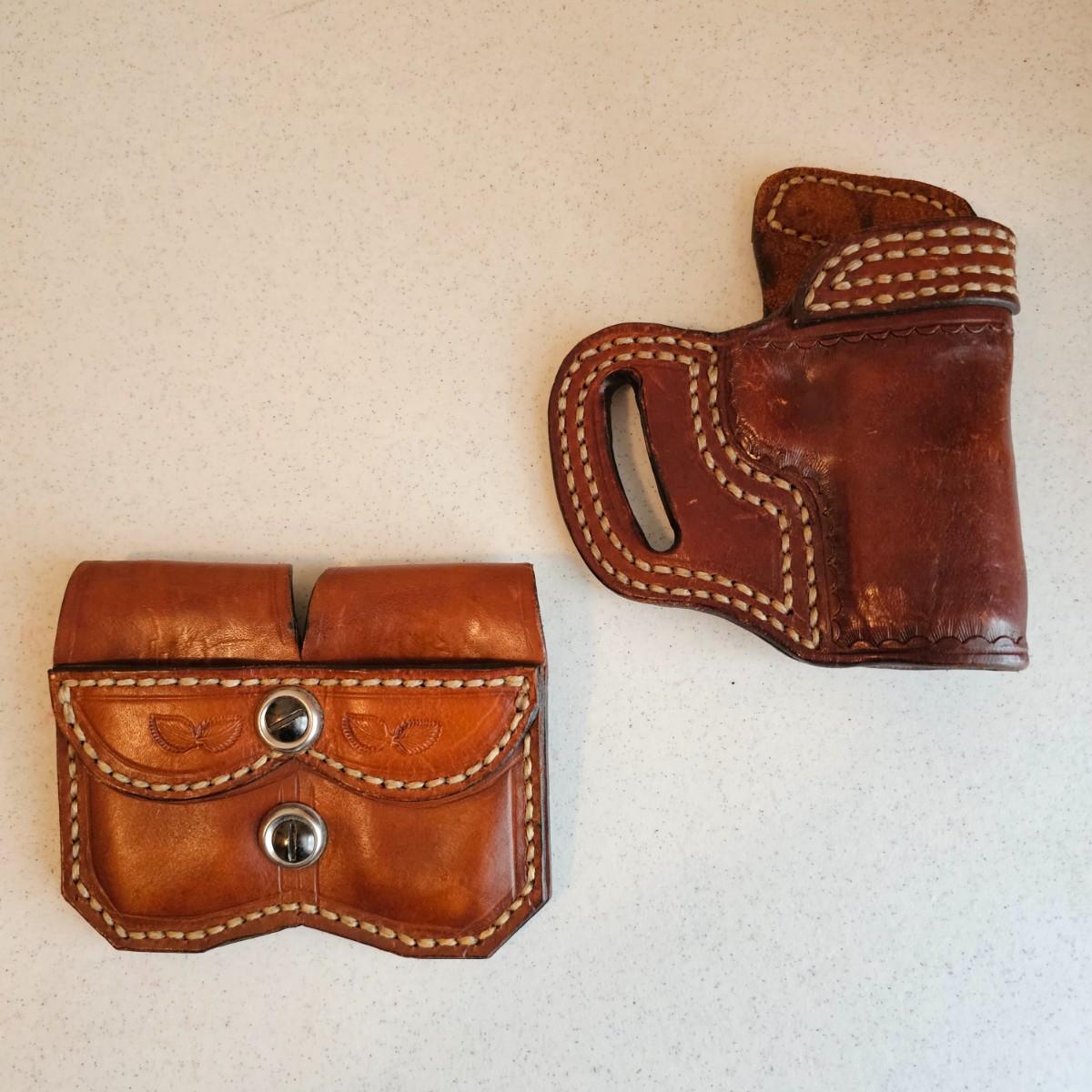Brown leather and decorative stitching on these handmade pieces.multiple stamped designs in both, and artist stamped on back of magazine belt loops. Gun holster measures 5" x 6"H with a 4.5" depth and open bottom. Magazine piece is 5" x 4"H, has 2.5" depth. Probably designed for a small pistol or revolver. Both items used. See photos for details. Shipping available.
