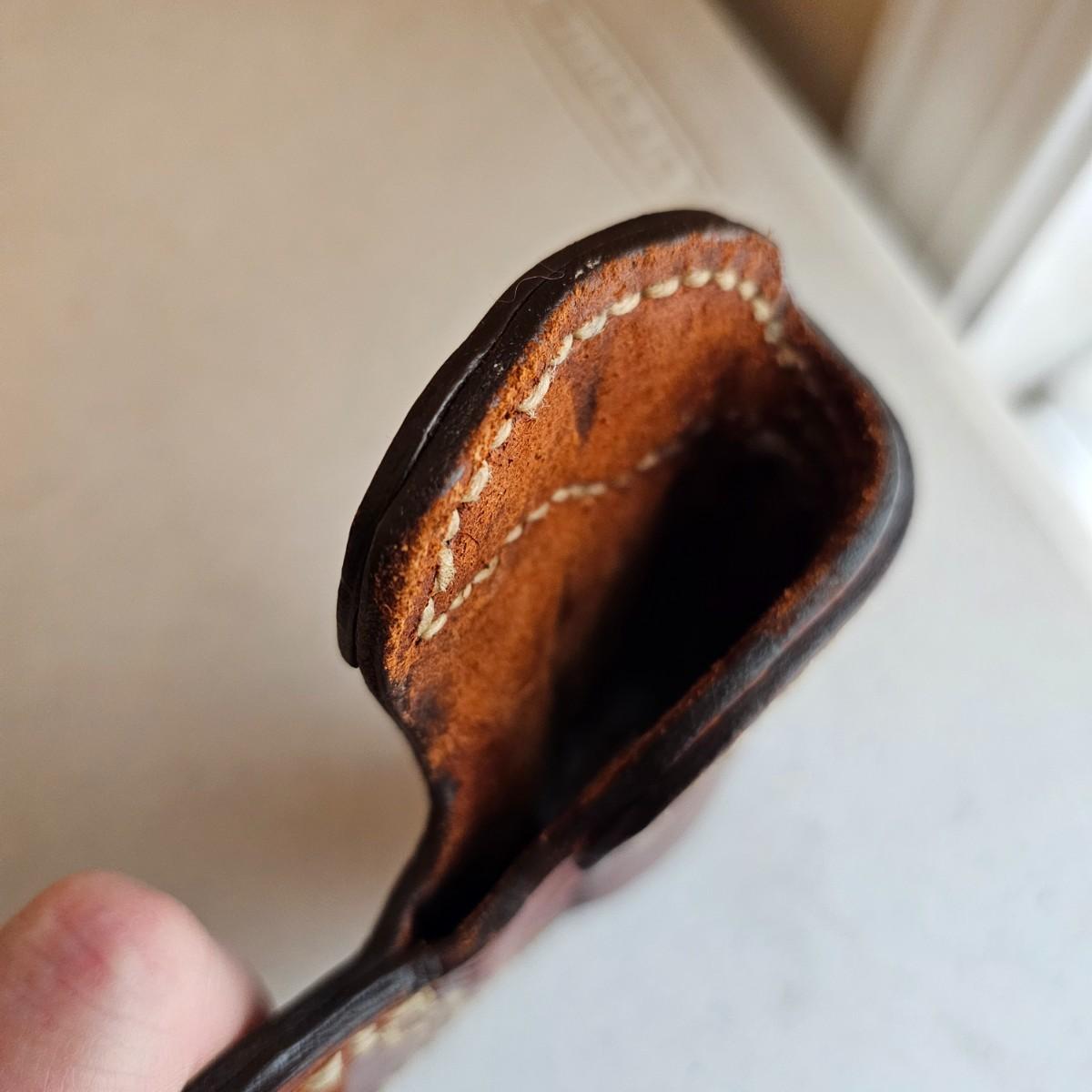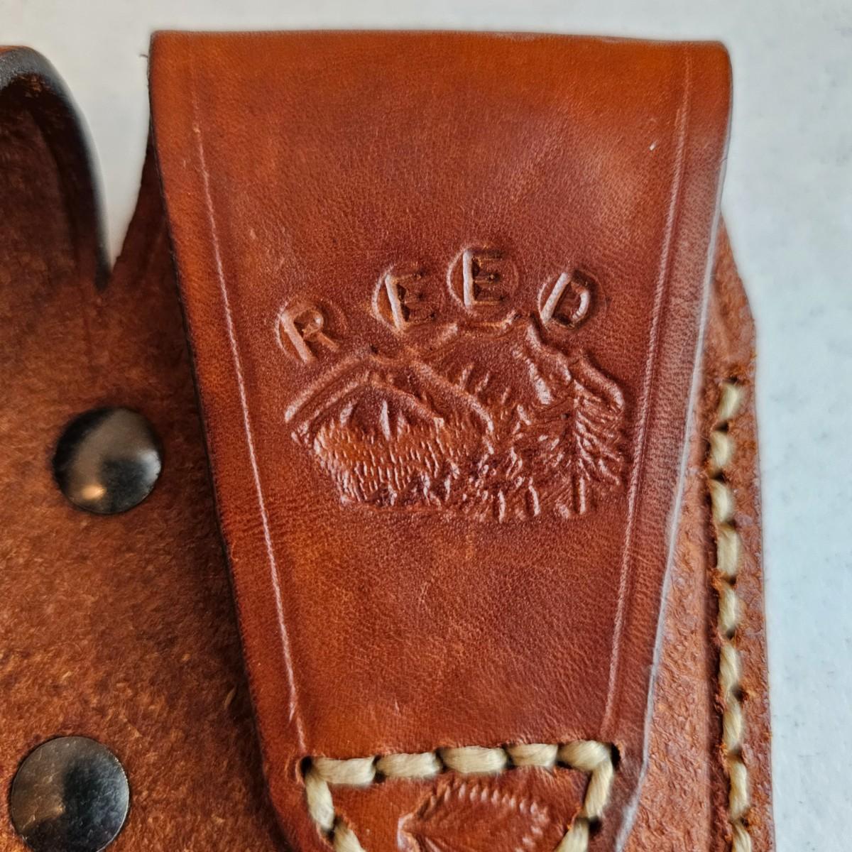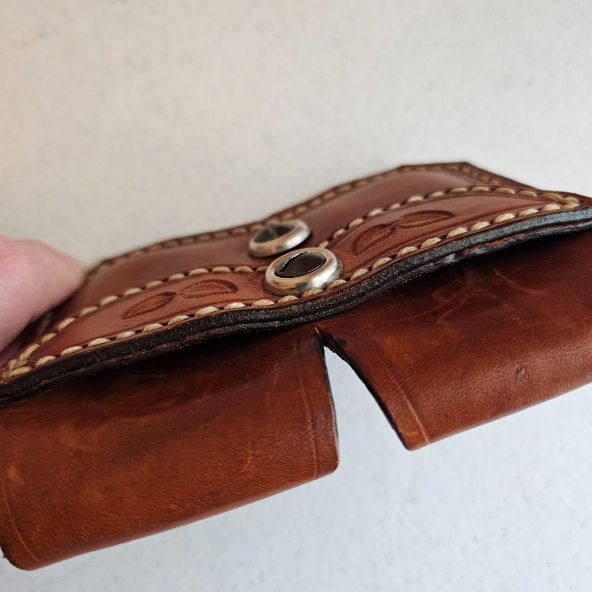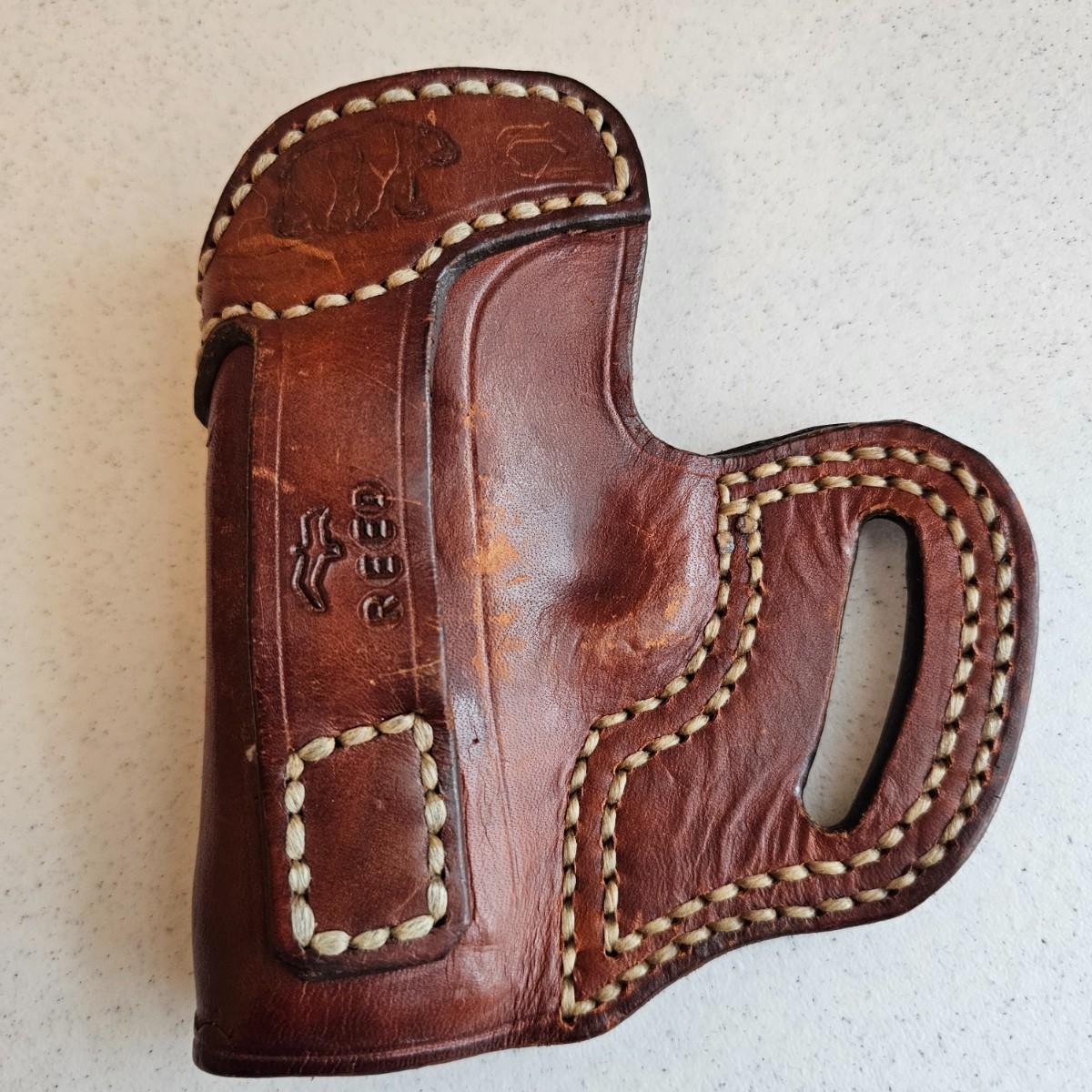 Brown leather and decorative stitching on these handmade pieces.multiple stamped designs in both, and artist stamped on back of magazine belt loops. Gun holster measures 5" x 6"H with a 4.5" depth and open bottom. Magazine piece is 5" x 4"H, has 2.5" depth. Probably designed for a small pistol or revolver. Both items used. See photos for details. Shipping available.
