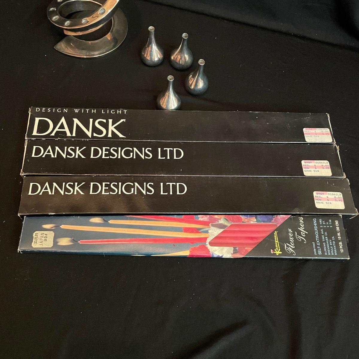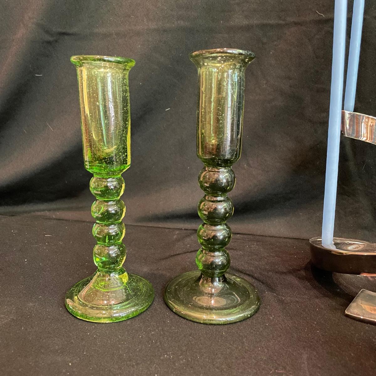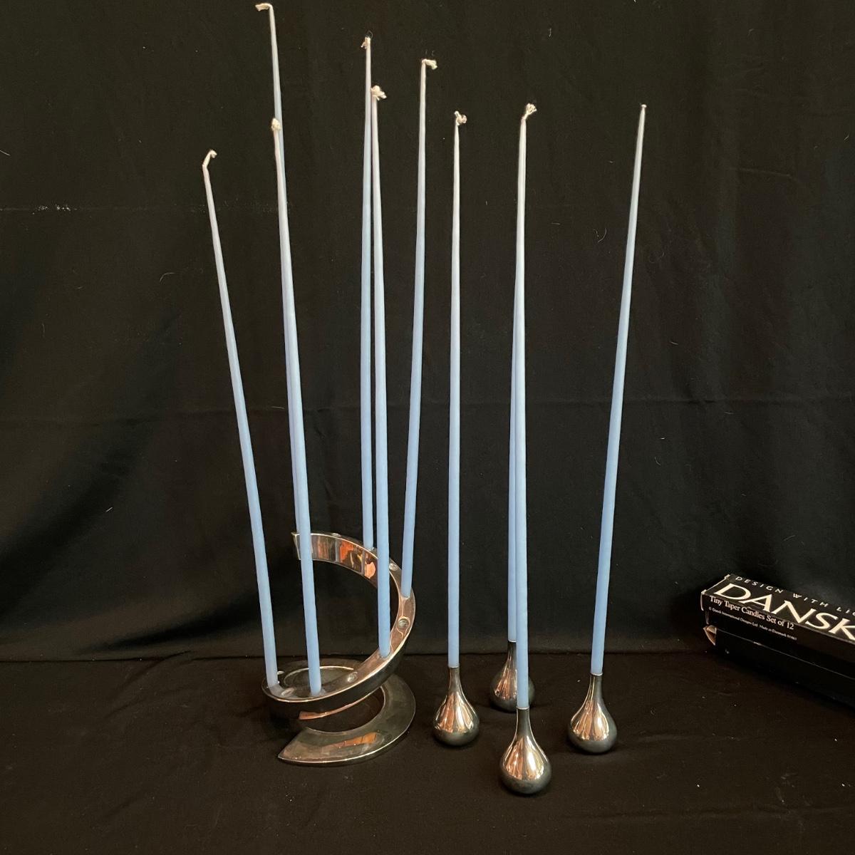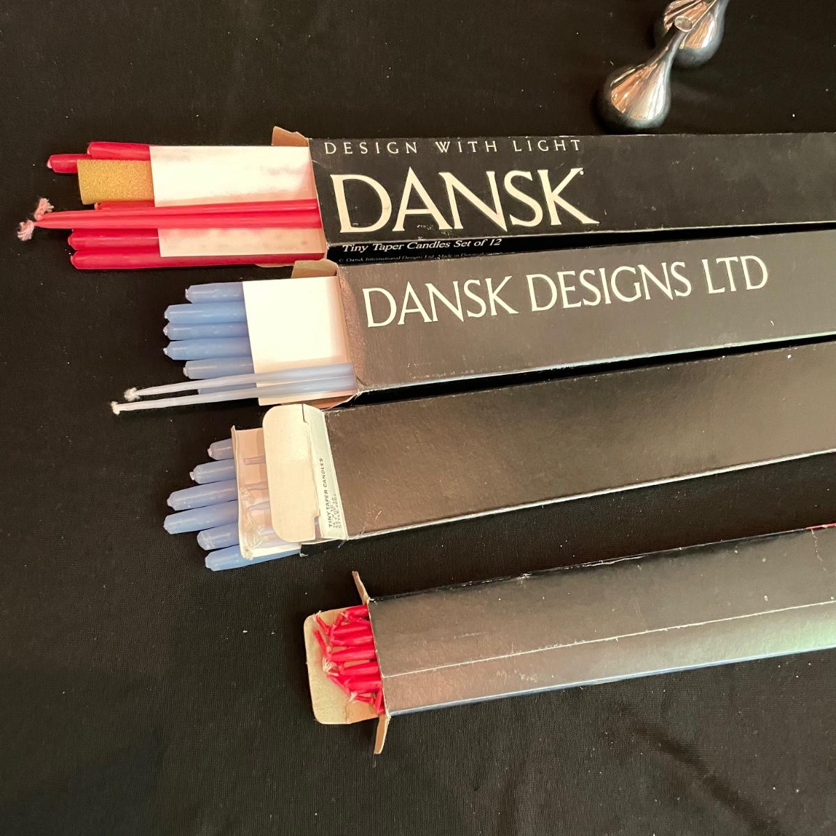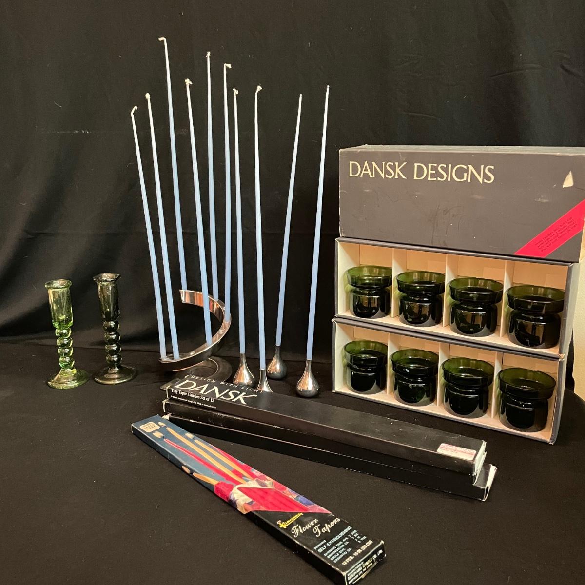 Heavy swirling tiny taper candle holder plus four teardrop shaped holders by Dansk Designs. Lot also include two boxes that fit four each green glass unmarked votives, two green glass taper candlesticks; one is a little bit darker than the other, see photos. Lot also contains four opened, but mostly full tiny taper candles, three by Dansk. See images. Shipping available.