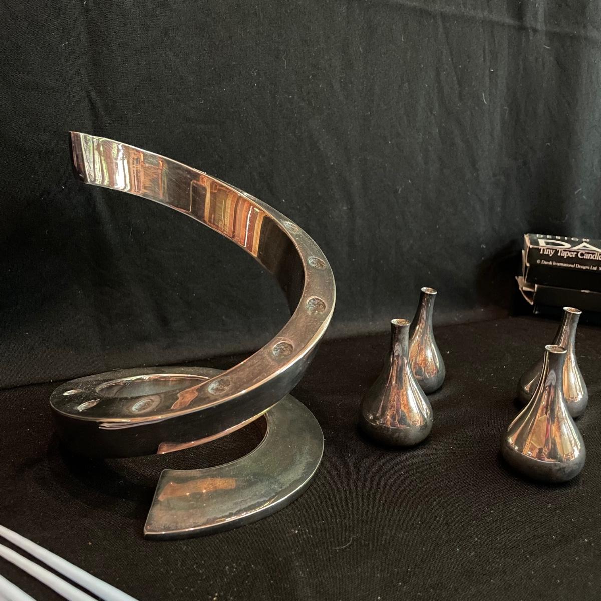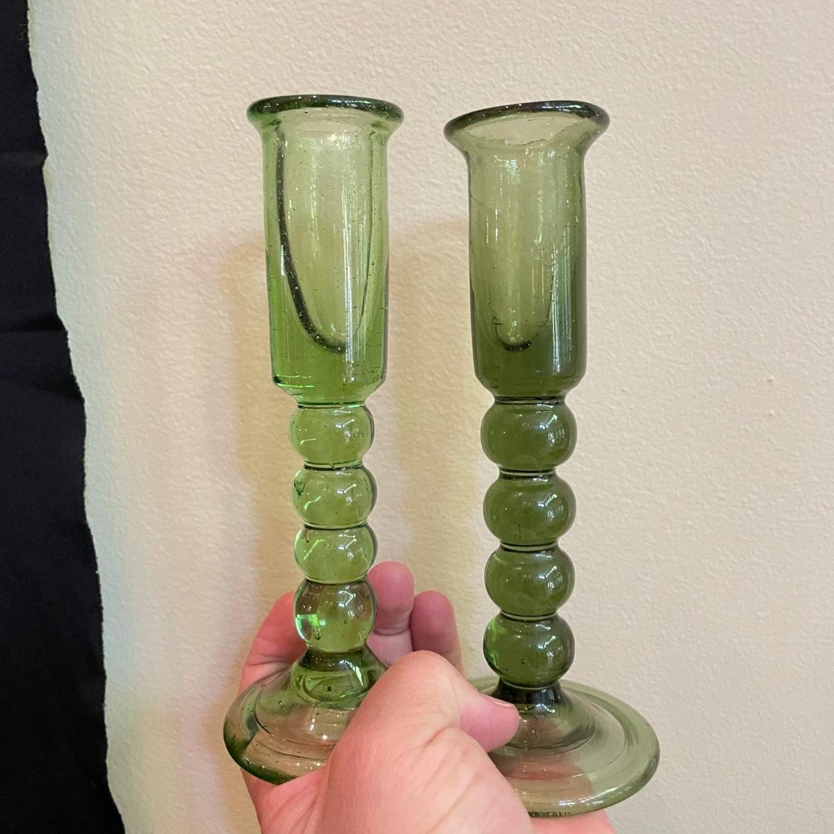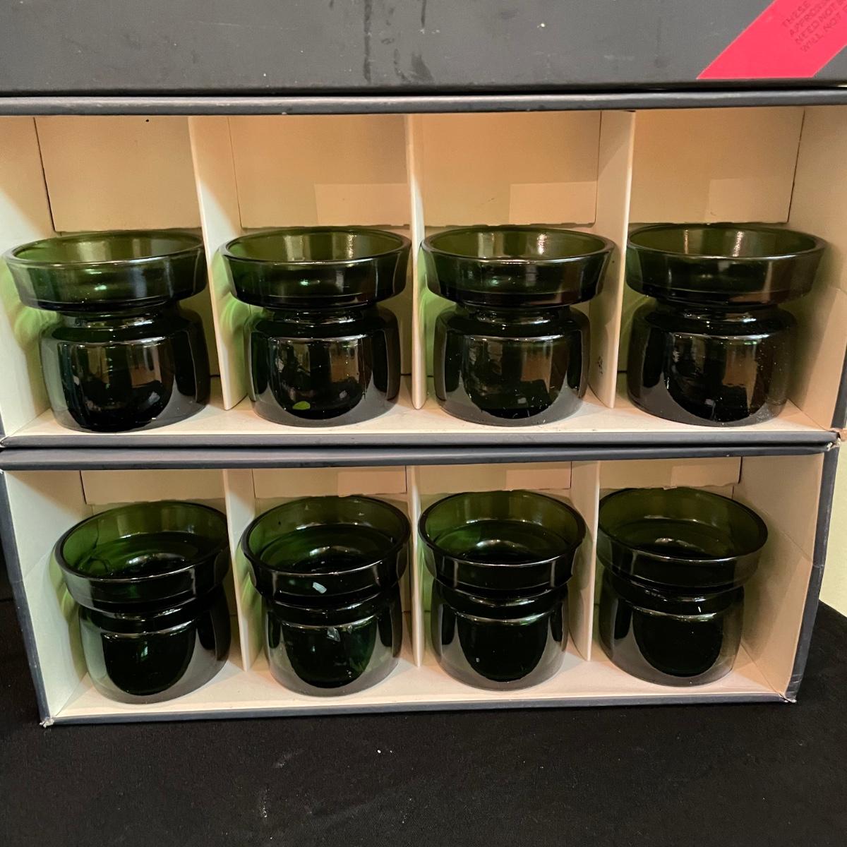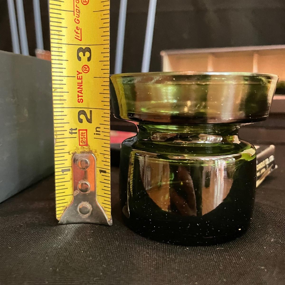 Heavy swirling tiny taper candle holder plus four teardrop shaped holders by Dansk Designs. Lot also include two boxes that fit four each green glass unmarked votives, two green glass taper candlesticks; one is a little bit darker than the other, see photos. Lot also contains four opened, but mostly full tiny taper candles, three by Dansk. See images. Shipping available.