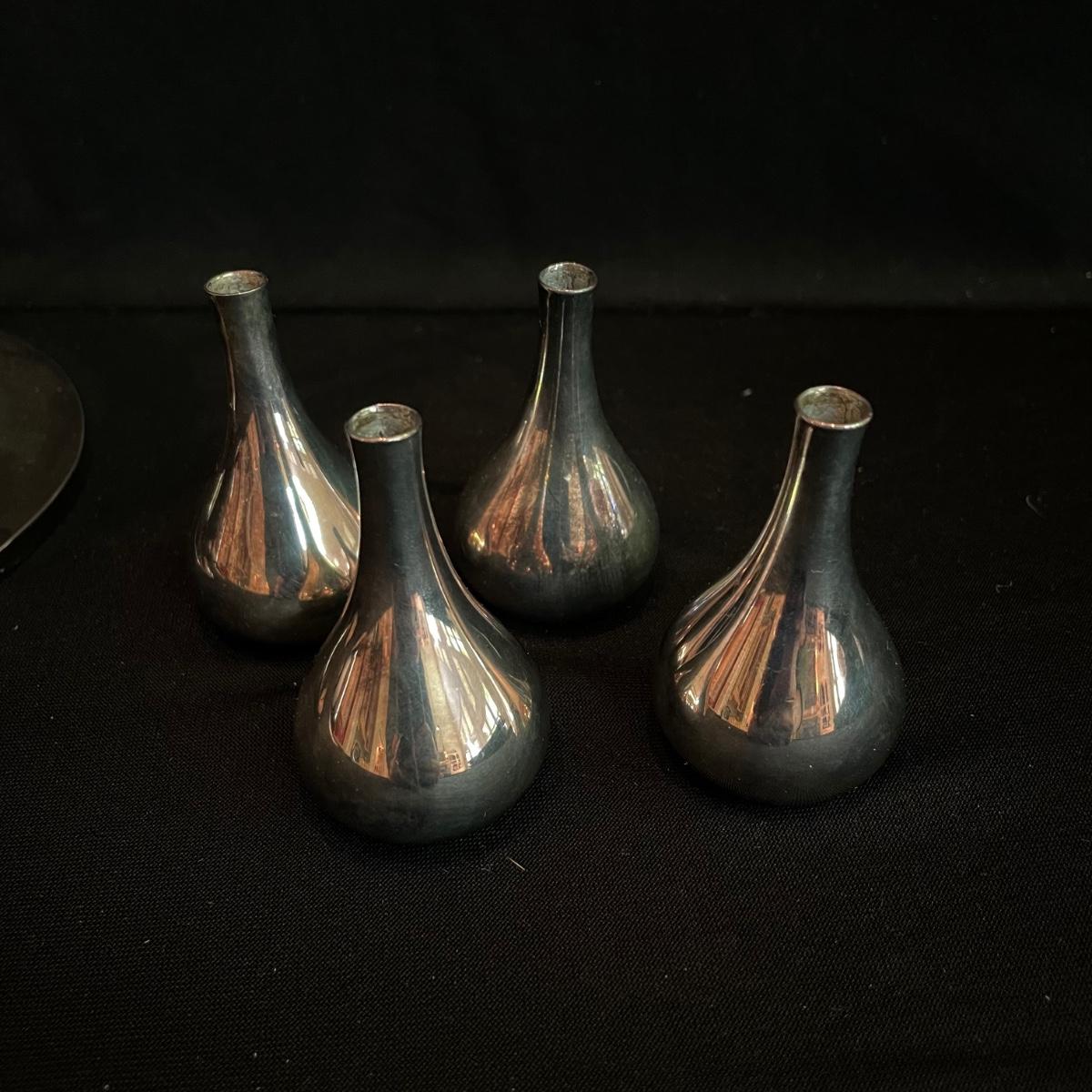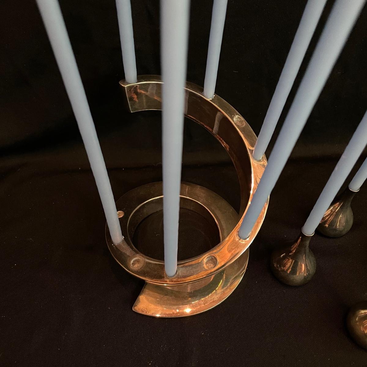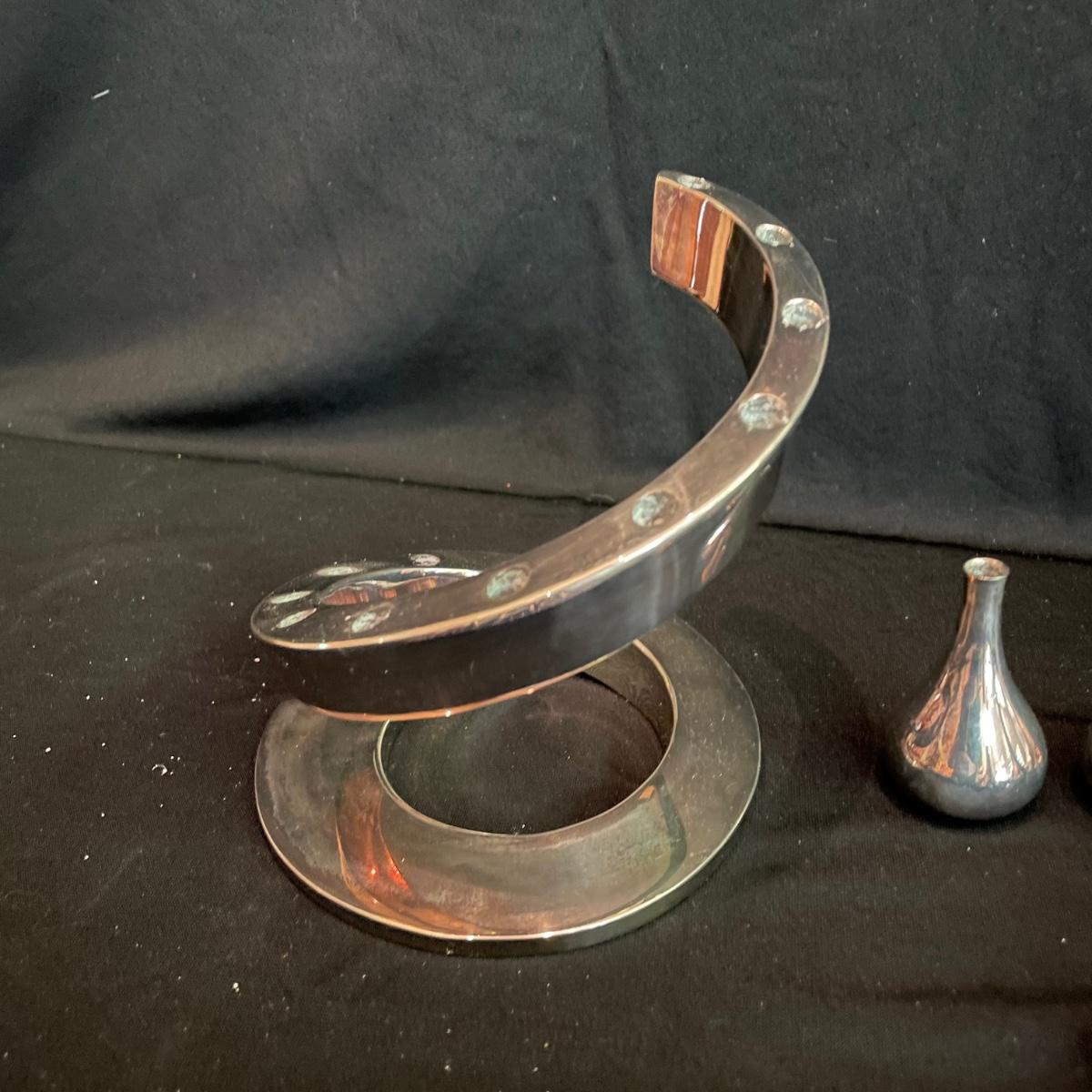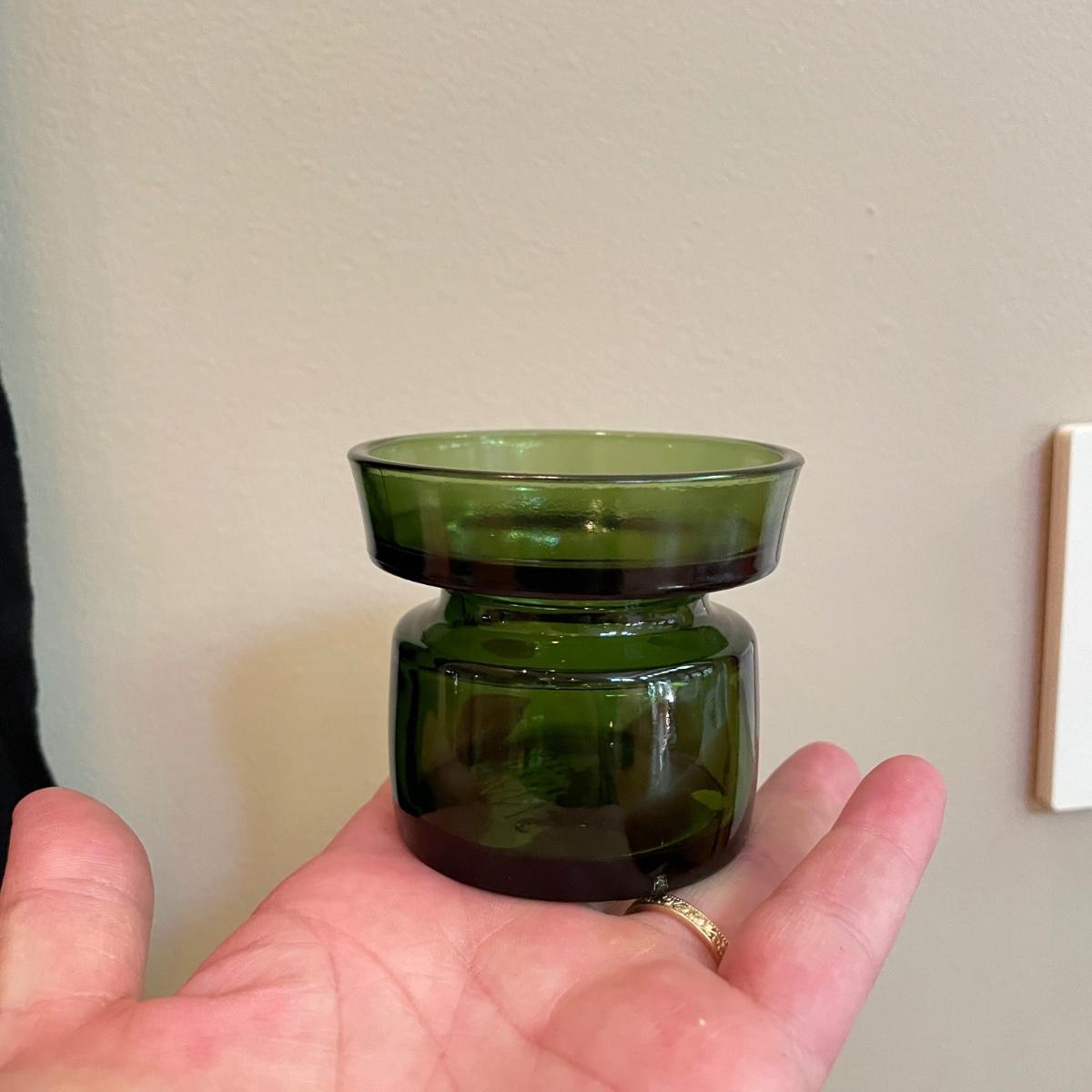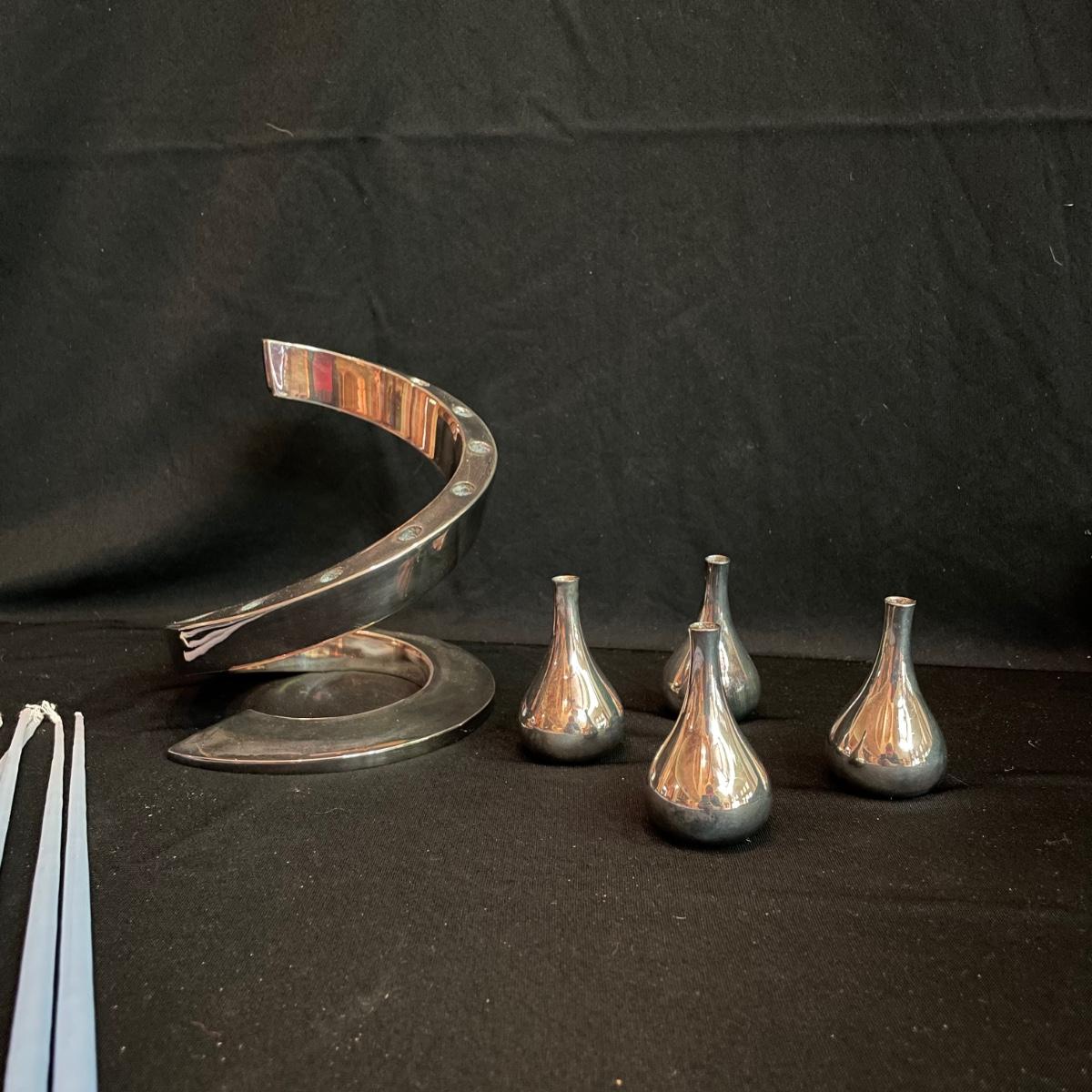 Heavy swirling tiny taper candle holder plus four teardrop shaped holders by Dansk Designs. Lot also include two boxes that fit four each green glass unmarked votives, two green glass taper candlesticks; one is a little bit darker than the other, see photos. Lot also contains four opened, but mostly full tiny taper candles, three by Dansk. See images. Shipping available.