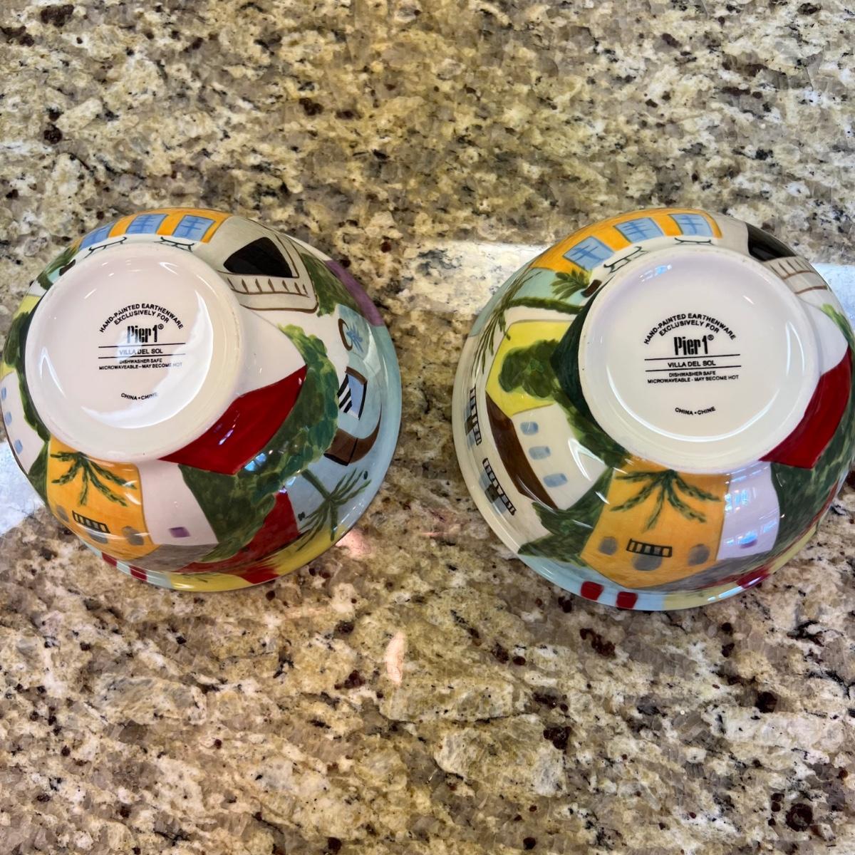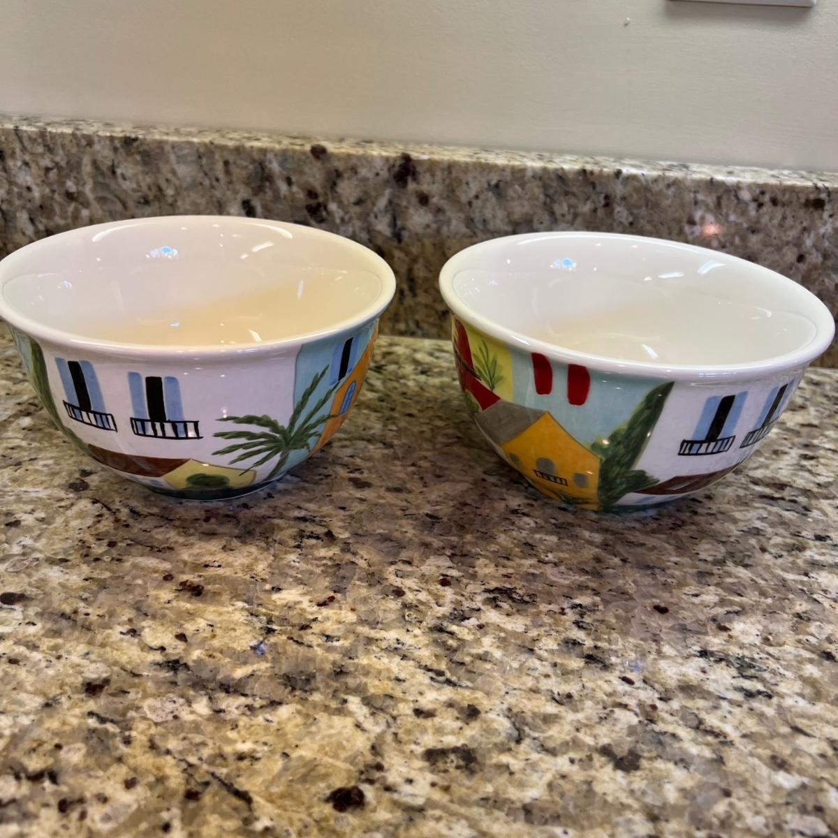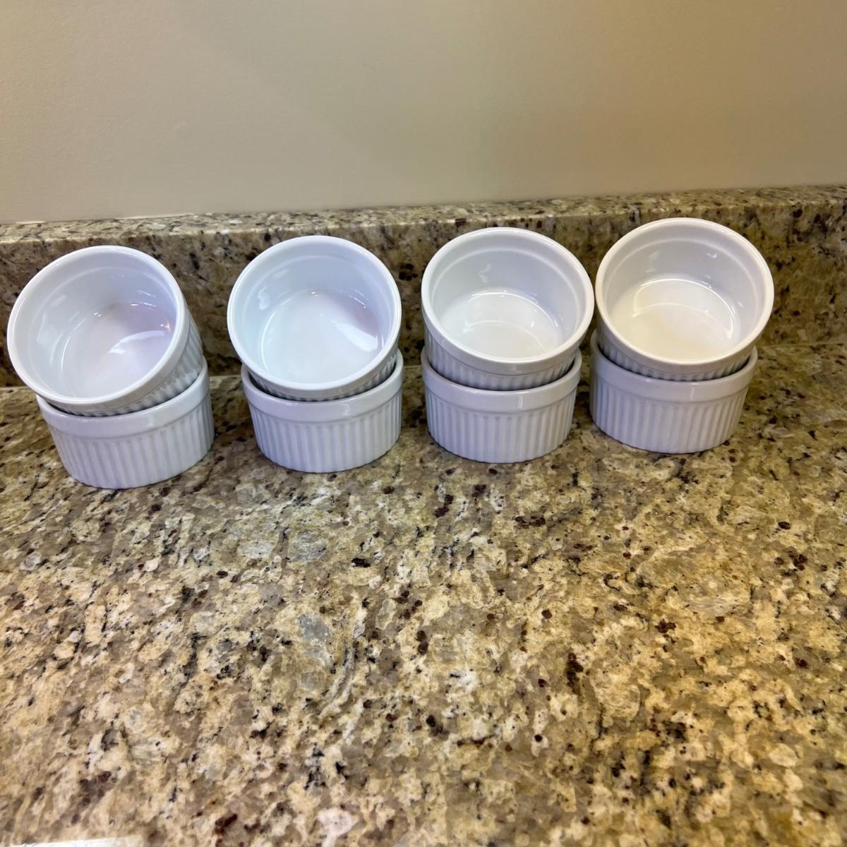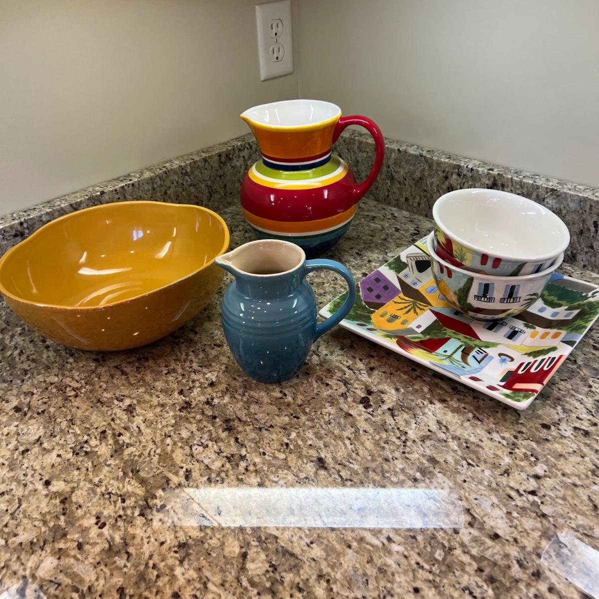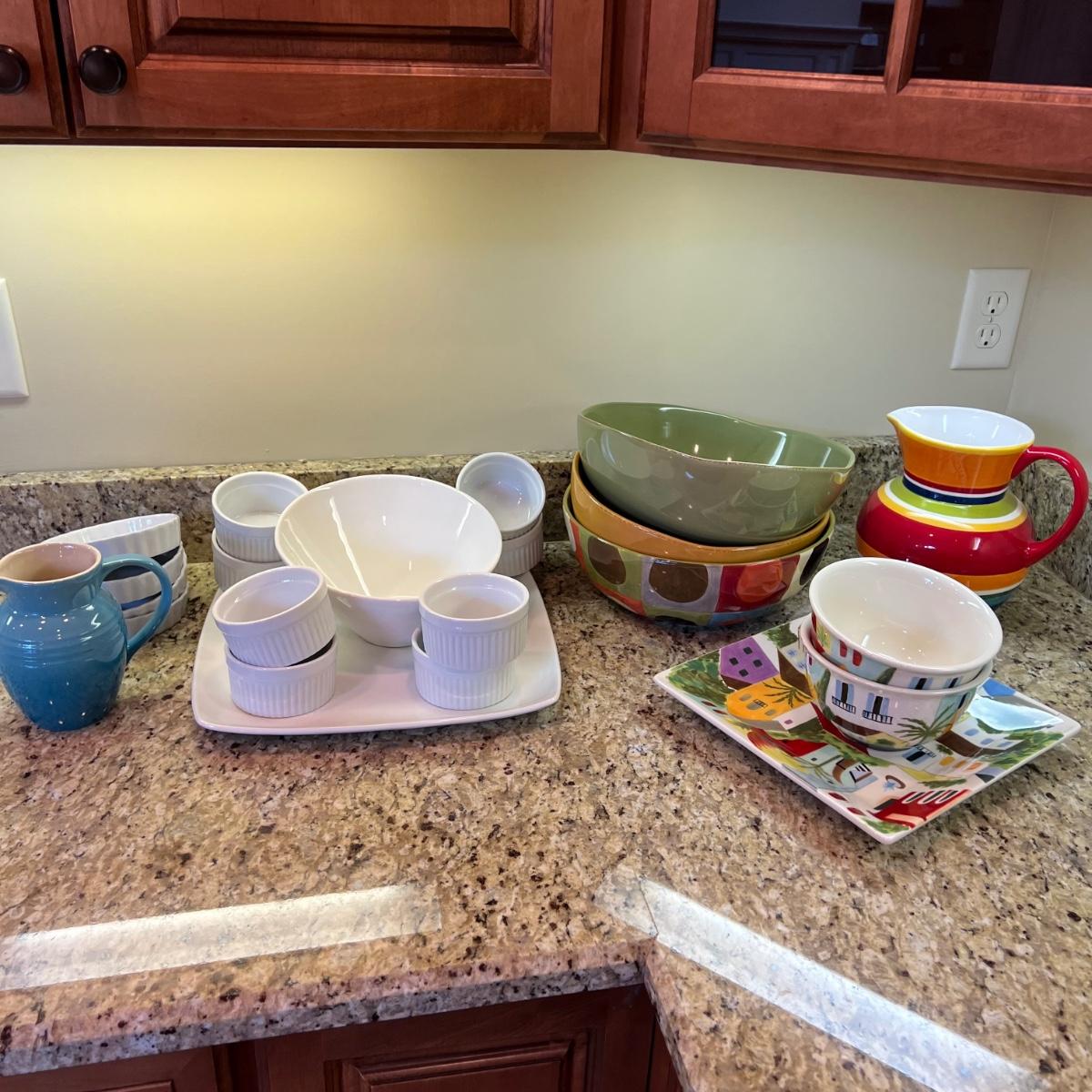 A white Dansk platter 13” x 13.5” x .75”H. Three large serving bowls each 11”D x 4”H. Eight smaller porcelain ramekins 3.5”D x 1.75”H and four larger porcelain ramekins each 5”D x 1”H. Also included is an oblong white serving bowl measuring 8.25”D x 4.5”H at its tallest side. Two bright pitchers, the smaller blue Le Creuset measures 3”D x 5.5”H and the larger striped Pier1 pitcher measures 5.5”D x 8”H. A Pier1 platter measures 10” square and two matching bowls each measure 6”D x 3.25”H.