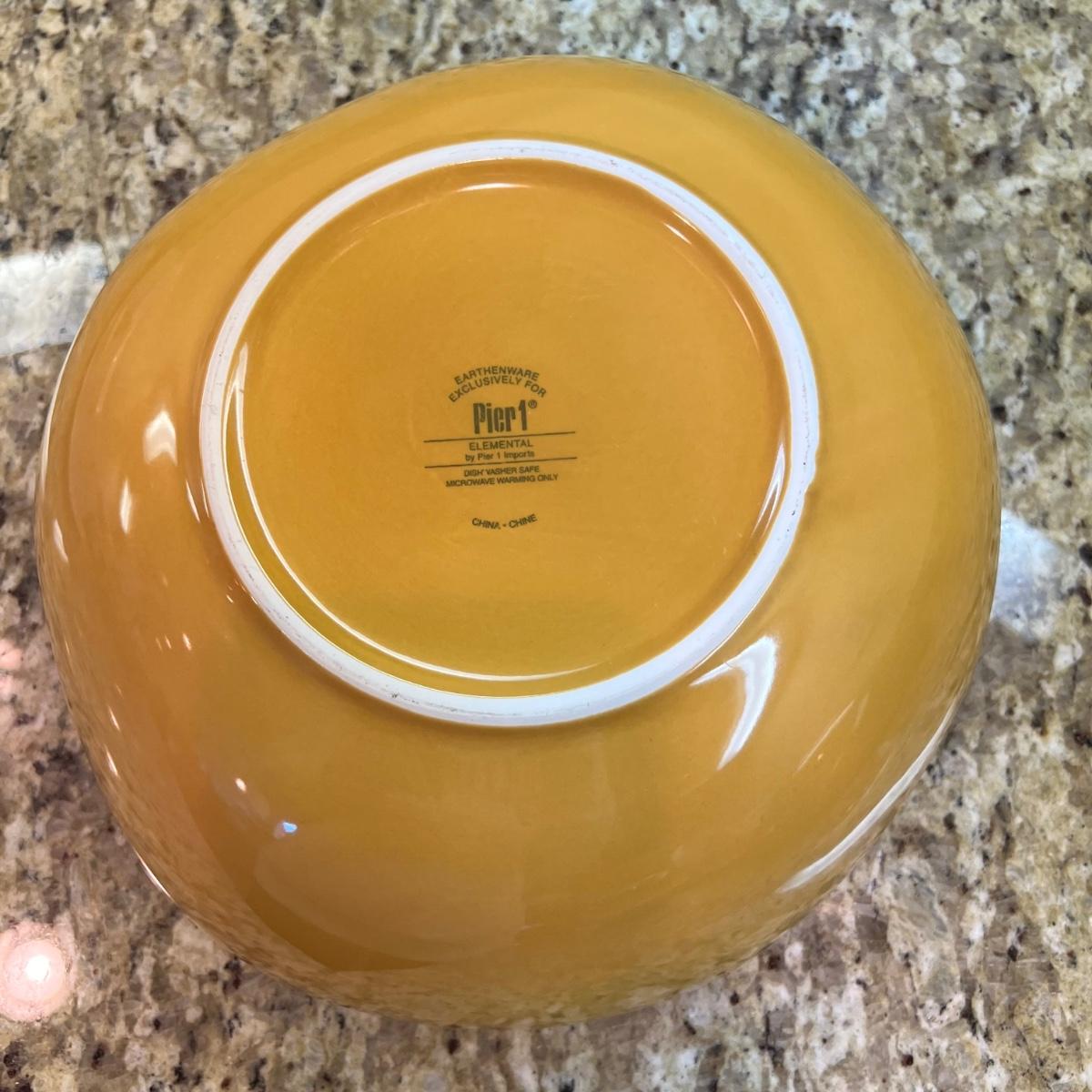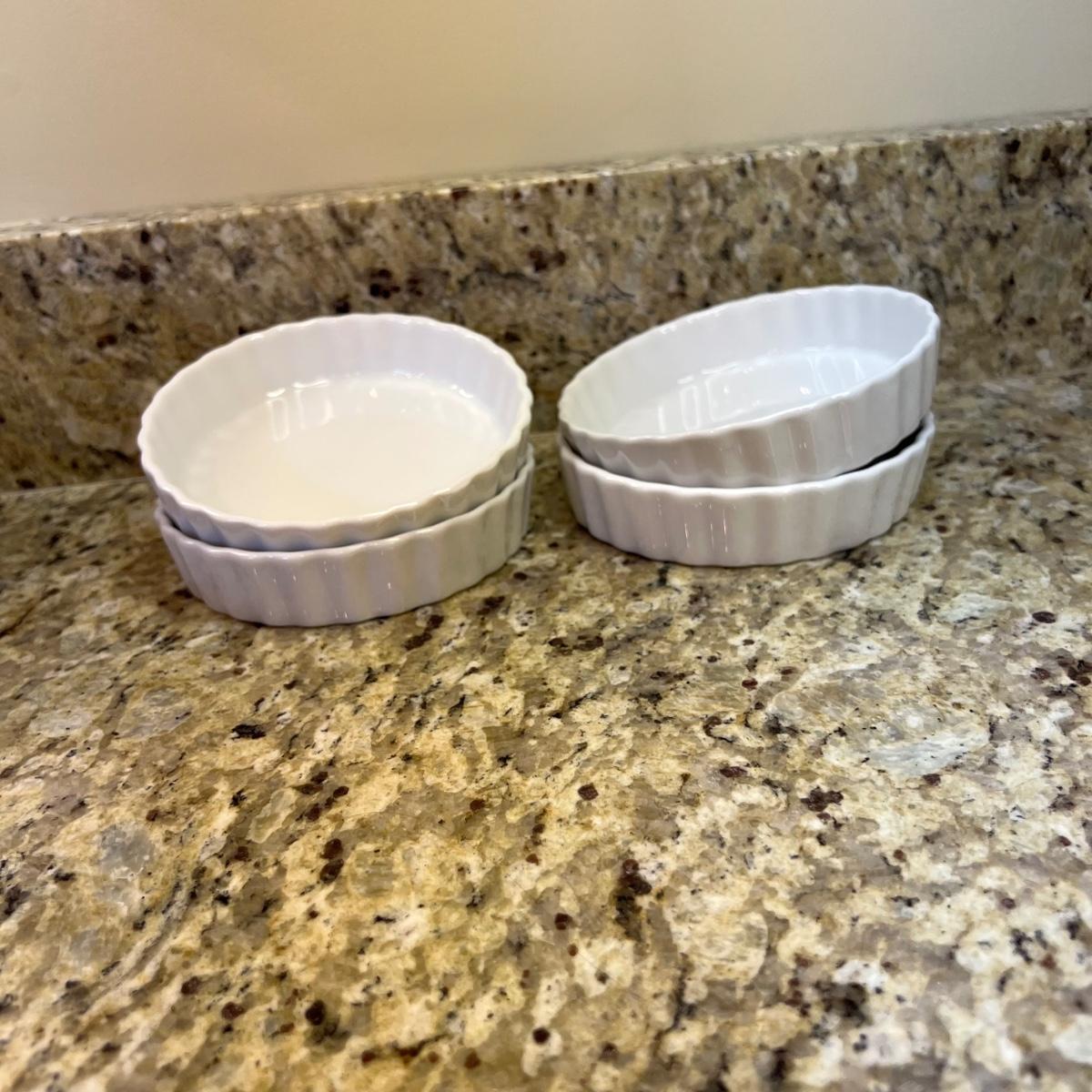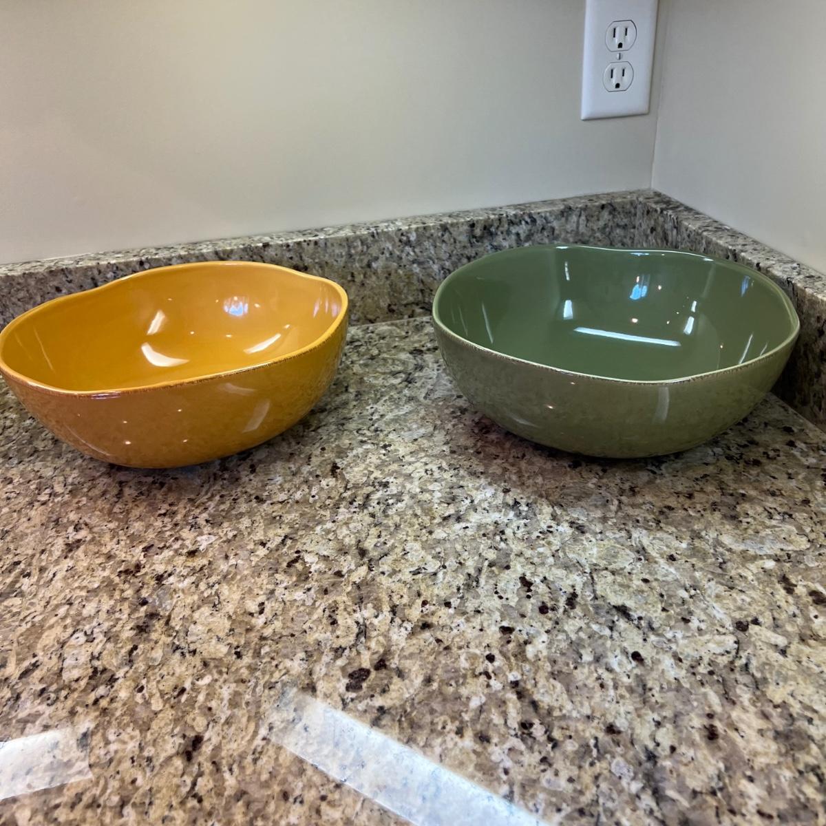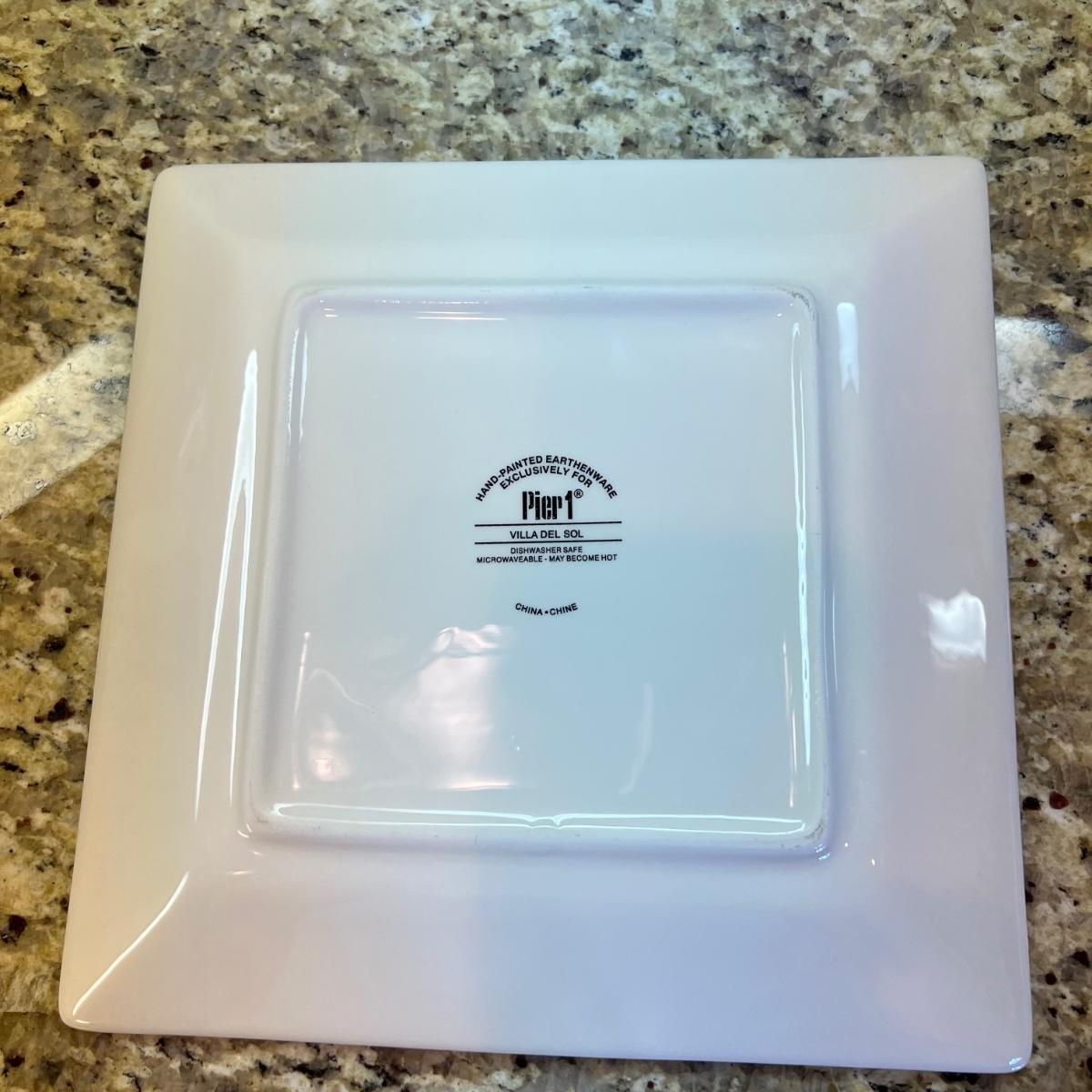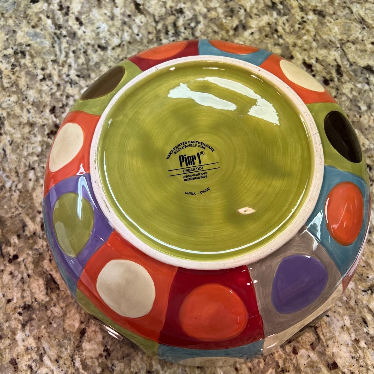 A white Dansk platter 13” x 13.5” x .75”H. Three large serving bowls each 11”D x 4”H. Eight smaller porcelain ramekins 3.5”D x 1.75”H and four larger porcelain ramekins each 5”D x 1”H. Also included is an oblong white serving bowl measuring 8.25”D x 4.5”H at its tallest side. Two bright pitchers, the smaller blue Le Creuset measures 3”D x 5.5”H and the larger striped Pier1 pitcher measures 5.5”D x 8”H. A Pier1 platter measures 10” square and two matching bowls each measure 6”D x 3.25”H.