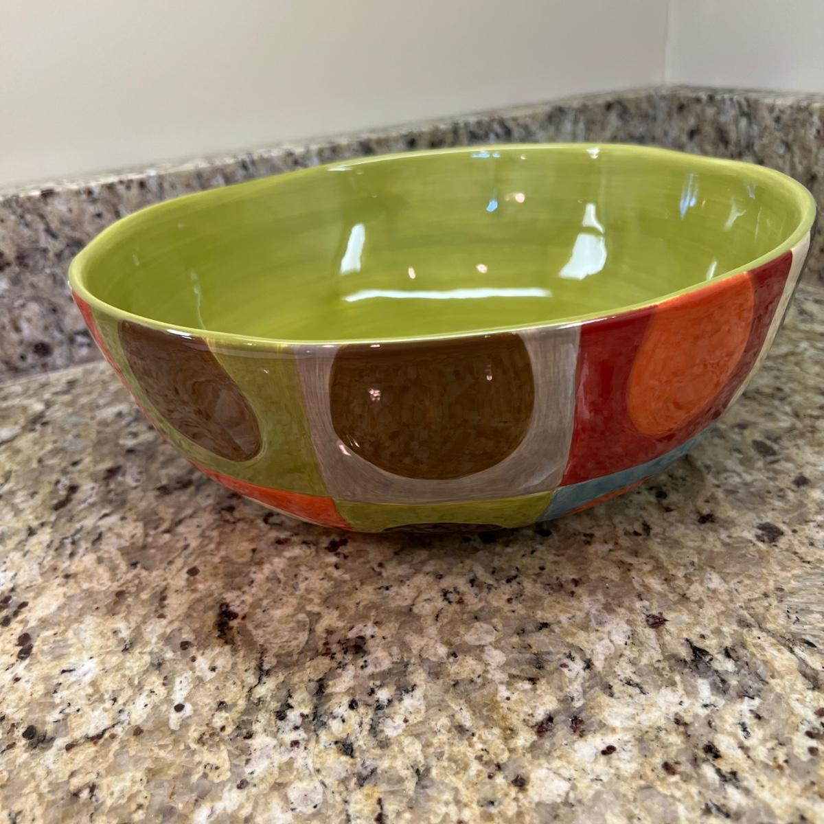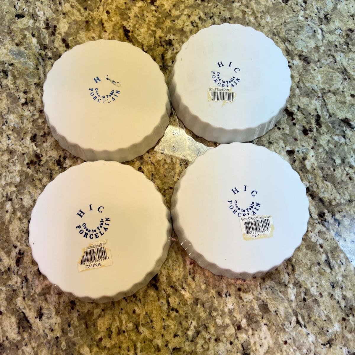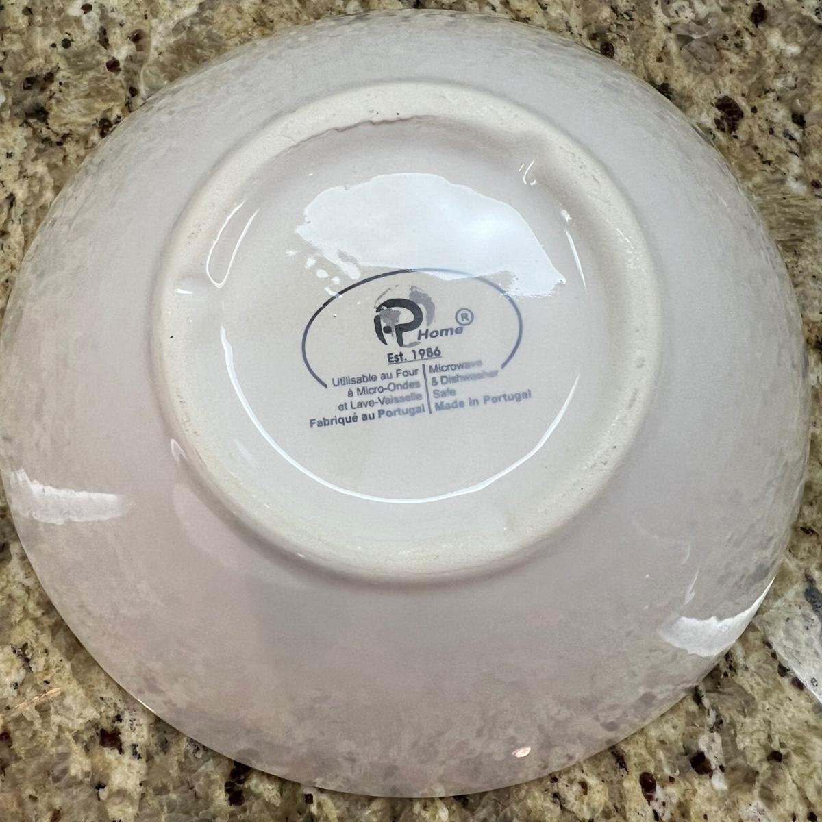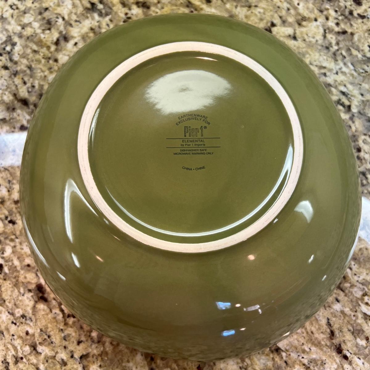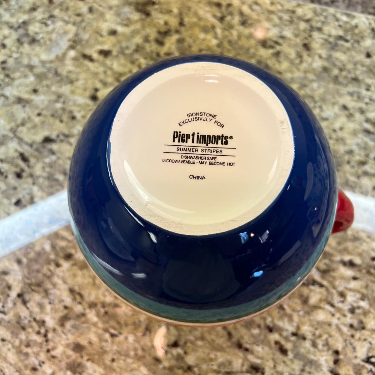 A white Dansk platter 13” x 13.5” x .75”H. Three large serving bowls each 11”D x 4”H. Eight smaller porcelain ramekins 3.5”D x 1.75”H and four larger porcelain ramekins each 5”D x 1”H. Also included is an oblong white serving bowl measuring 8.25”D x 4.5”H at its tallest side. Two bright pitchers, the smaller blue Le Creuset measures 3”D x 5.5”H and the larger striped Pier1 pitcher measures 5.5”D x 8”H. A Pier1 platter measures 10” square and two matching bowls each measure 6”D x 3.25”H.