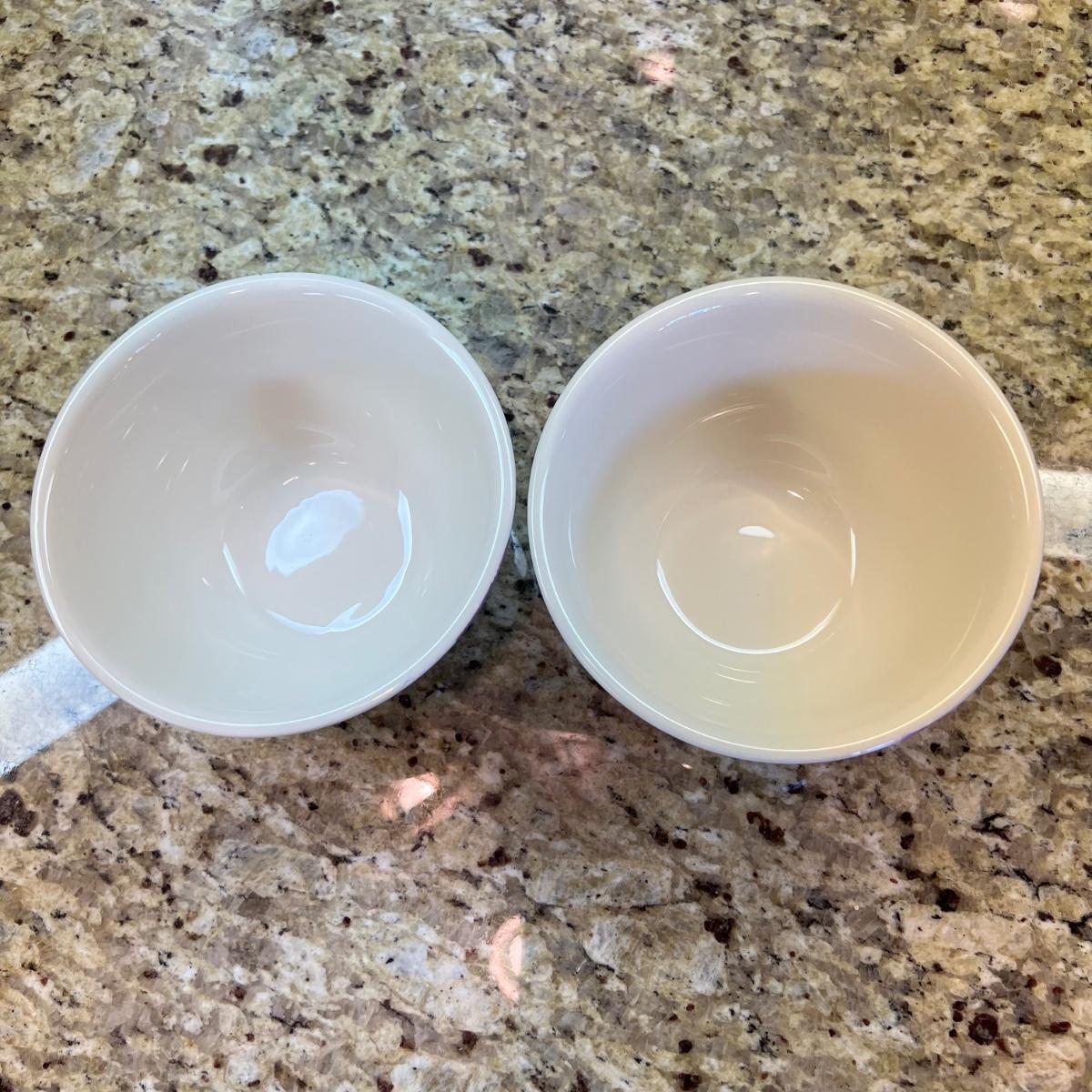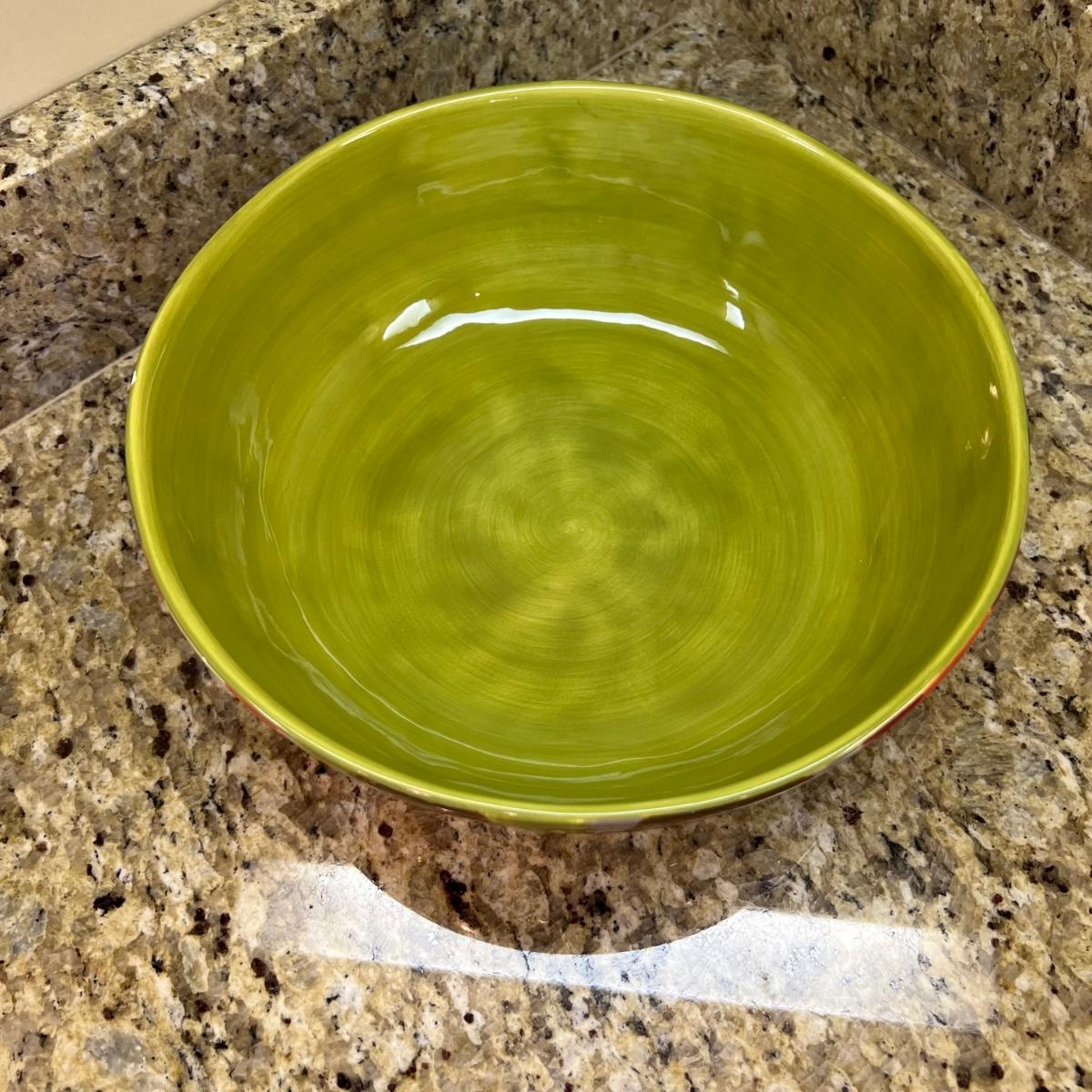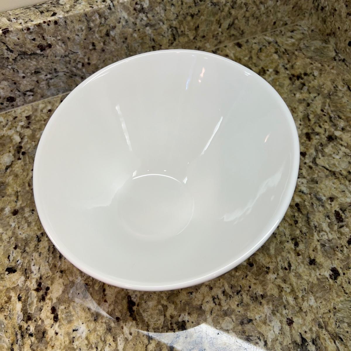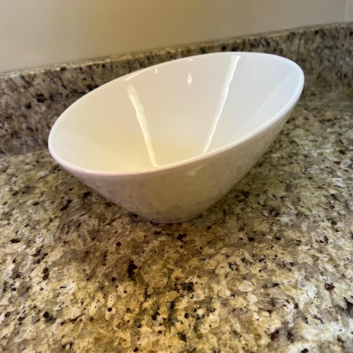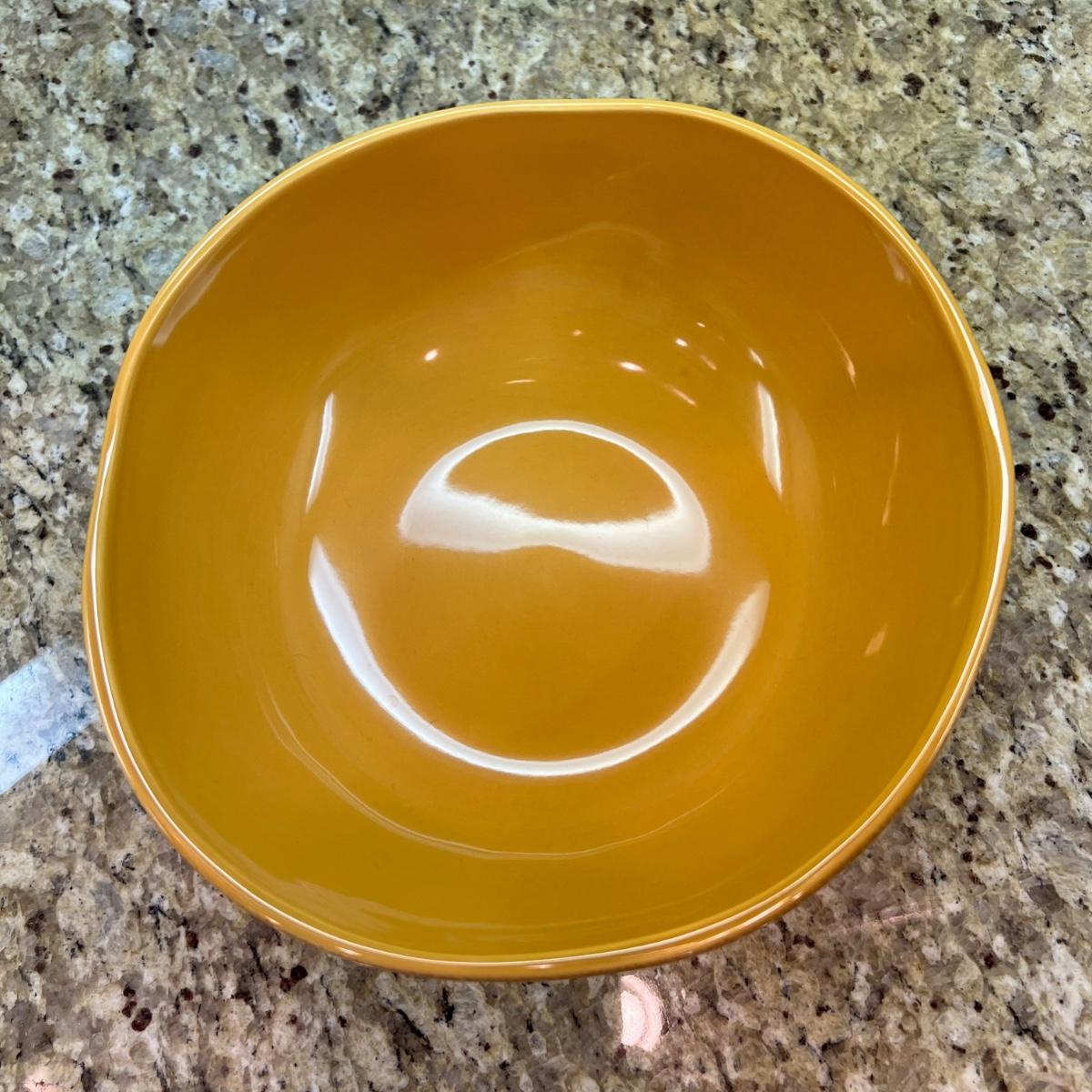 A white Dansk platter 13” x 13.5” x .75”H. Three large serving bowls each 11”D x 4”H. Eight smaller porcelain ramekins 3.5”D x 1.75”H and four larger porcelain ramekins each 5”D x 1”H. Also included is an oblong white serving bowl measuring 8.25”D x 4.5”H at its tallest side. Two bright pitchers, the smaller blue Le Creuset measures 3”D x 5.5”H and the larger striped Pier1 pitcher measures 5.5”D x 8”H. A Pier1 platter measures 10” square and two matching bowls each measure 6”D x 3.25”H.