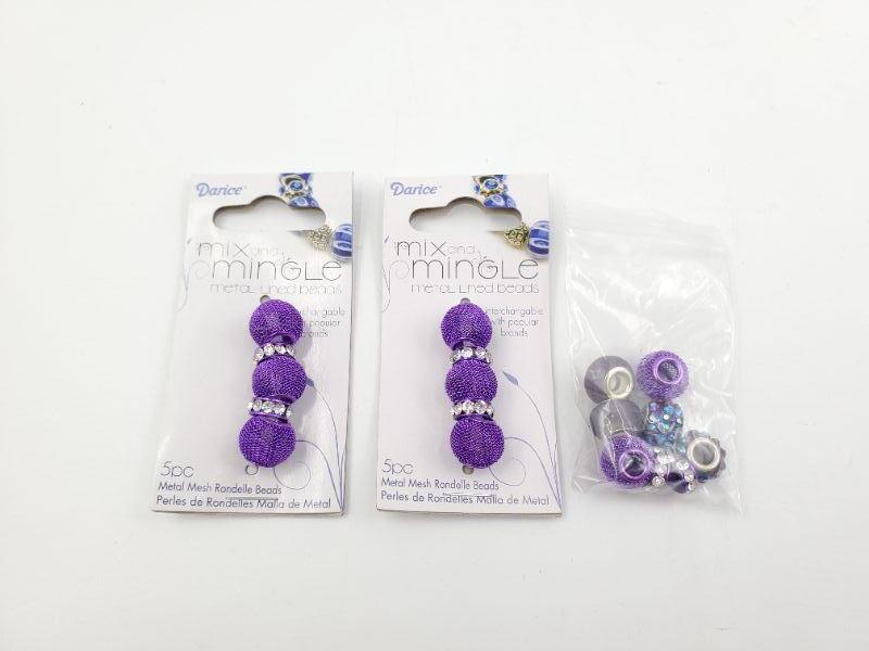 2 new packages of Darice metal mesh rondelle beads and 1 bag of opened glass metal lined darice beads.