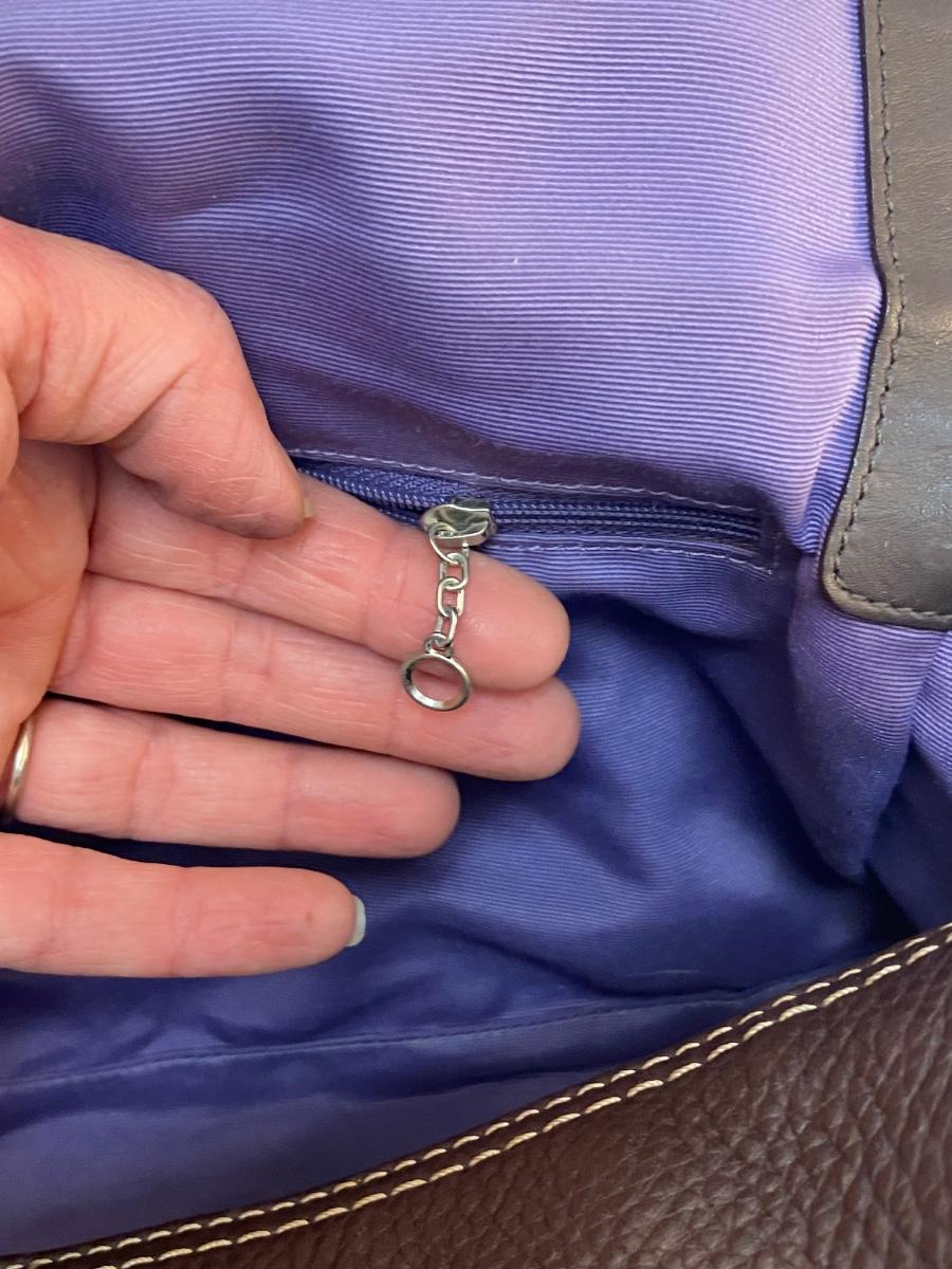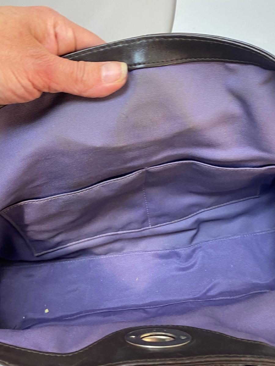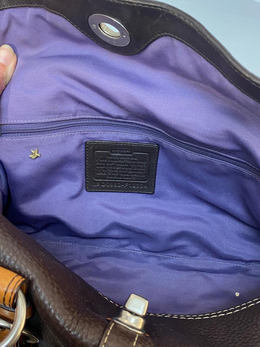 Dark Brown Coach Hobo Satchel Purse Handbag Silver Buckle Design. In good used condition. Flip over top with twist latch closure. Dark brown leather with tan straps, lavender inside lining. See photos.