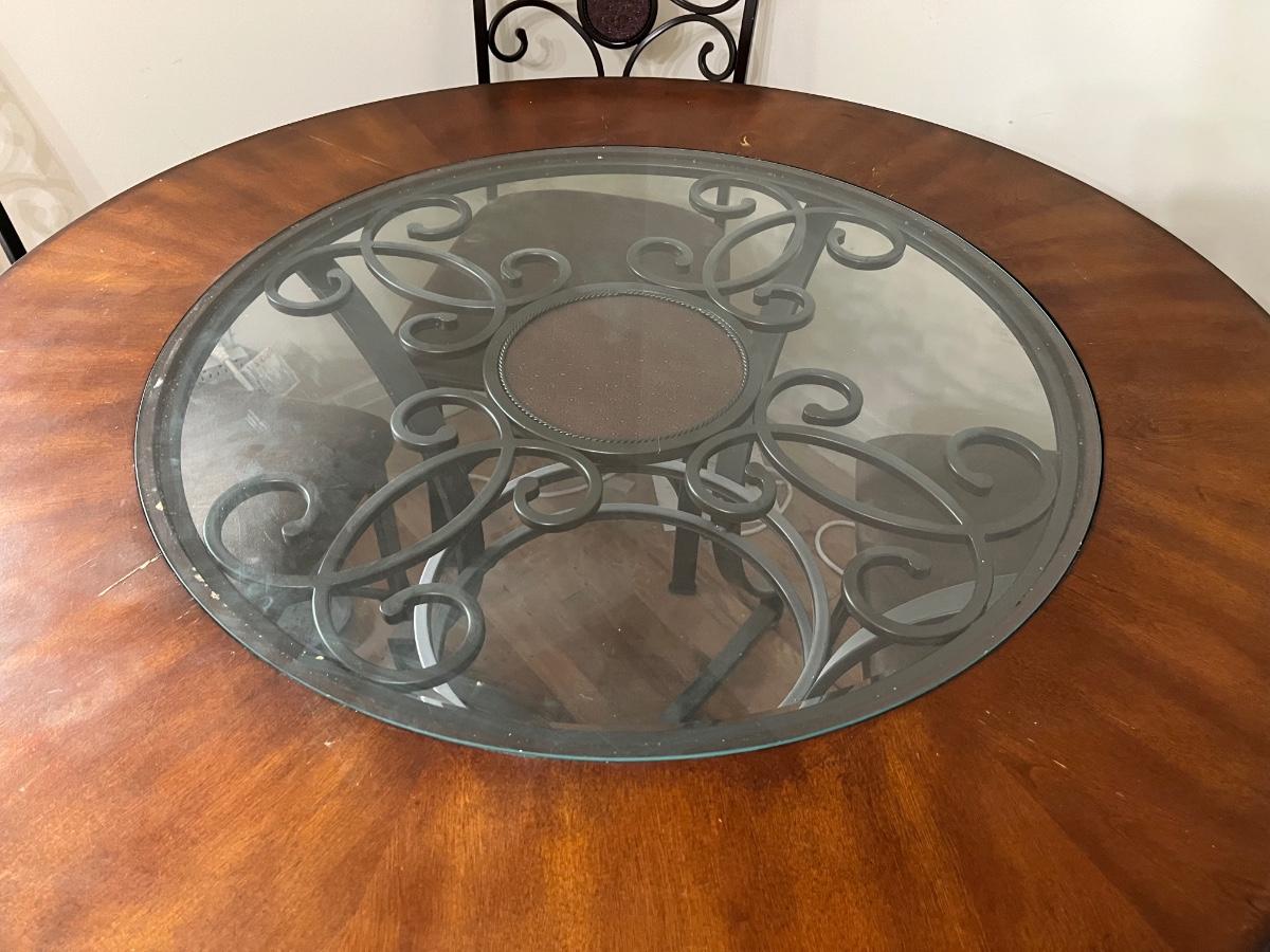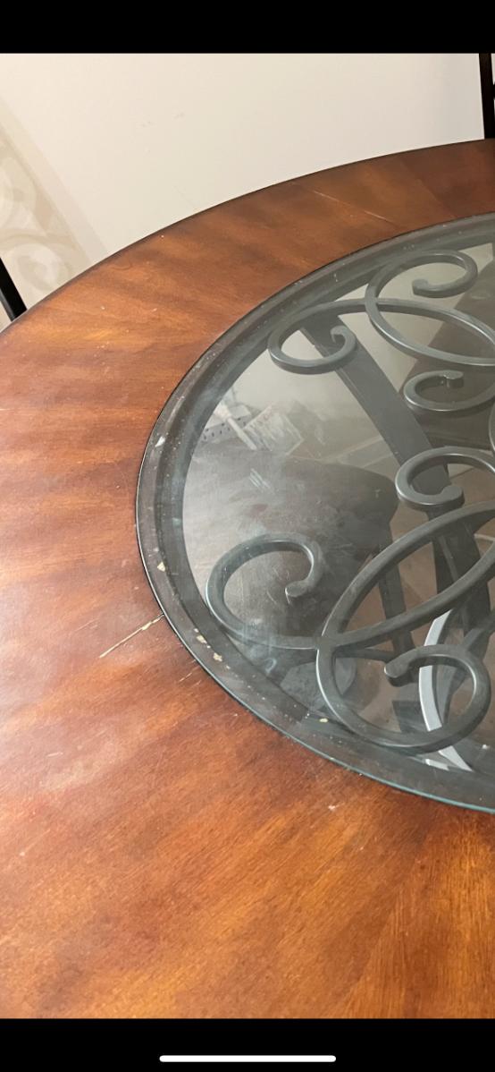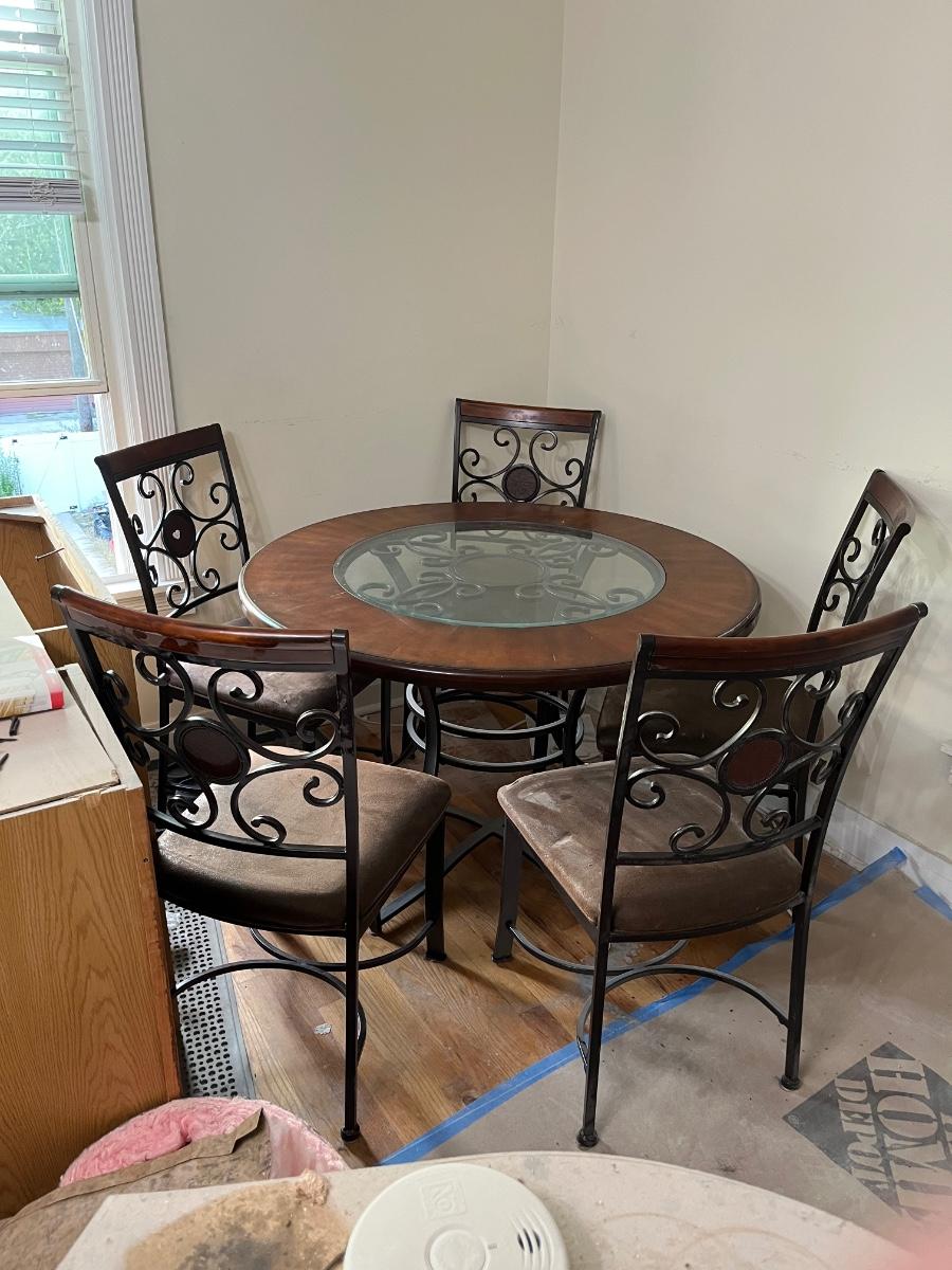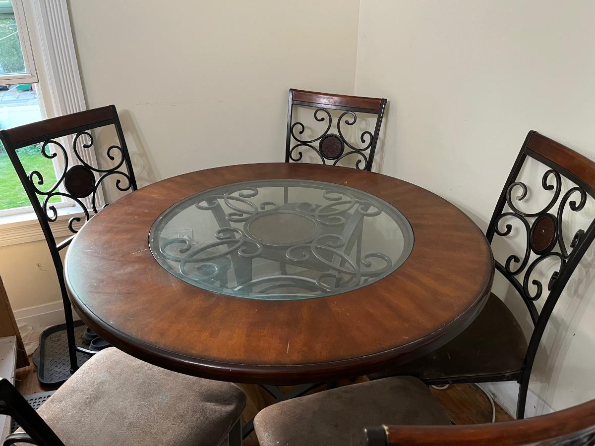 Dark brown dining table with 5 matching chairs. Center has a glass inlay that shows off the table’s rustic design.
