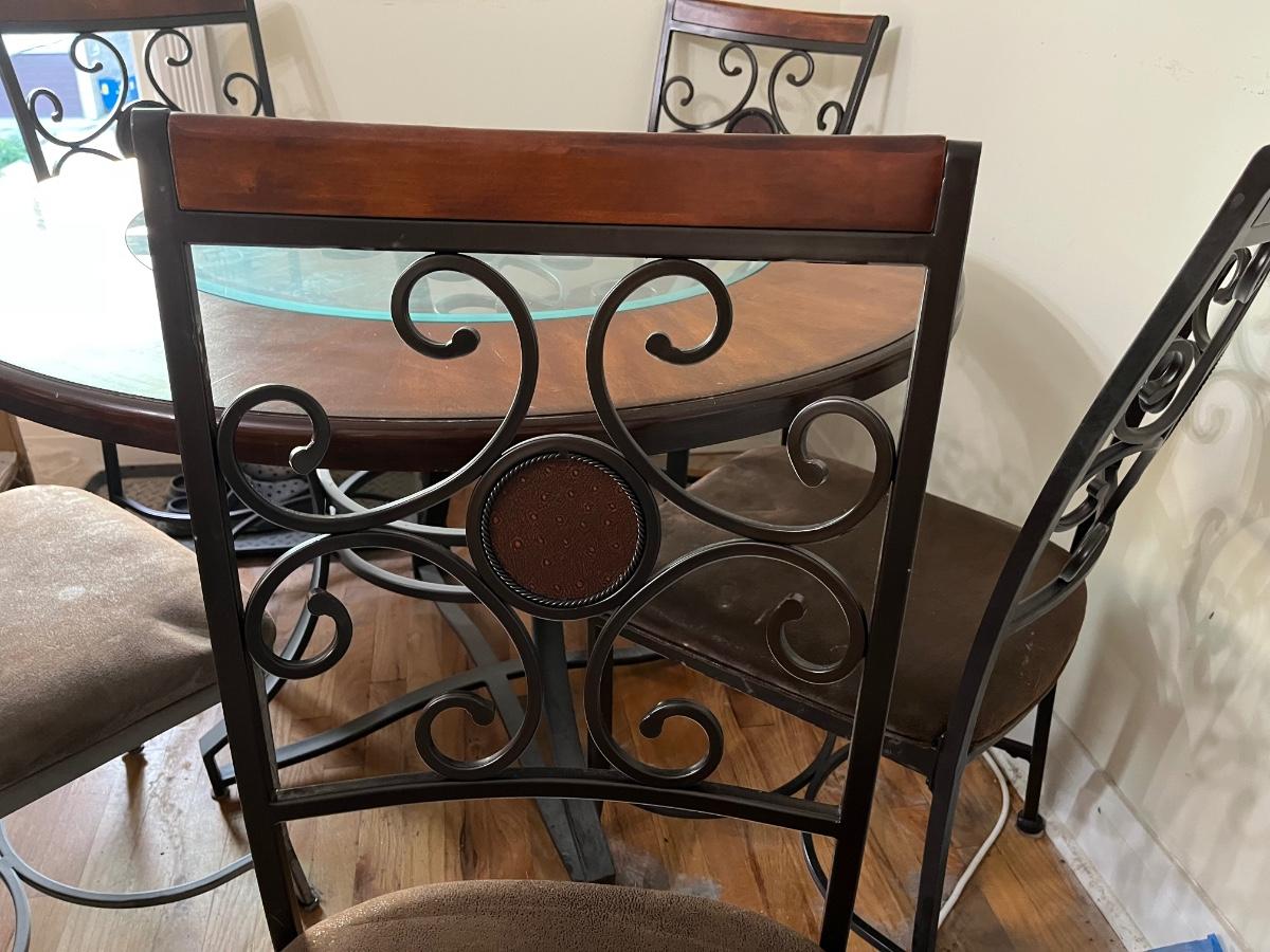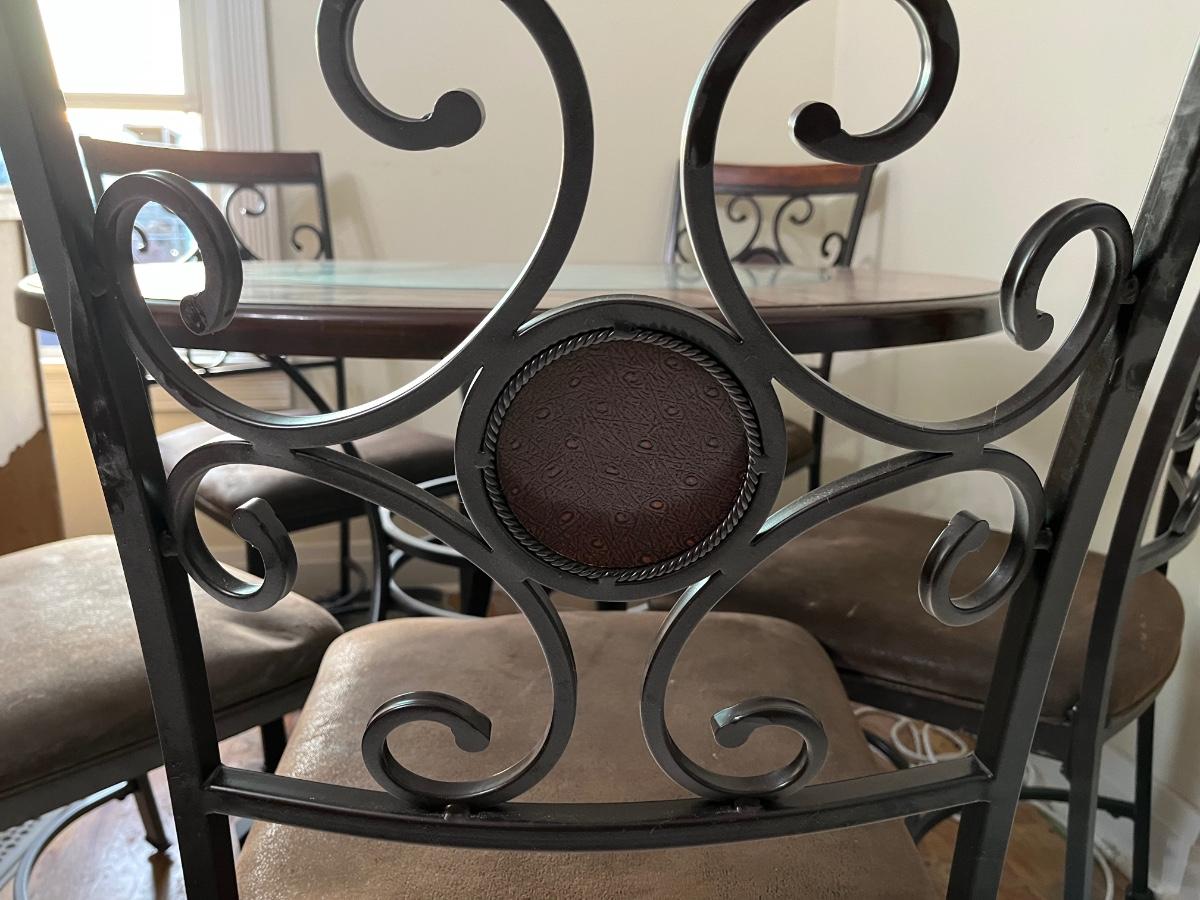 Table has a superficial crack and a visible scratch in it as shown in the pictures. The crack has no impact on the integrity of the table. Padding on chairs is in great condition and are very comfortable.