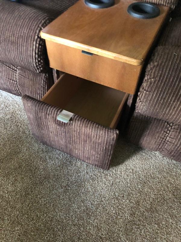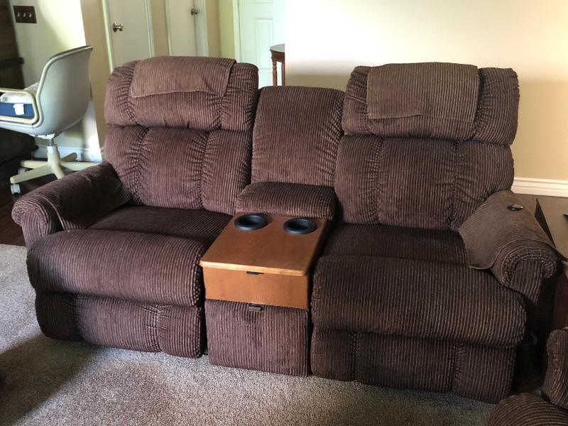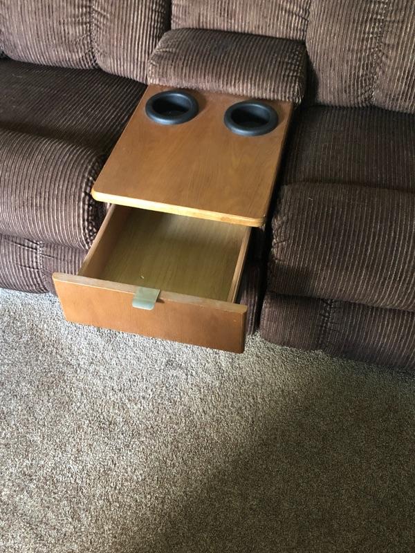 Great Love Seat Combo Couch. Dark Brown fabric. Rocker recliner end seats with a cup holder table center. Manual recline. The table center has two drawers. This is not one solid couch it is 3 separate pieces. Great condition. No odors, stains, holes.